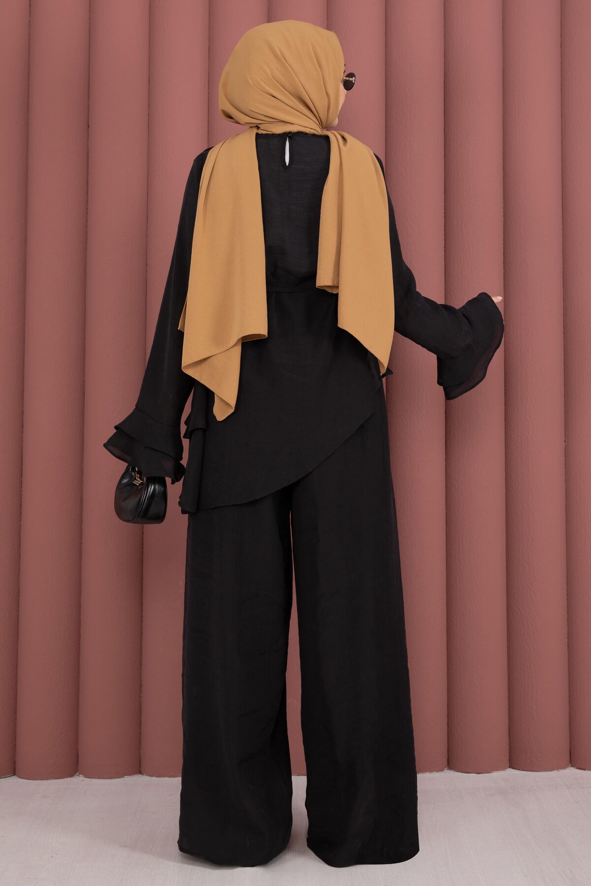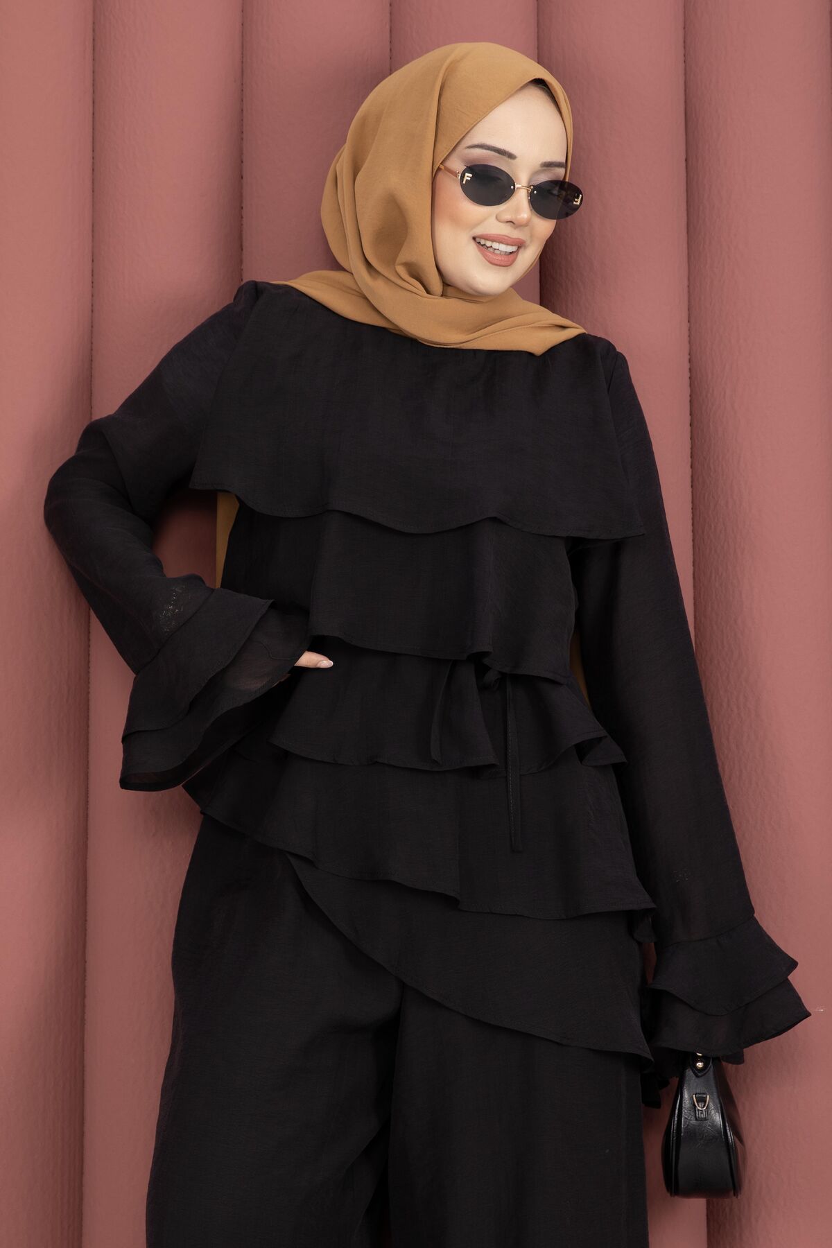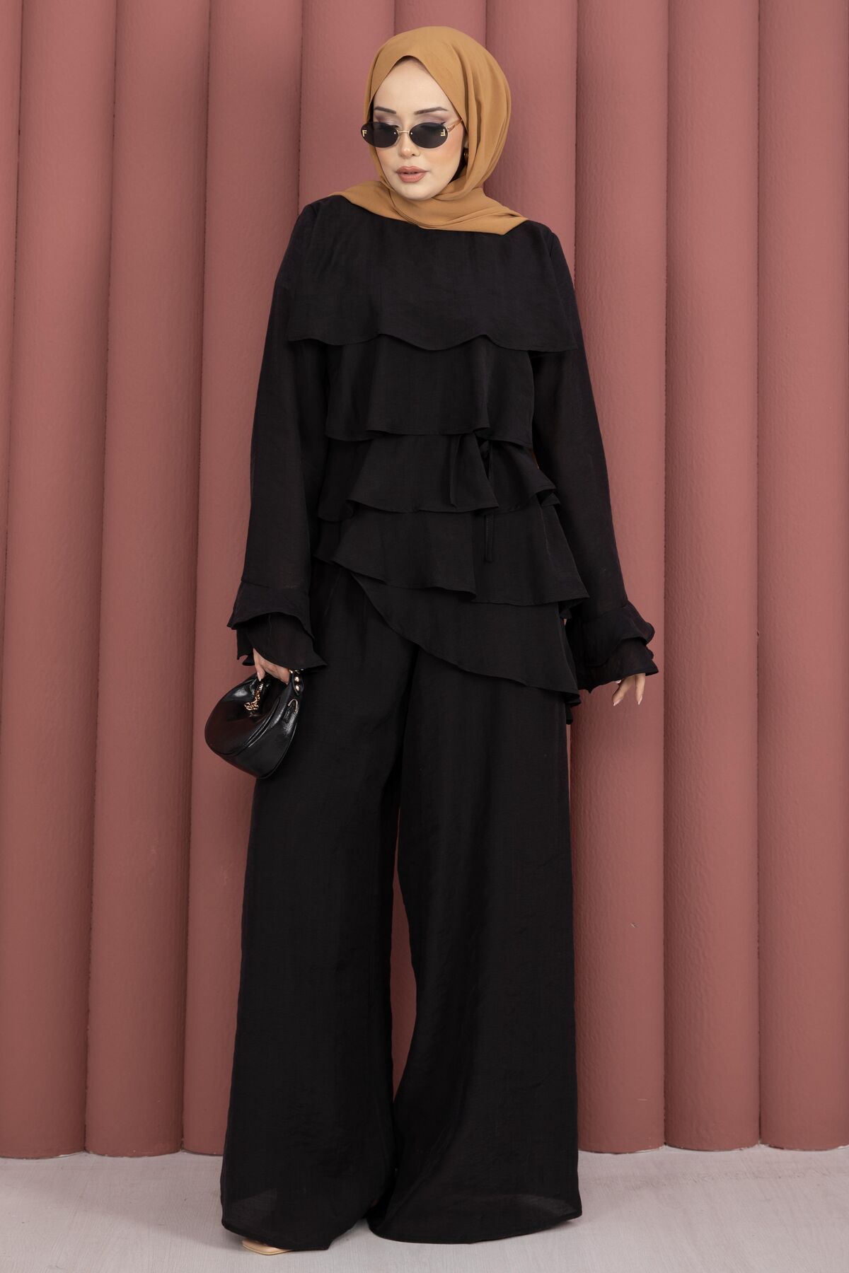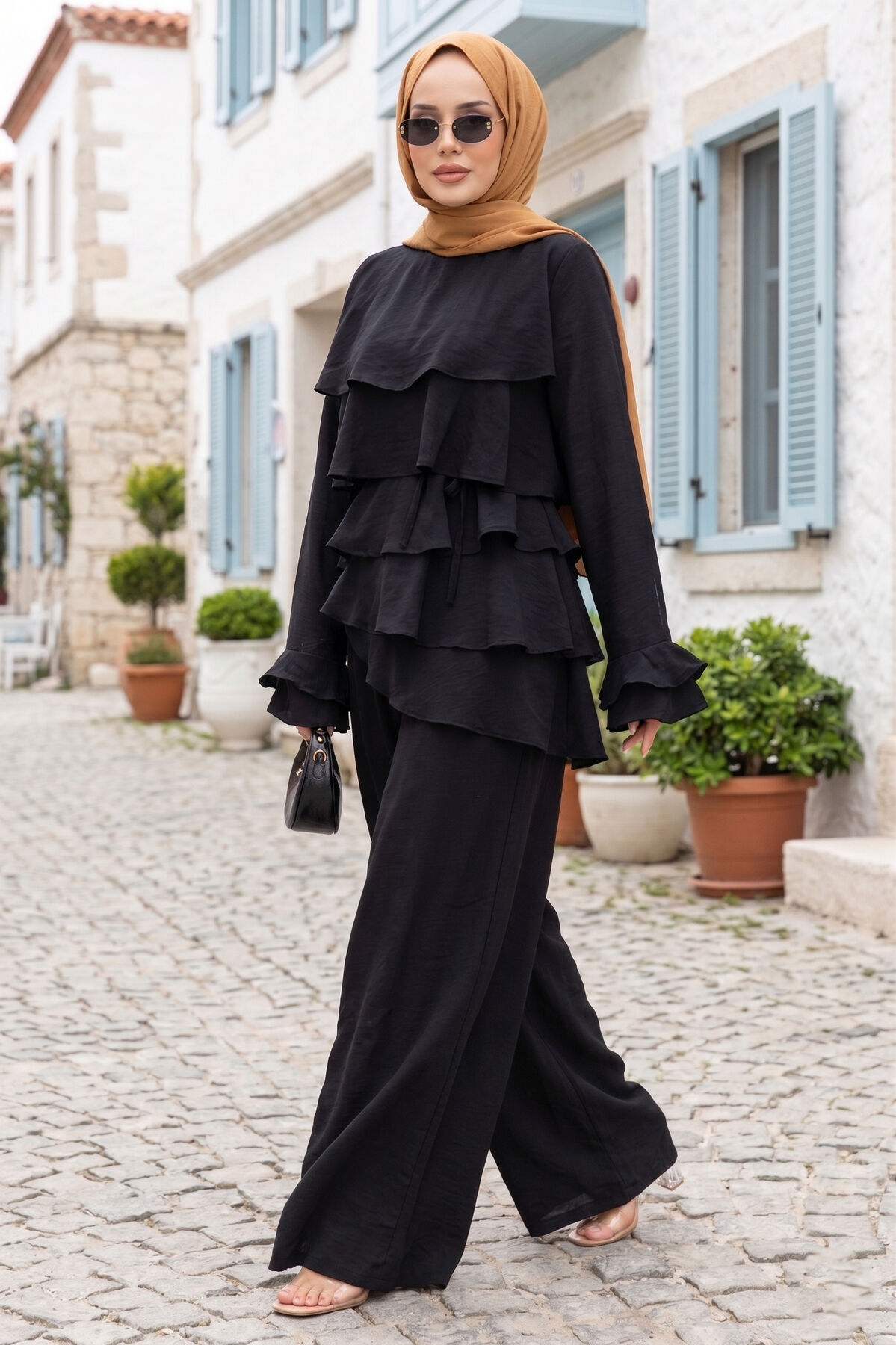 Kat Kat Fırfırlı Tunik Pantolon İkili Takım Siyah