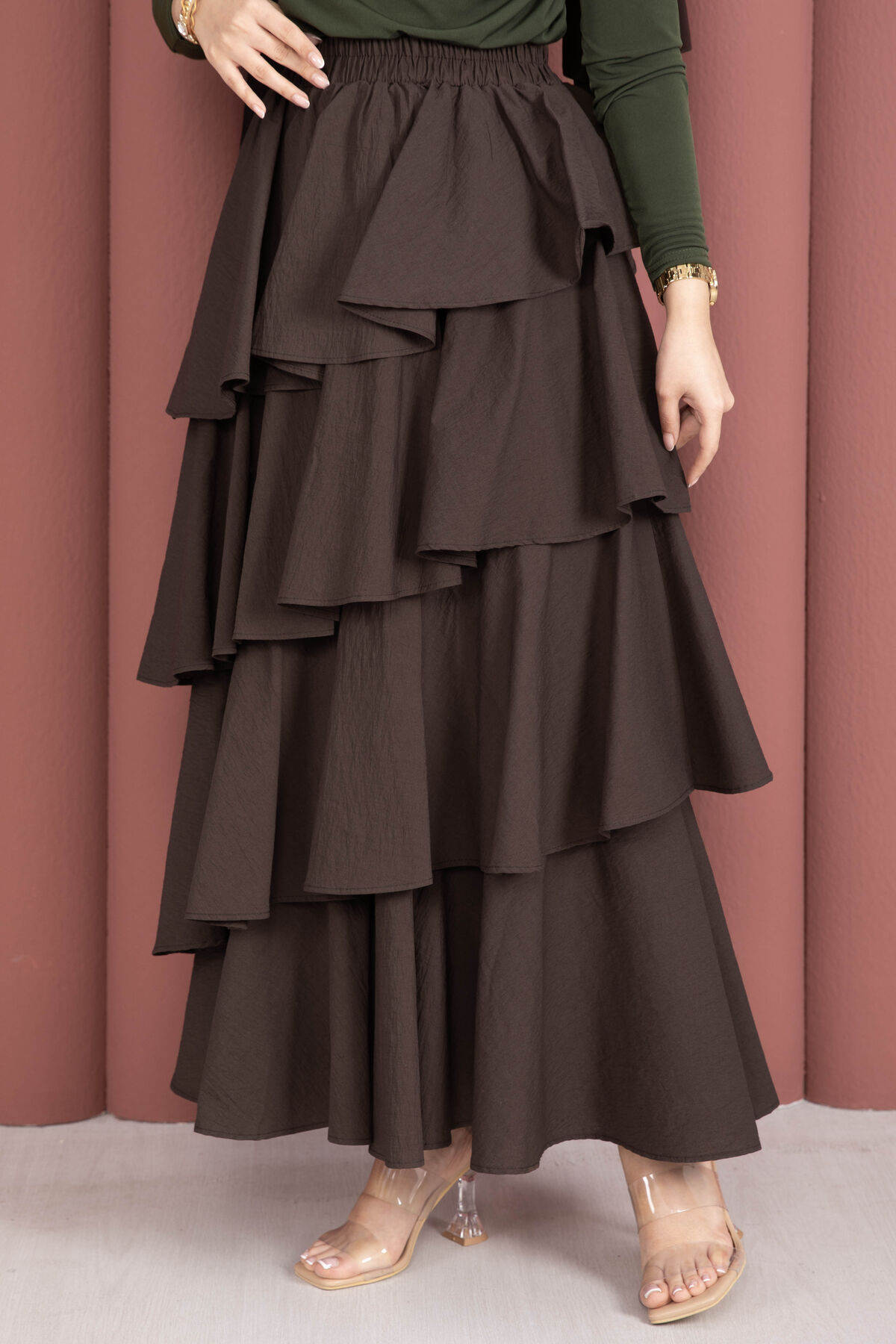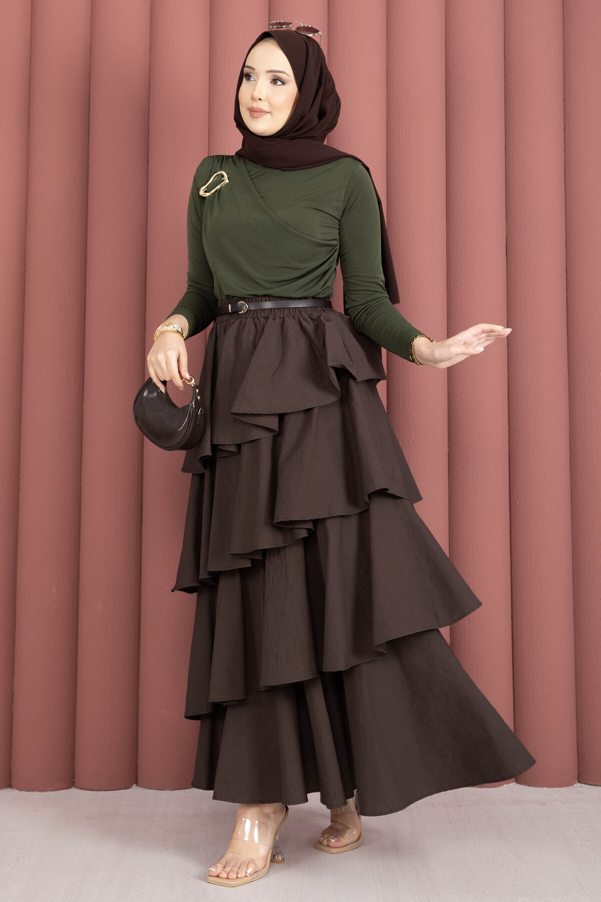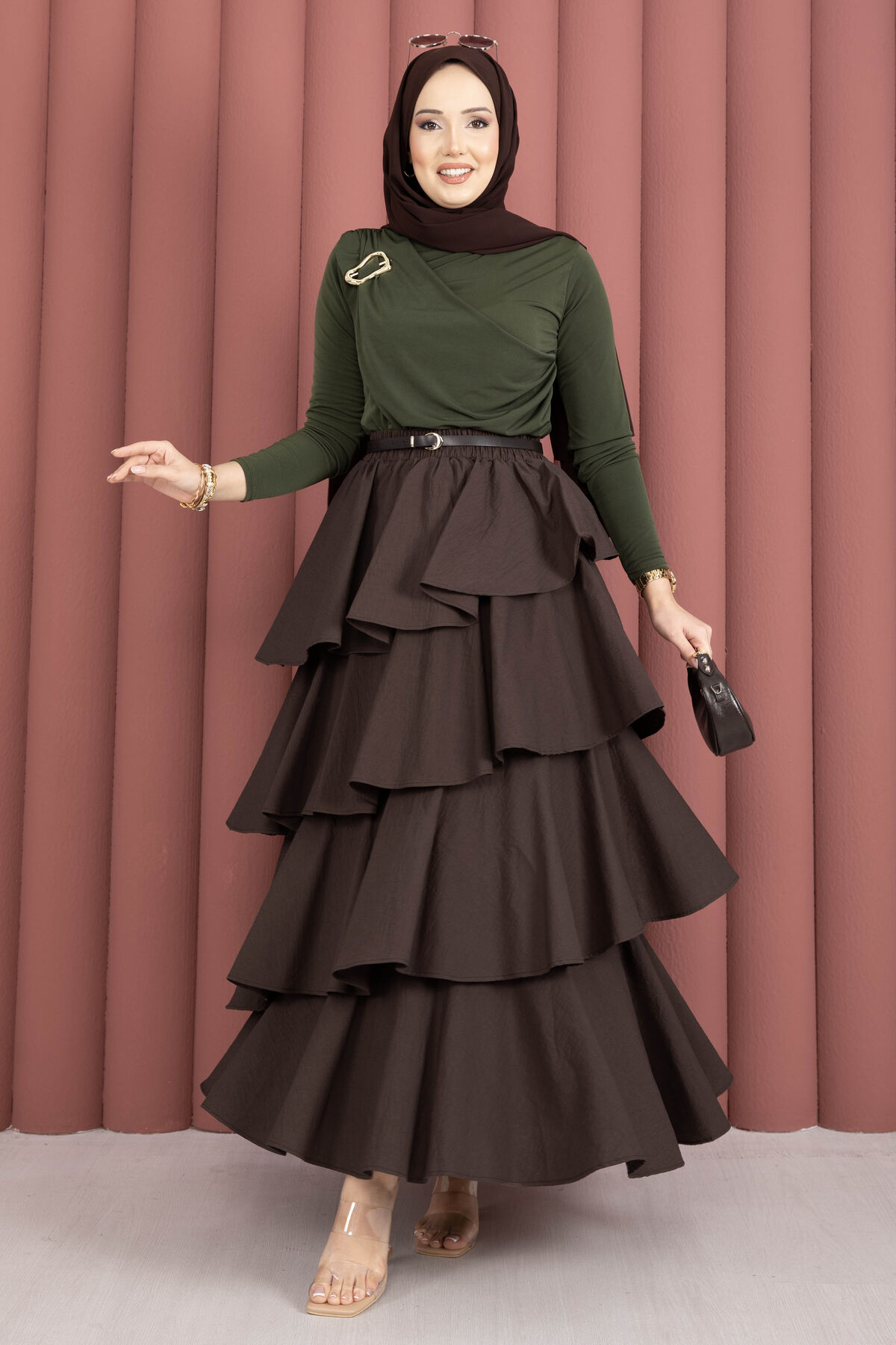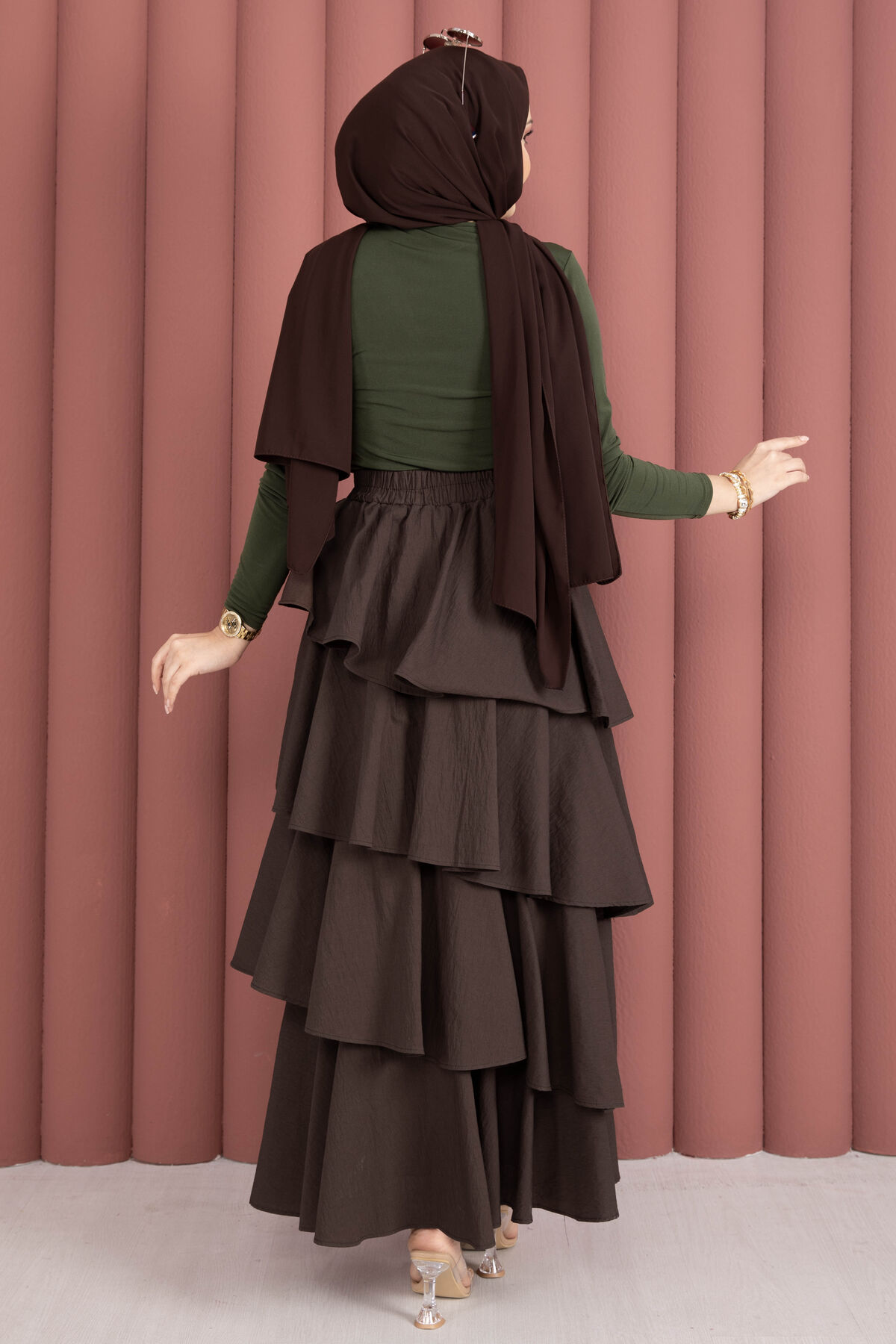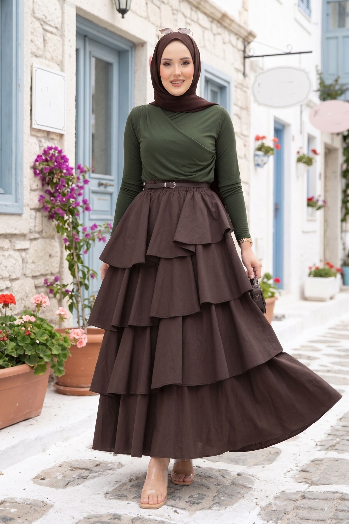 Hafif ve akışkan yapısıyla öne çıkan Kat Kat Volanlı Etek, modern ve feminen duruşu ile günlük kombinlerden özel anlara kadar rahatlıkla tercih edilebilir. Kat kat volan detayları eteğe hareketli ve şık bir görünüm kazandırırken, modal kumaşın yumuşak dokusu gün boyu konfor sağlar. Beli lastikli yapısı sayesinde vücuda kolayca uyum sağlar ve rahat bir kullanım sunar.