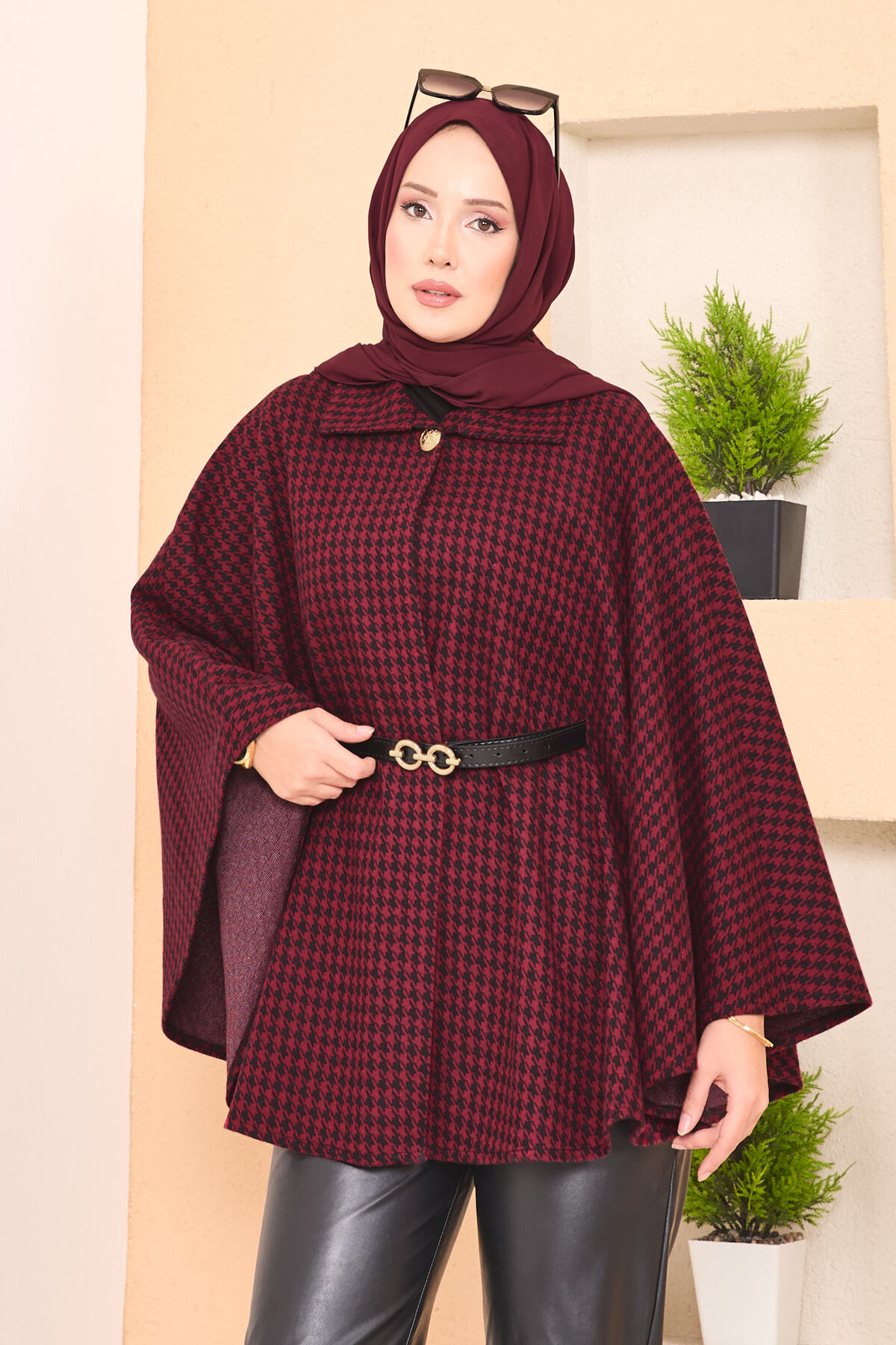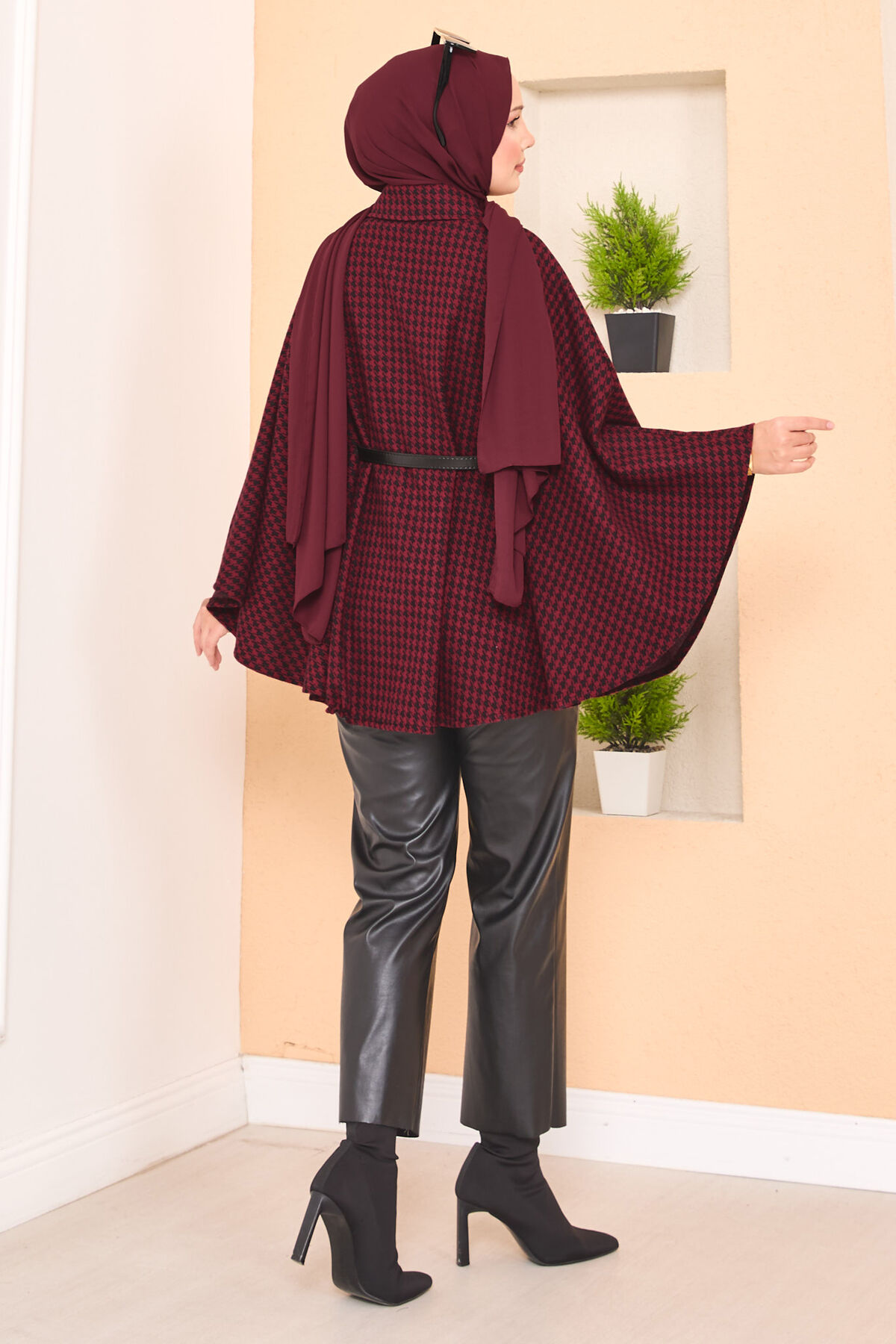 Kazayağı Desenli Kemerli Tesettür Panço Bordo