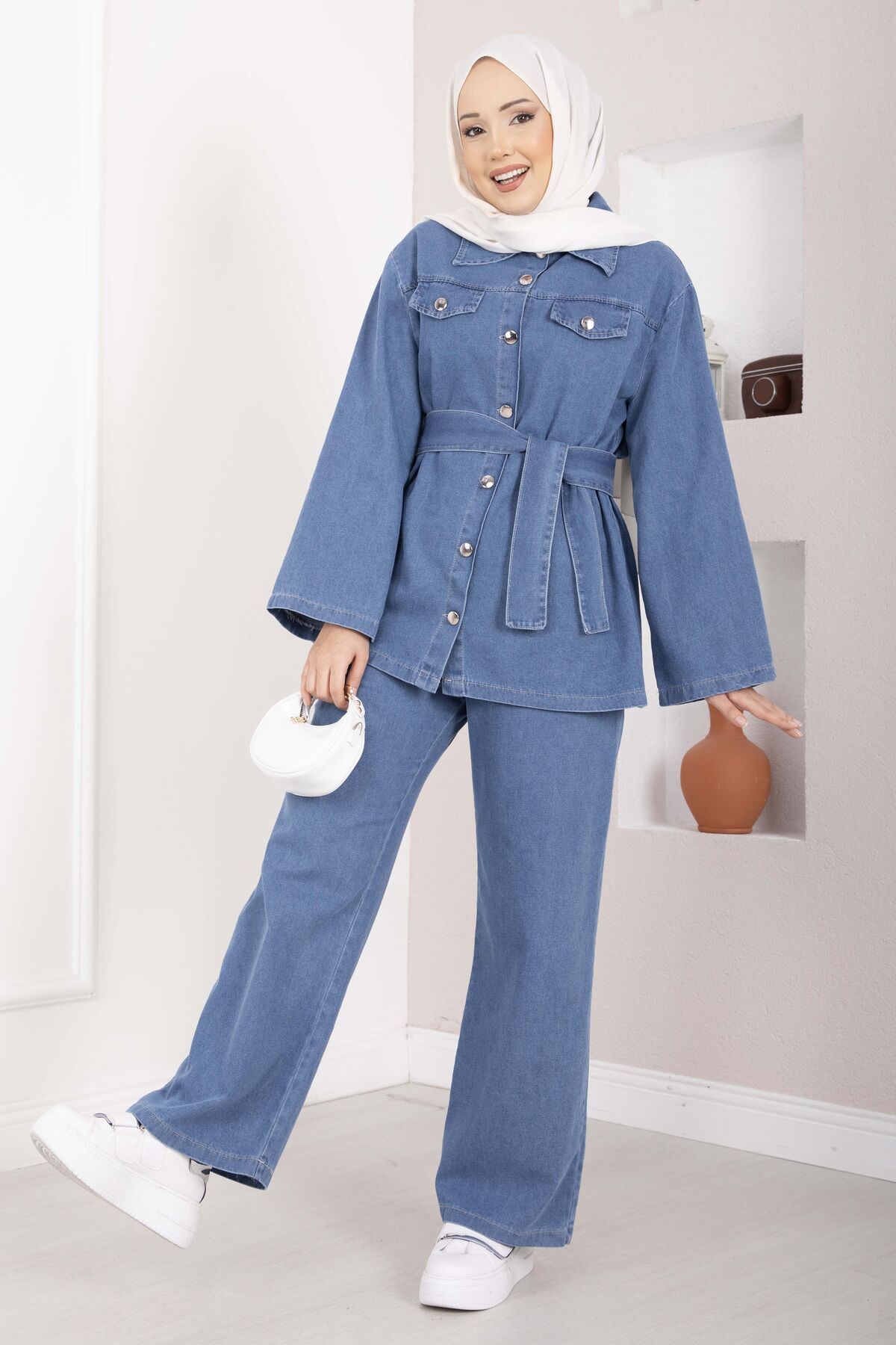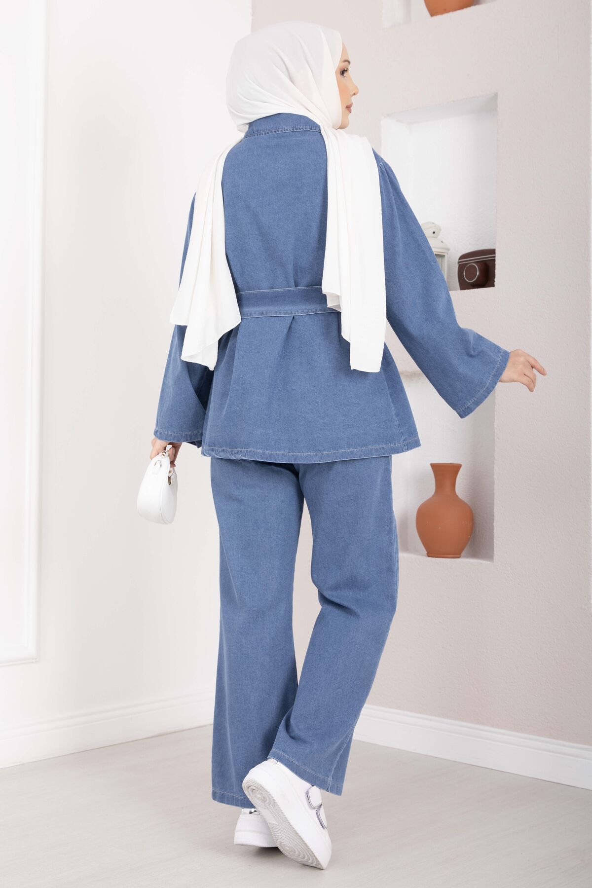 Kemer Detaylı Ceket Pantolon Kot Takım