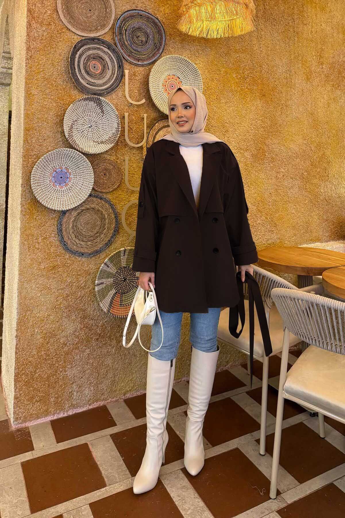 Kemerli Apolet Detaylı Premium Trençkot Kahve