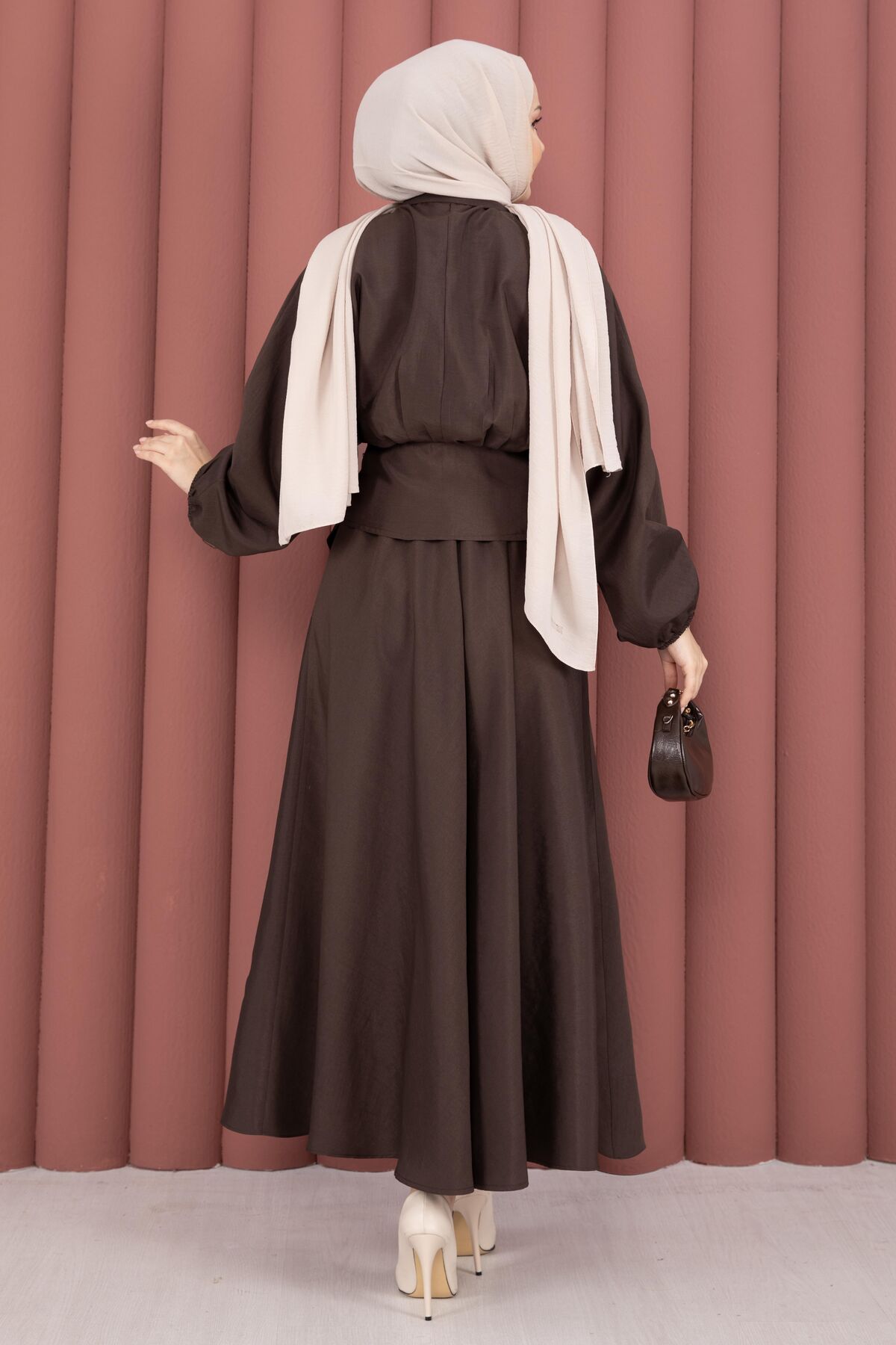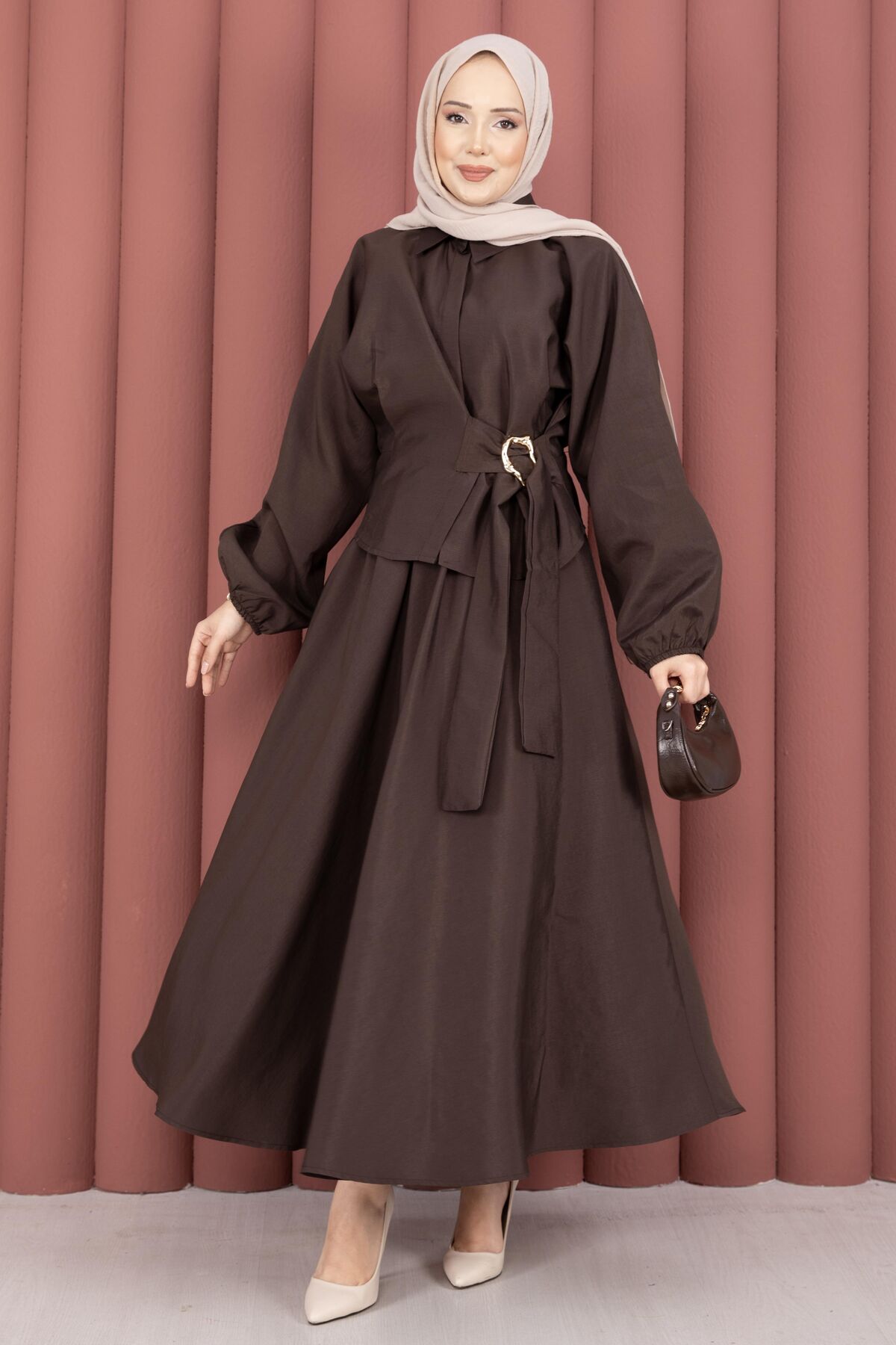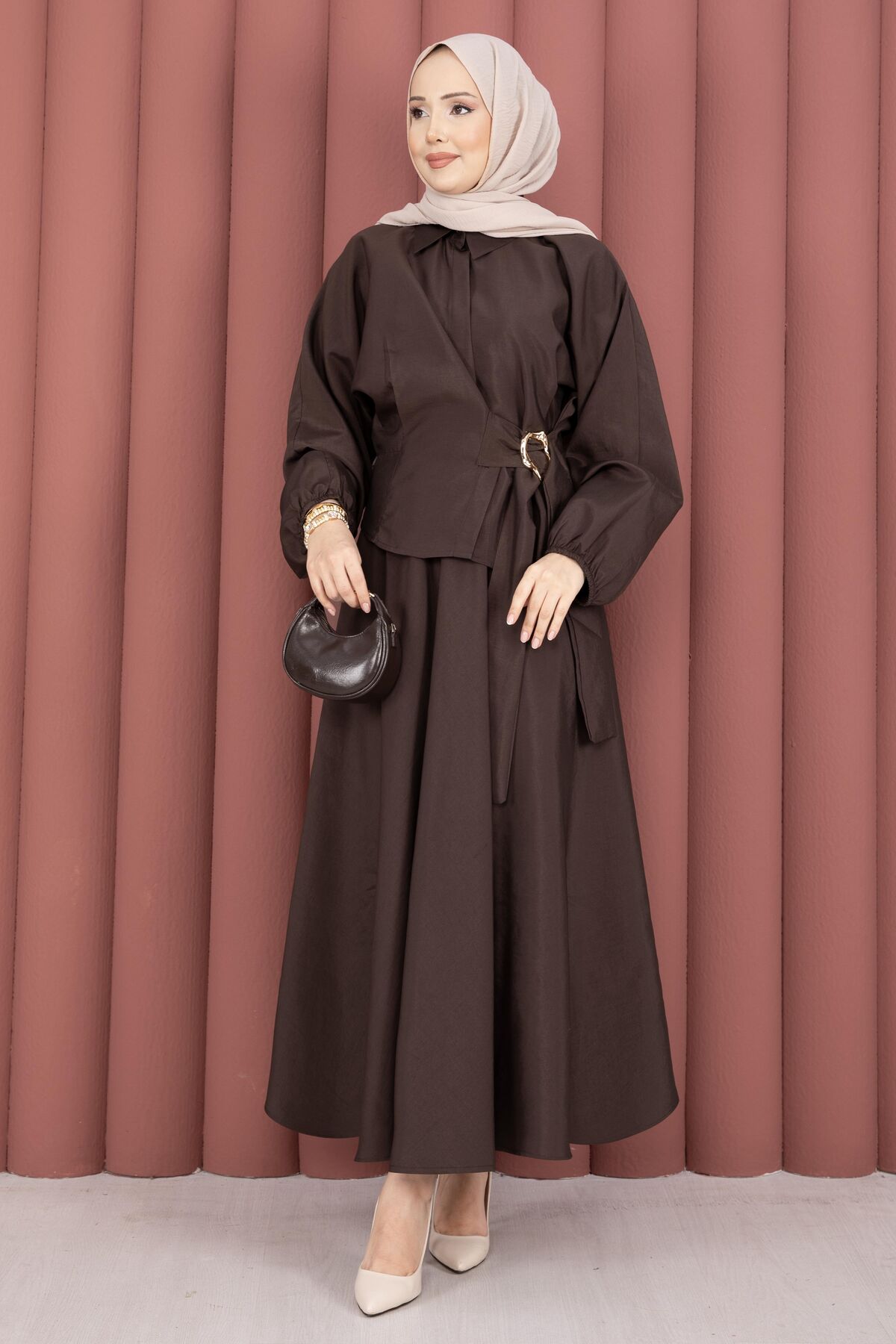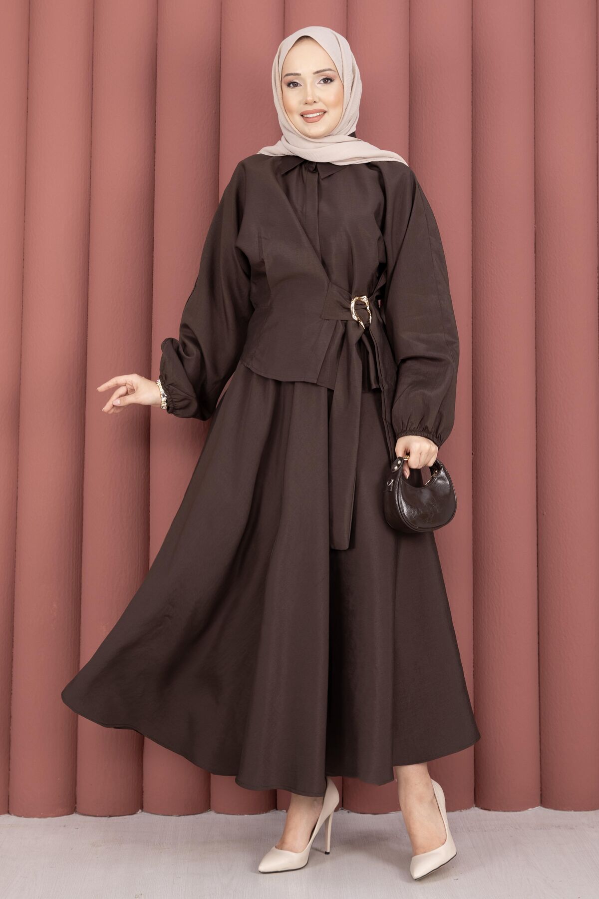 Kendinden Kuşaklı Toka Detaylı Etekli İkili Takım Kahve