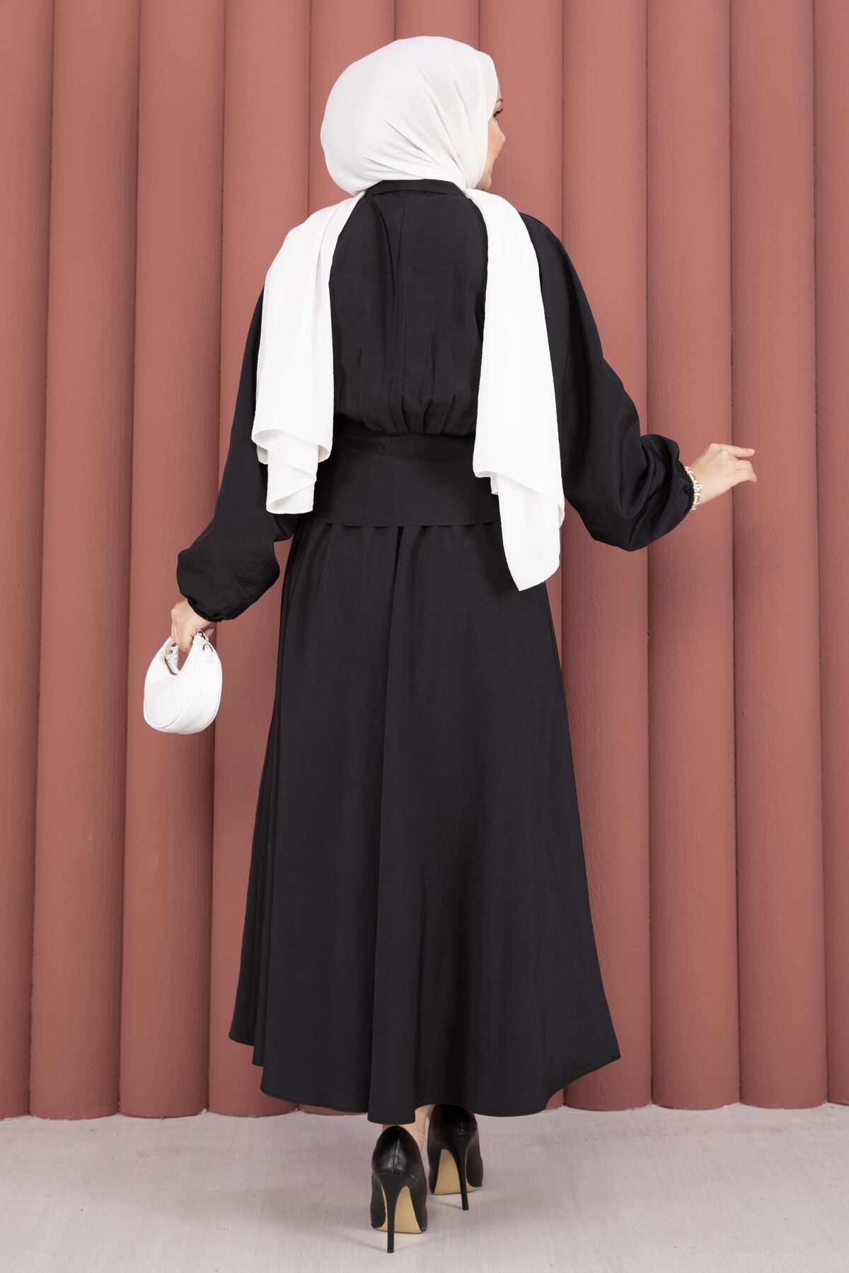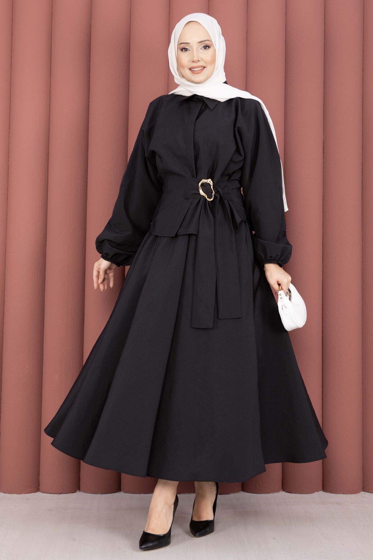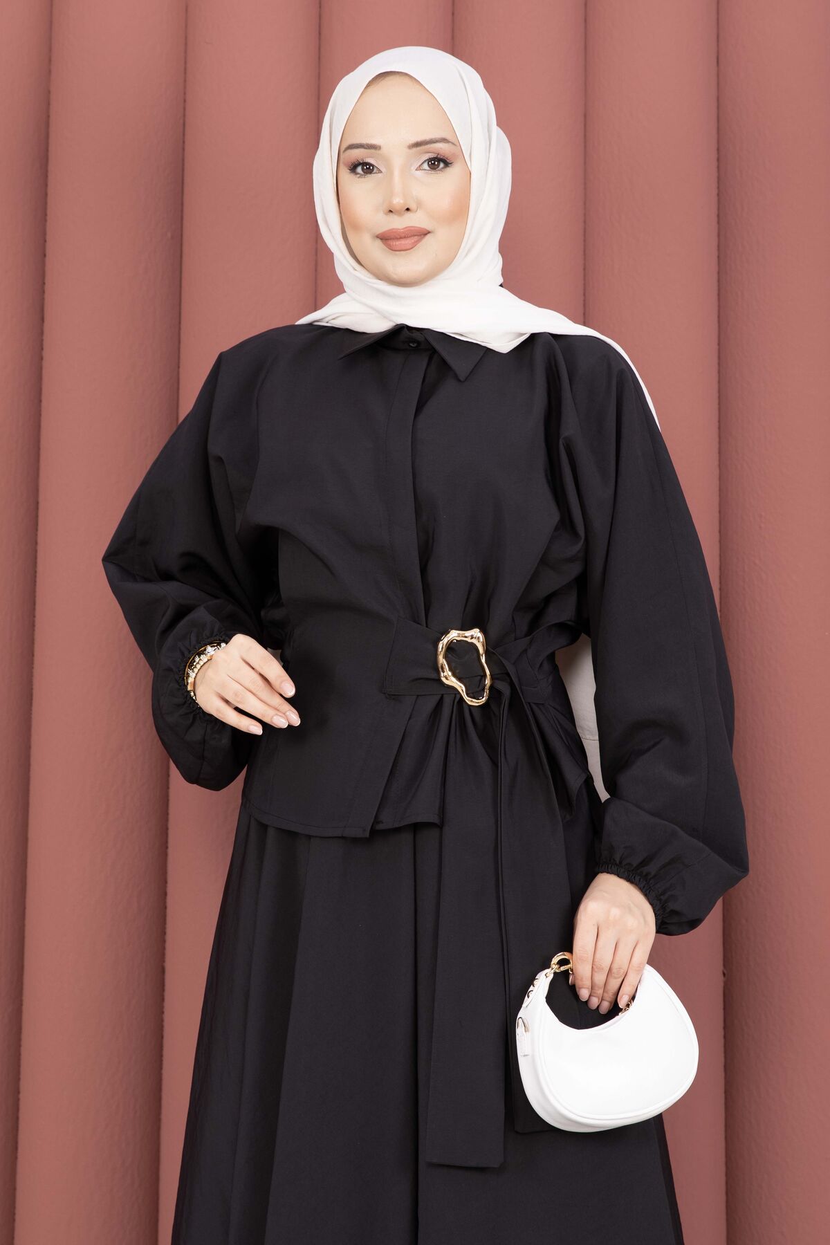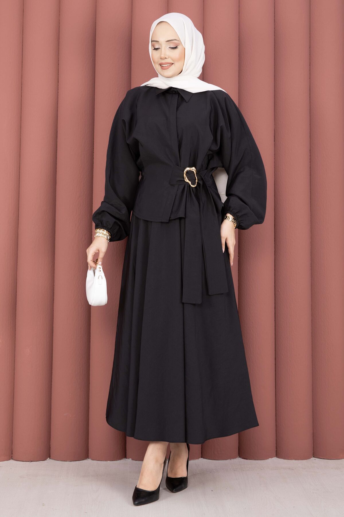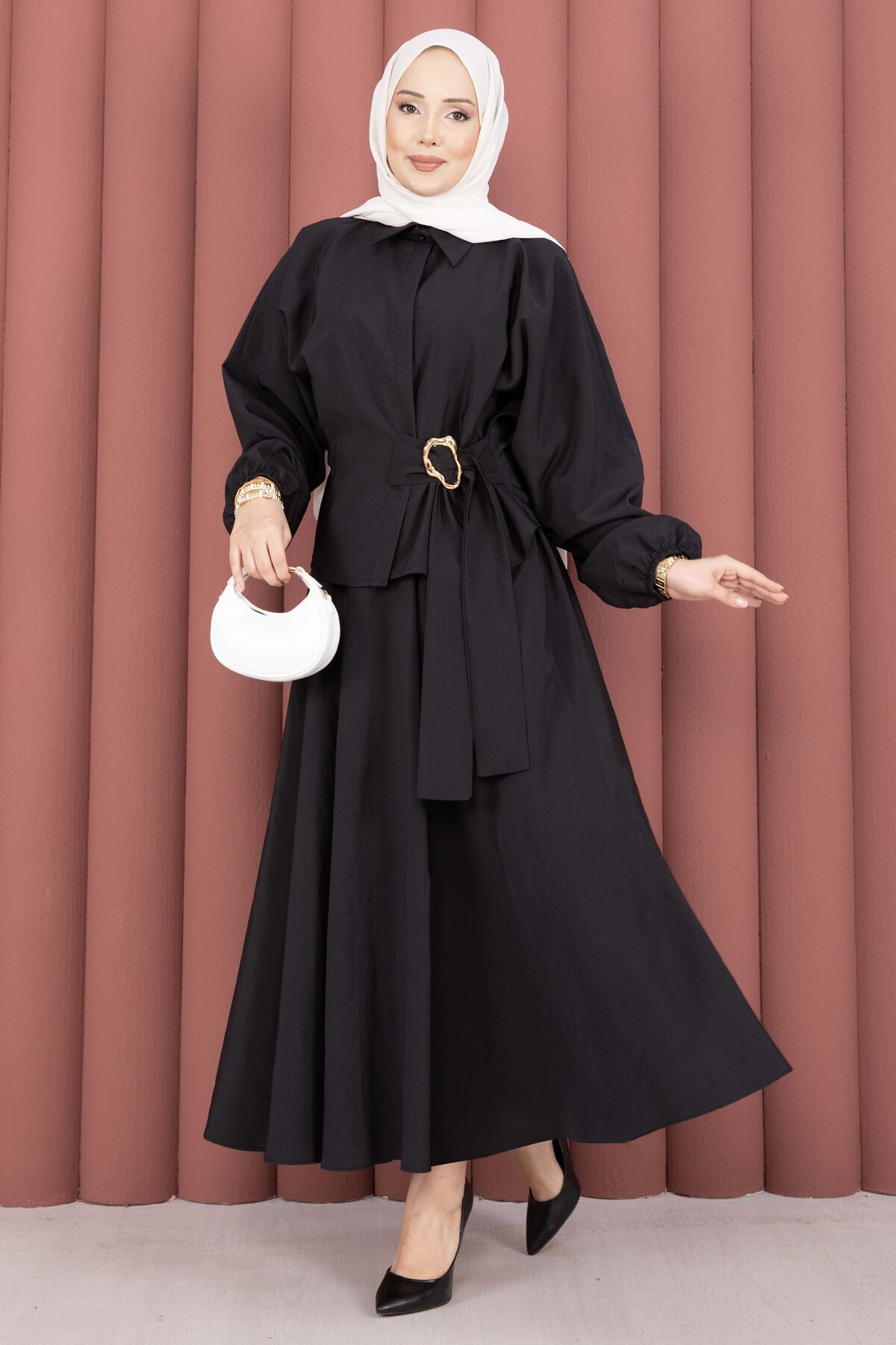 Kendinden Kuşaklı Toka Detaylı Etekli İkili Takım Siyah