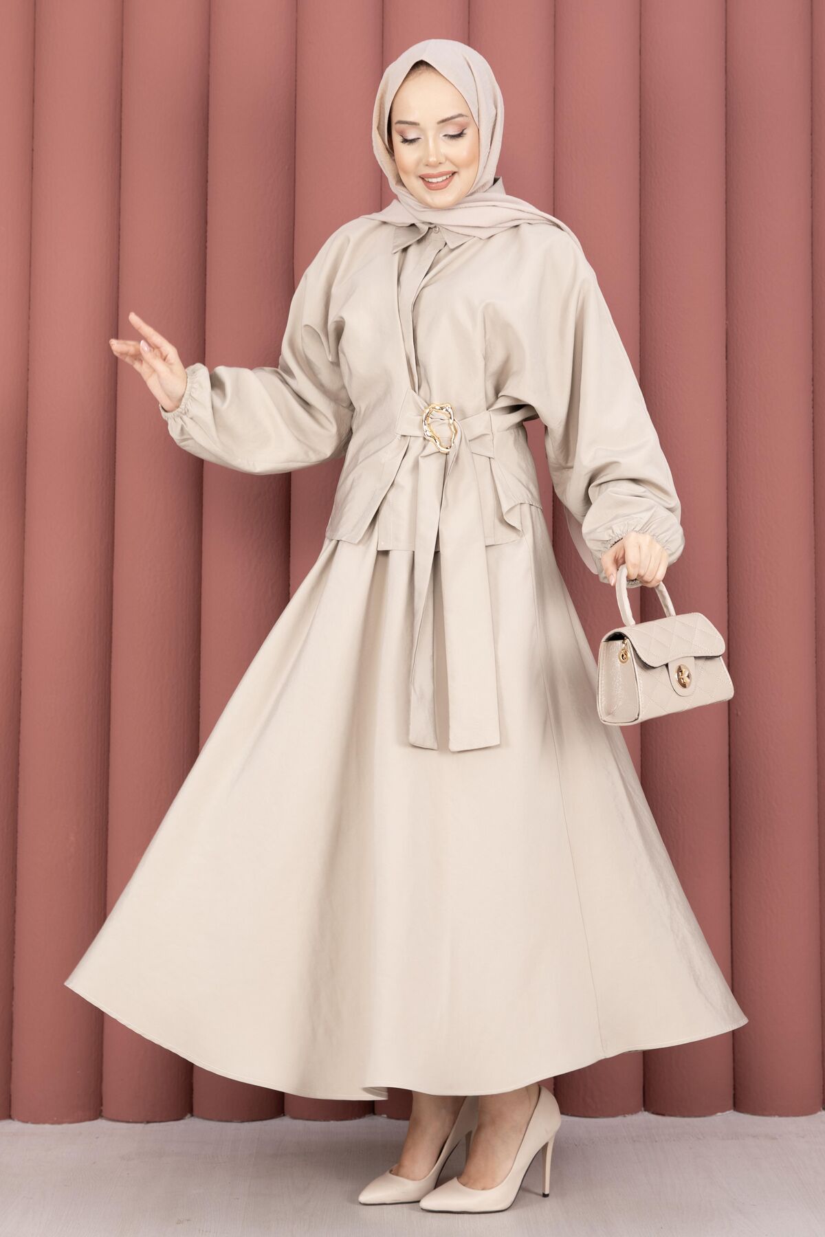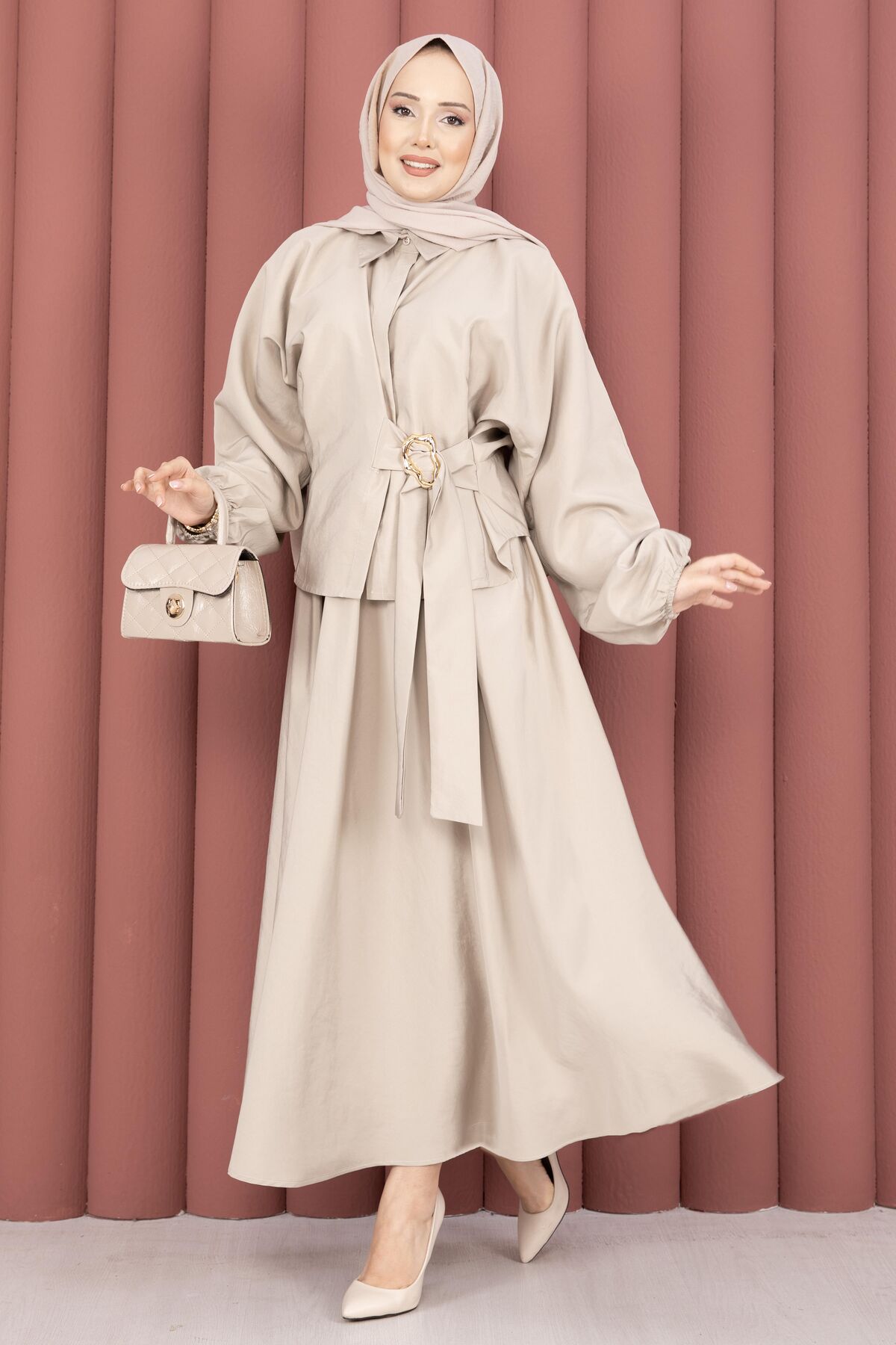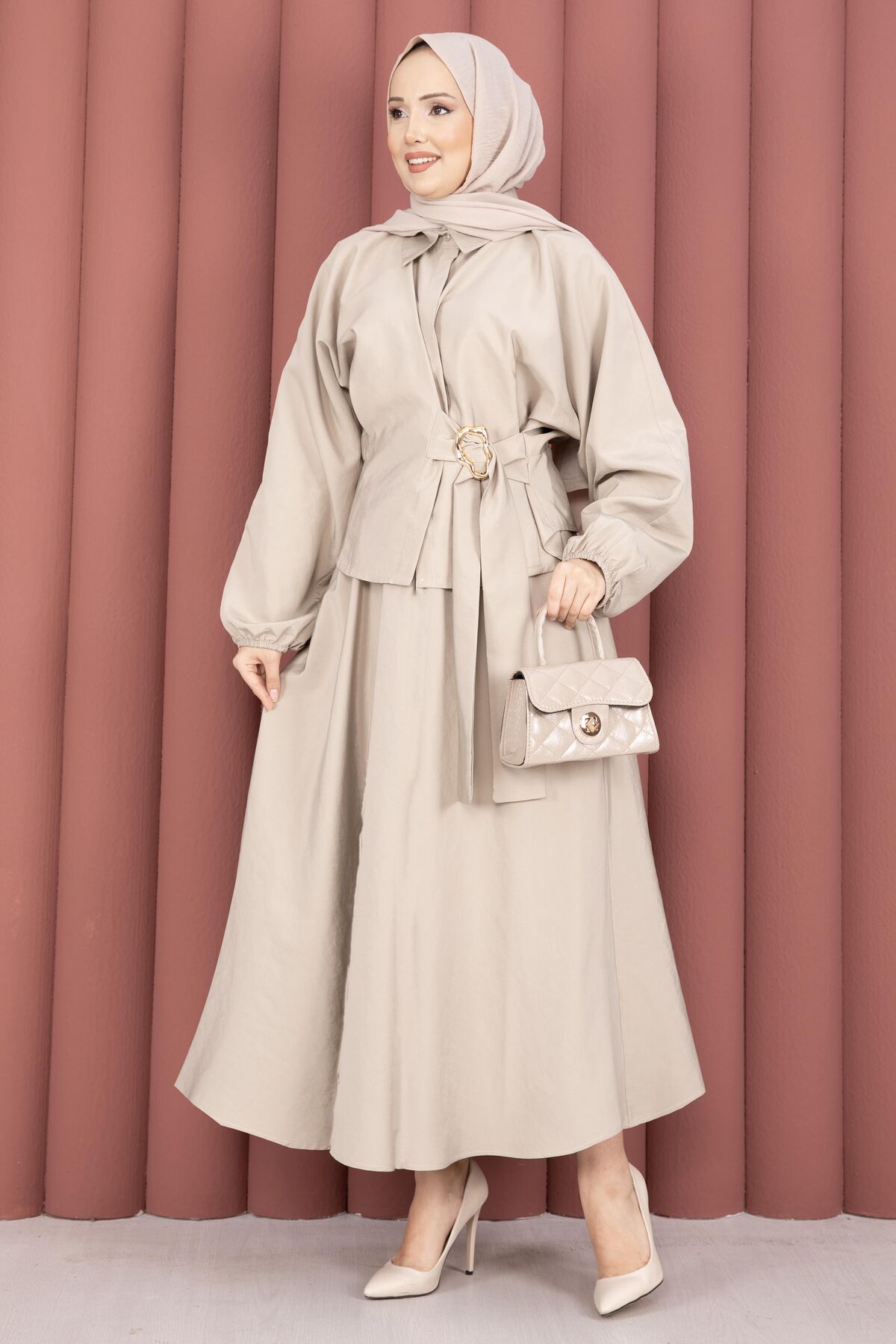 KENDİNDEN KUŞAKLI TOKA DETAYLI ETEKLİ İKİLİ TAKIM