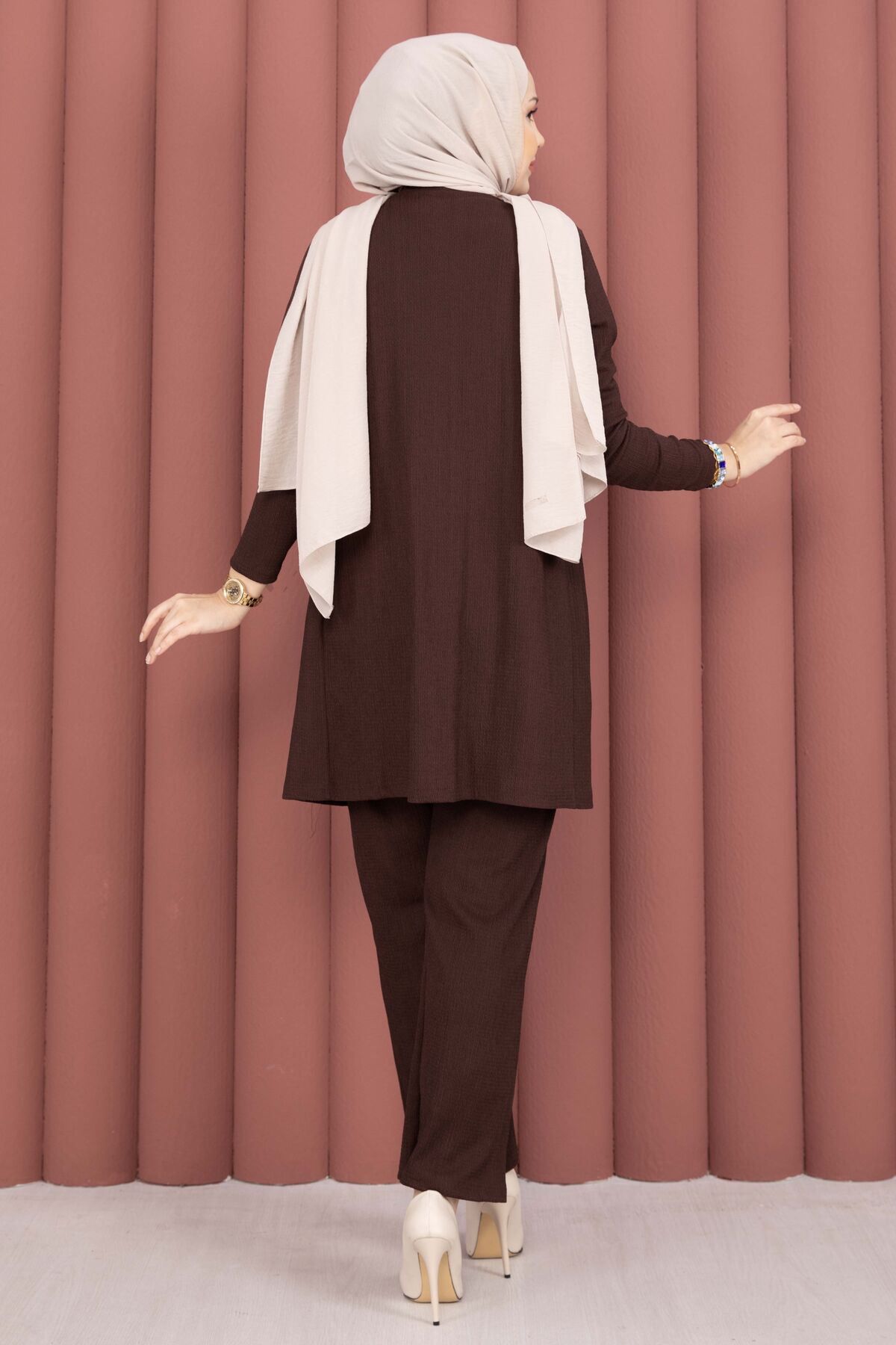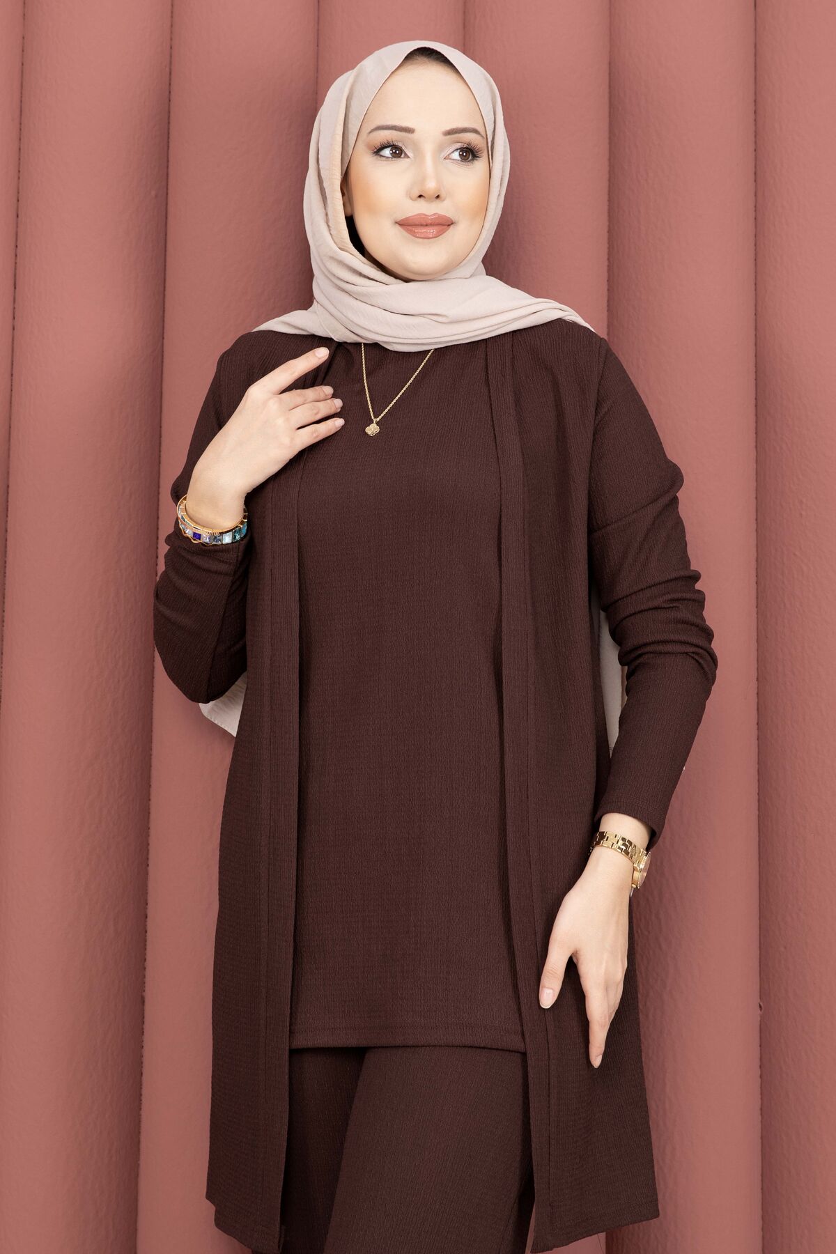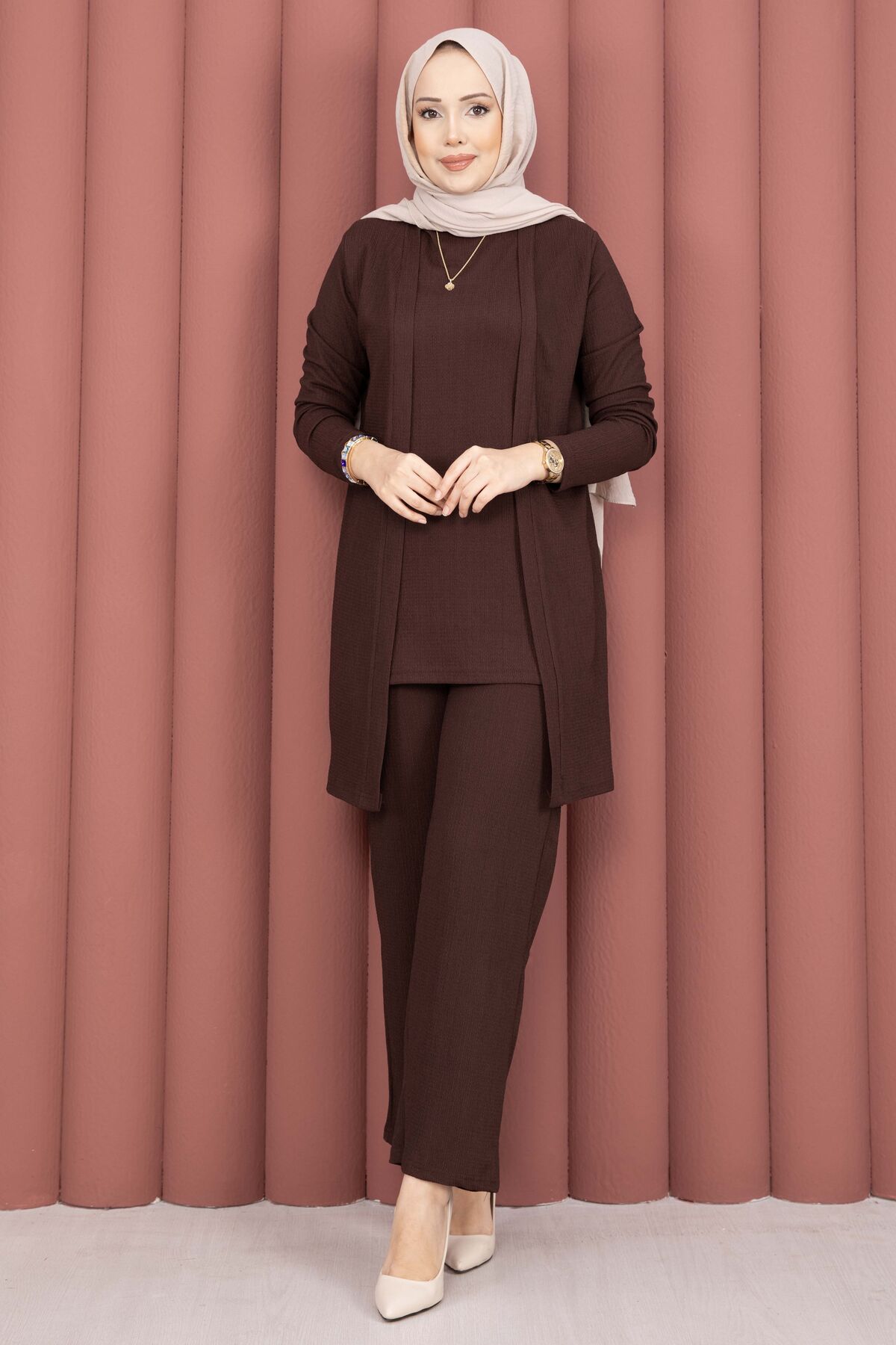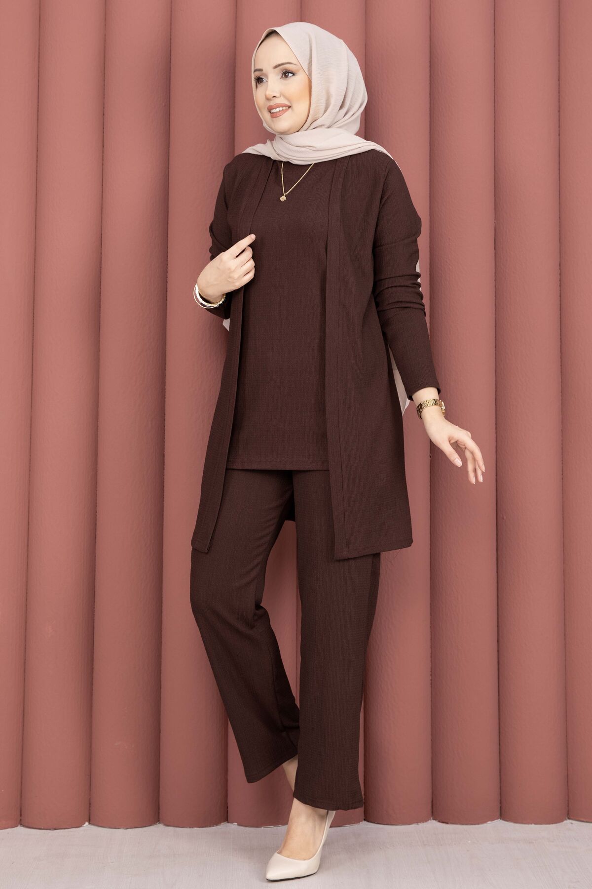 Kimonolu Tesettür Üçlü Takım Kahve