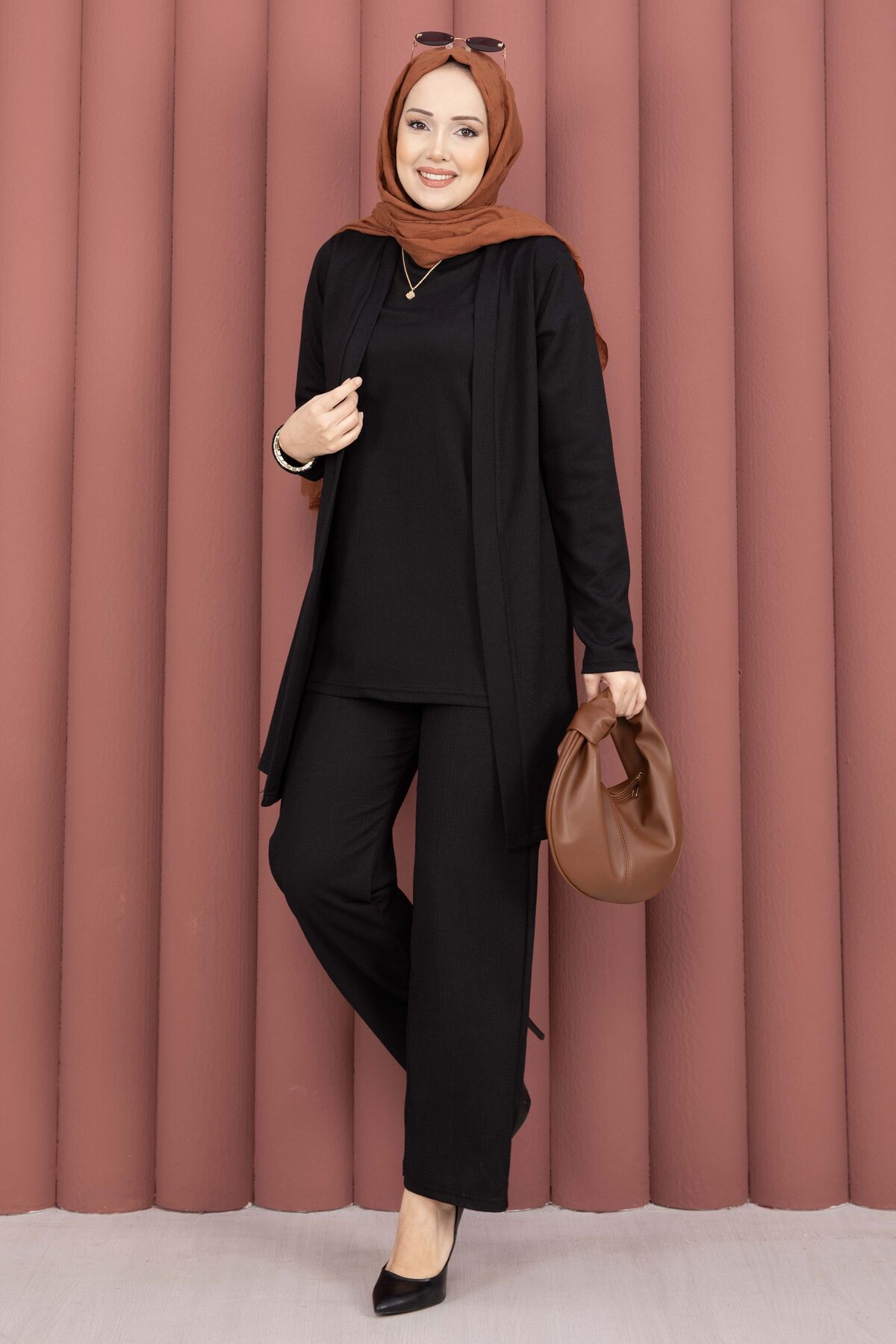 Kimonolu Tesettür Üçlü Takım Siyah
