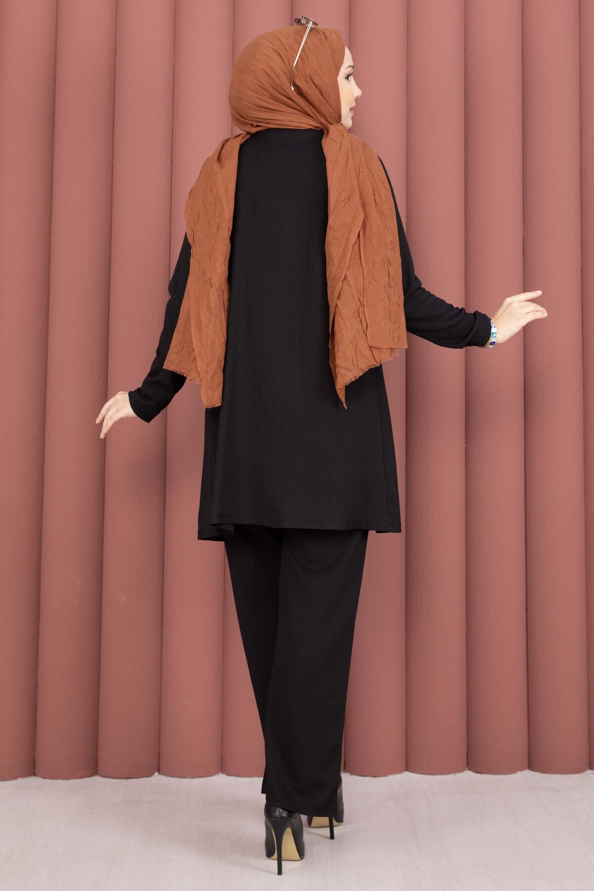 Şık ve rahat tasarımıyla öne çıkan bu üçlü takım; kimono, iç tunik ve pantolondan oluşmaktadır. Bürümcük kumaş yapısı sayesinde hafif ve konforlu bir kullanım sunar. Günlük kullanıma uygun yapısıyla hem rahat hem de zarif bir görünüm sağlar.