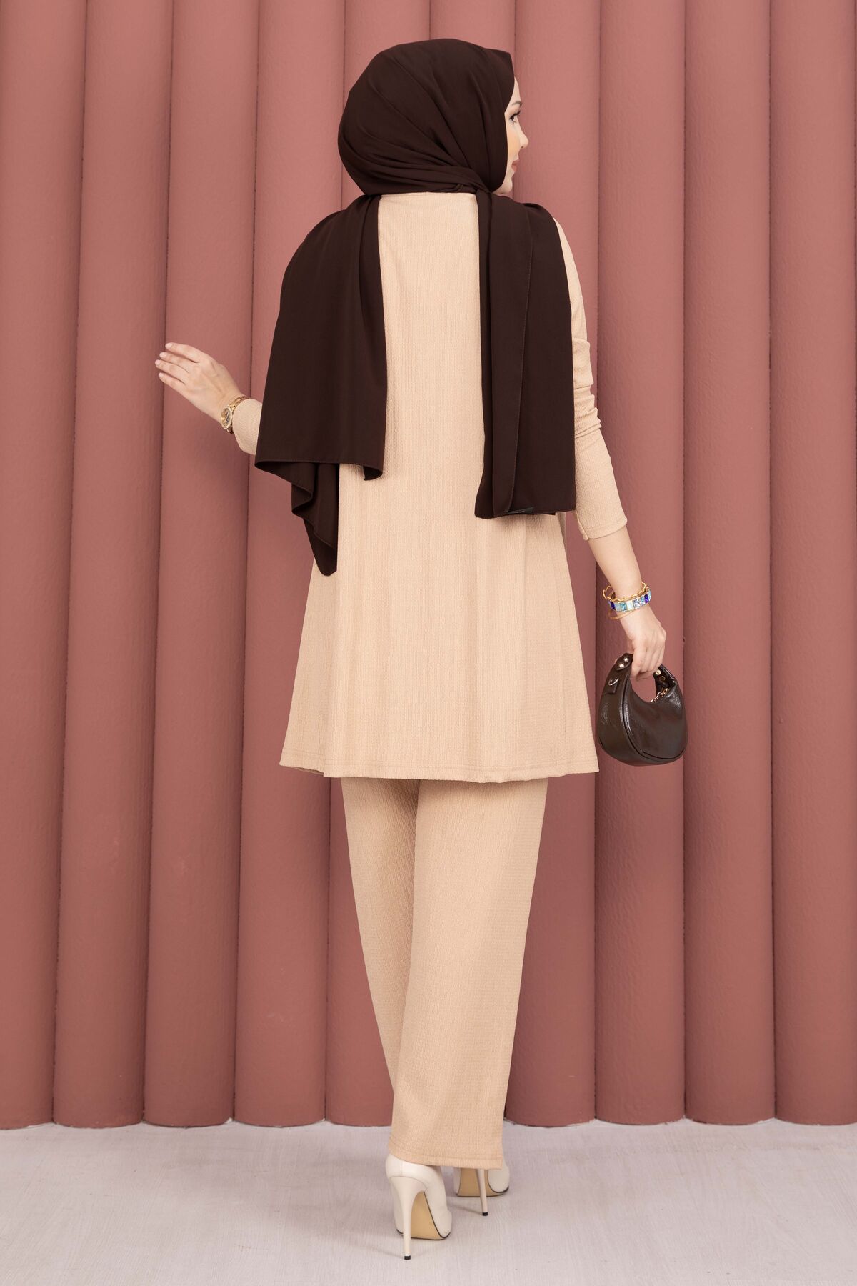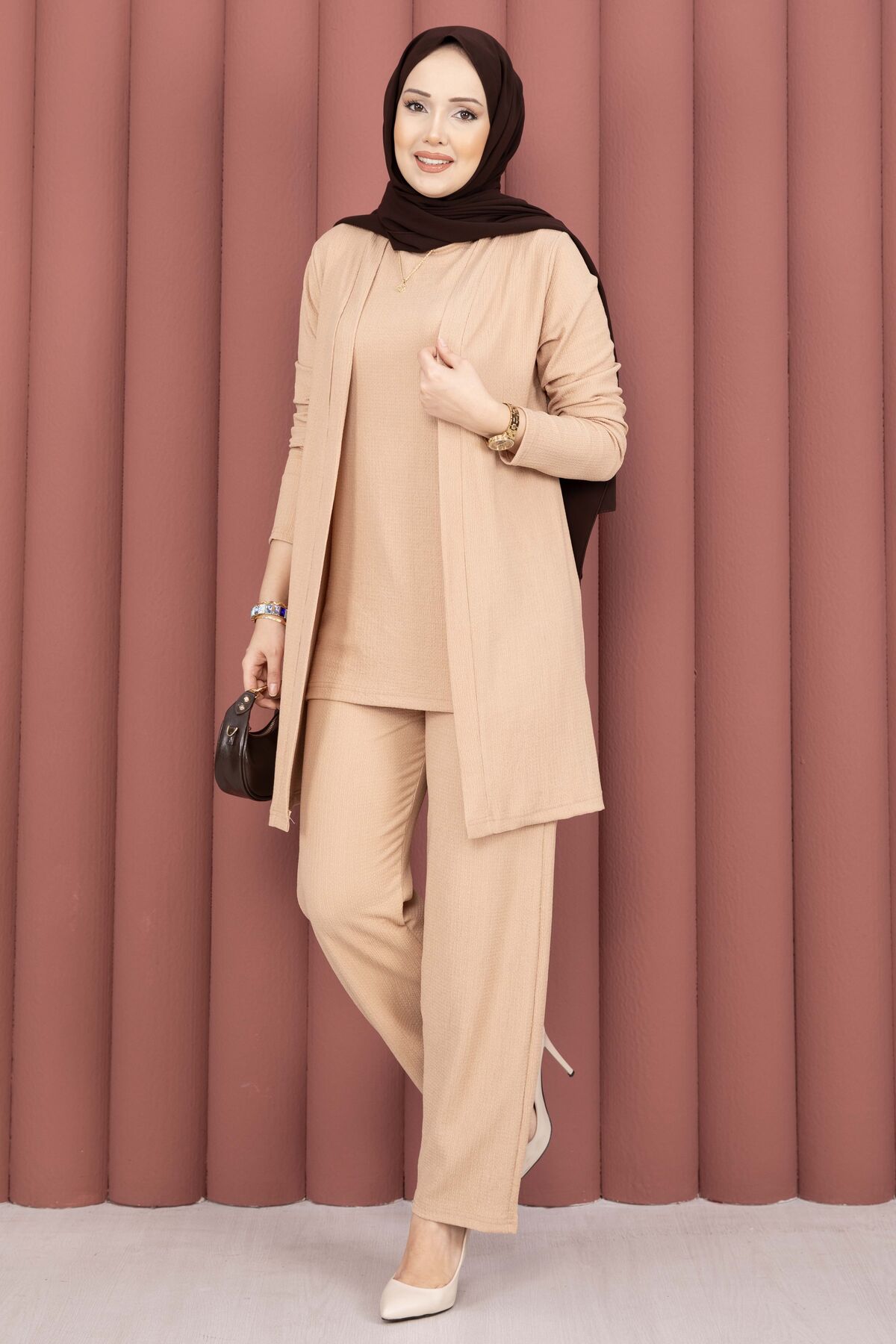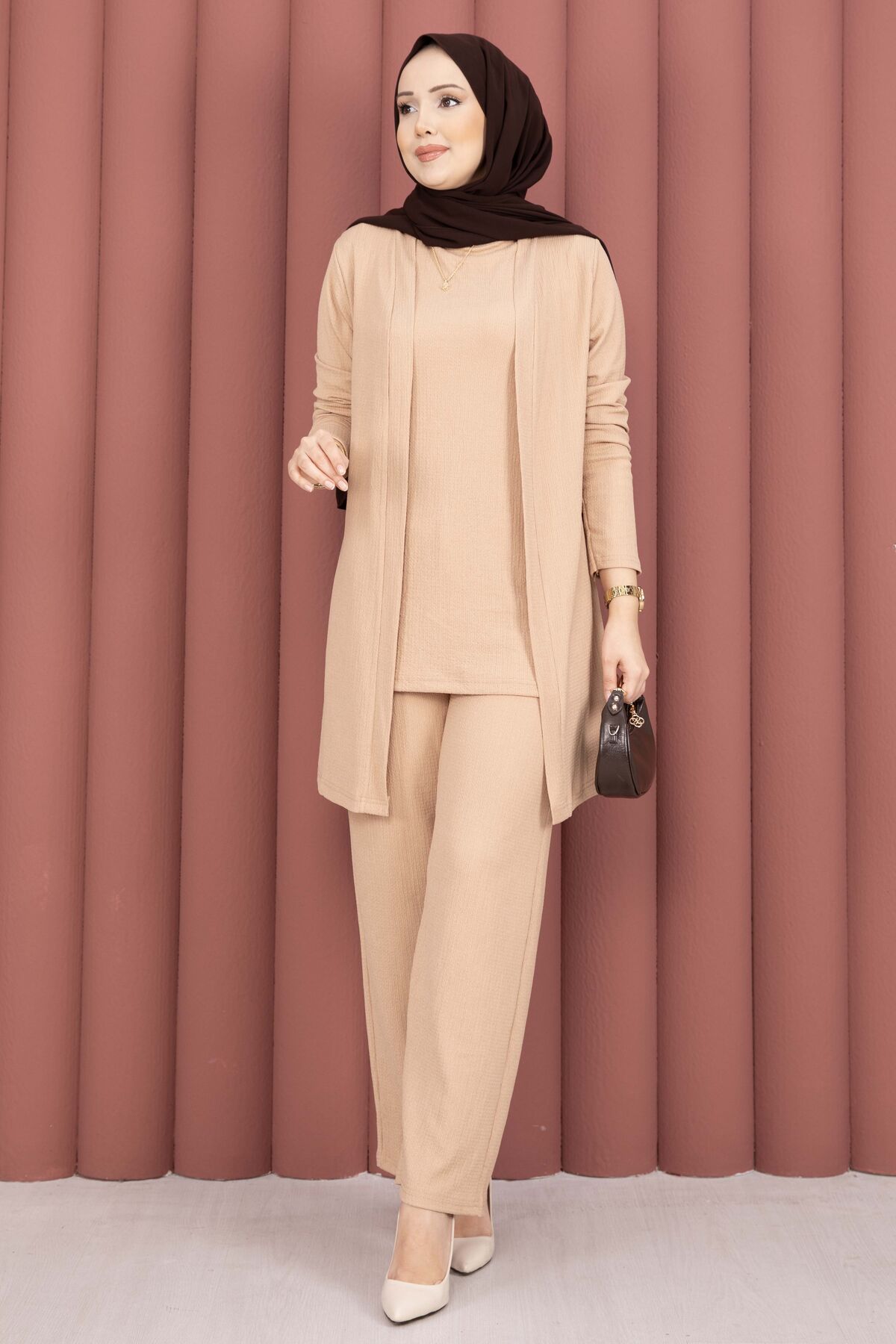 Kimonolu Tesettür Üçlü Takım Vizon