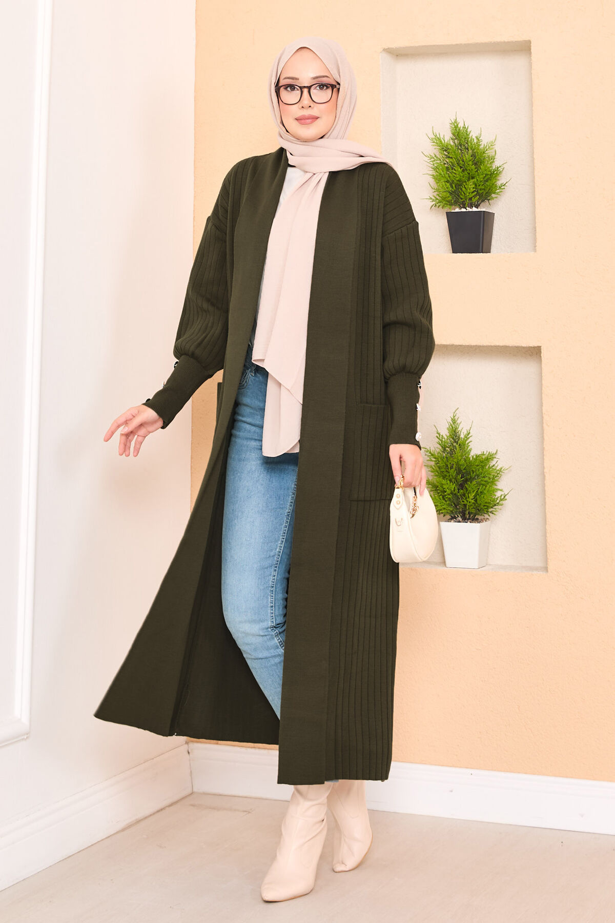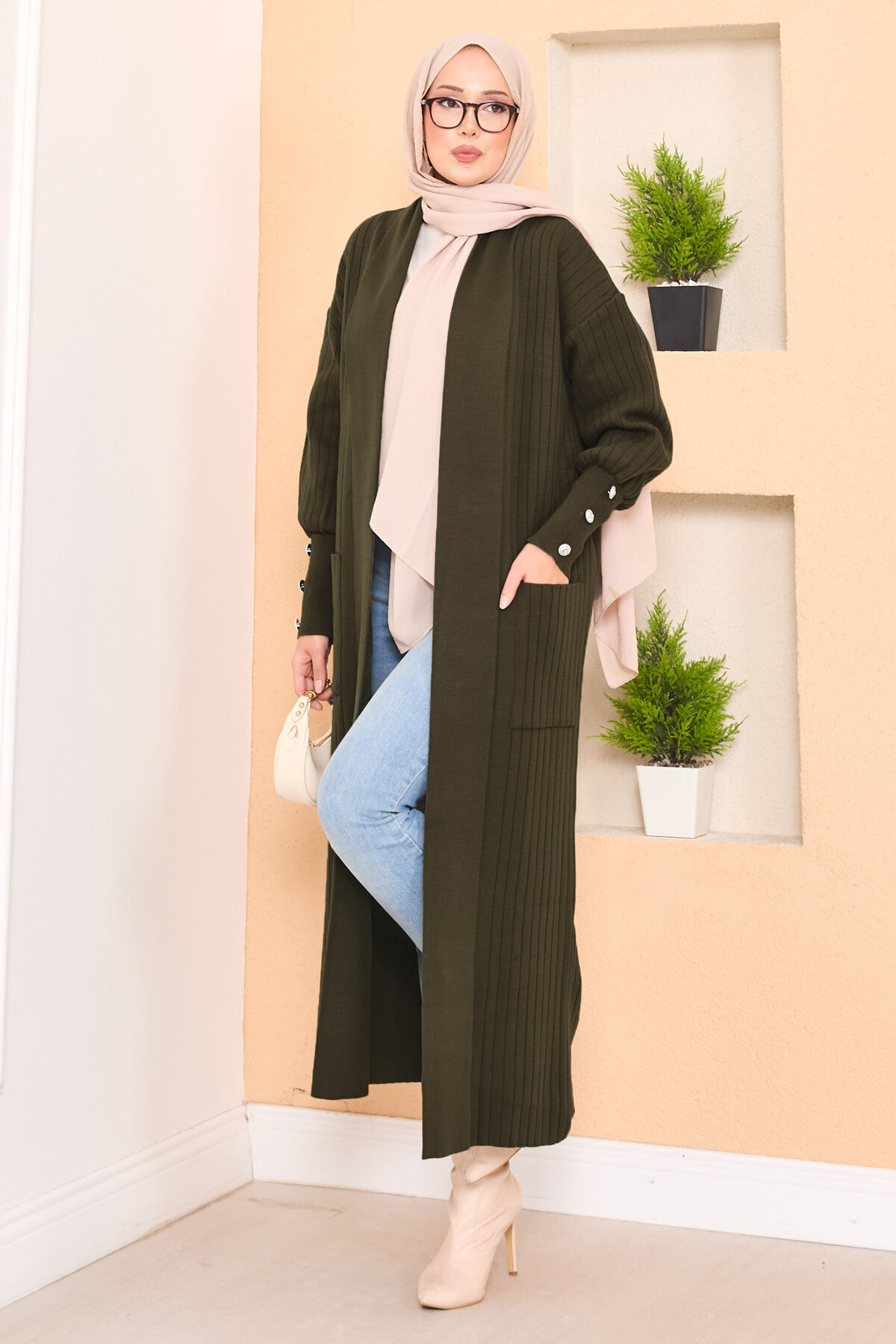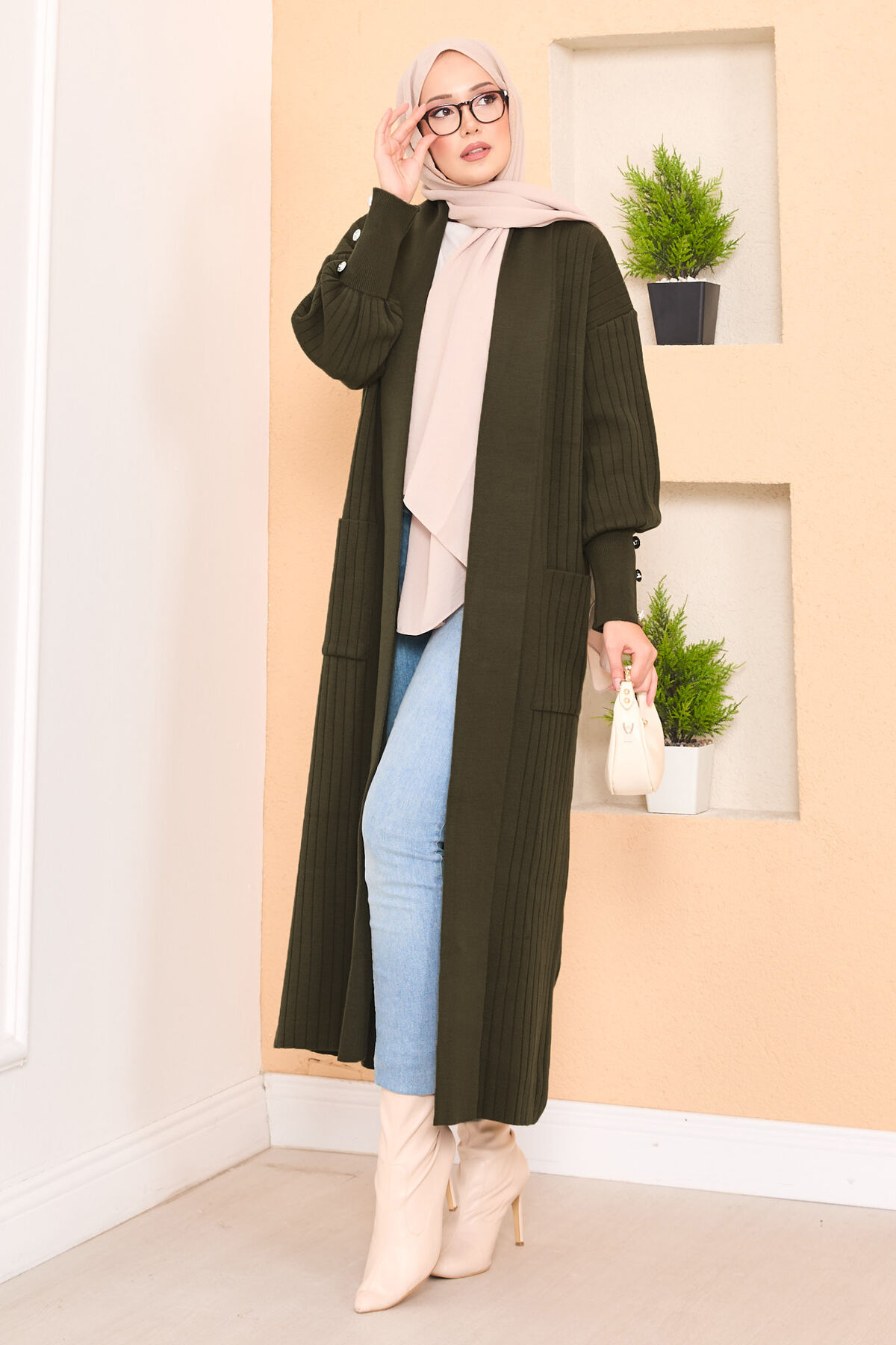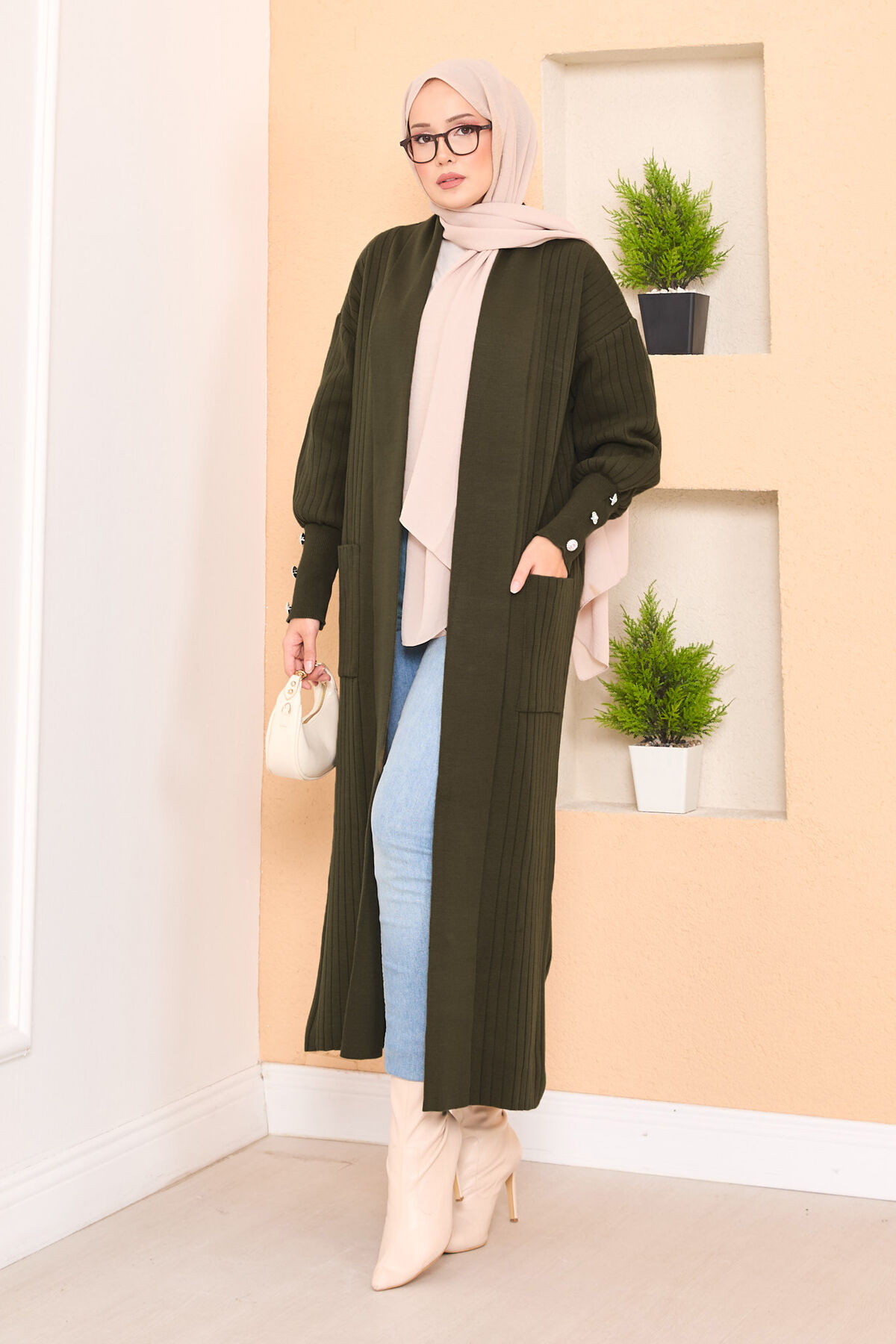 Kol Ucu Düğmeli Şal Yaka Tesettür Triko Hırka Haki