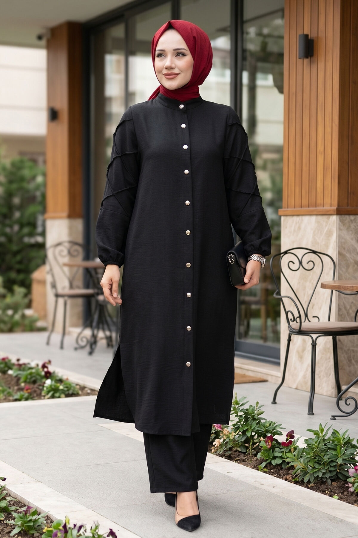 - Ürün mevsimliktir. Ürün tunik pantolon olmak üzere iki parçadan oluşmaktadır. Tunik önü boydan düğmeli, yanlarında yırtmaç detayı bulunmakta, kol manşetleri lastiklidir. Pantolon beli lastikli olup çok rahat bir kalıptır.
