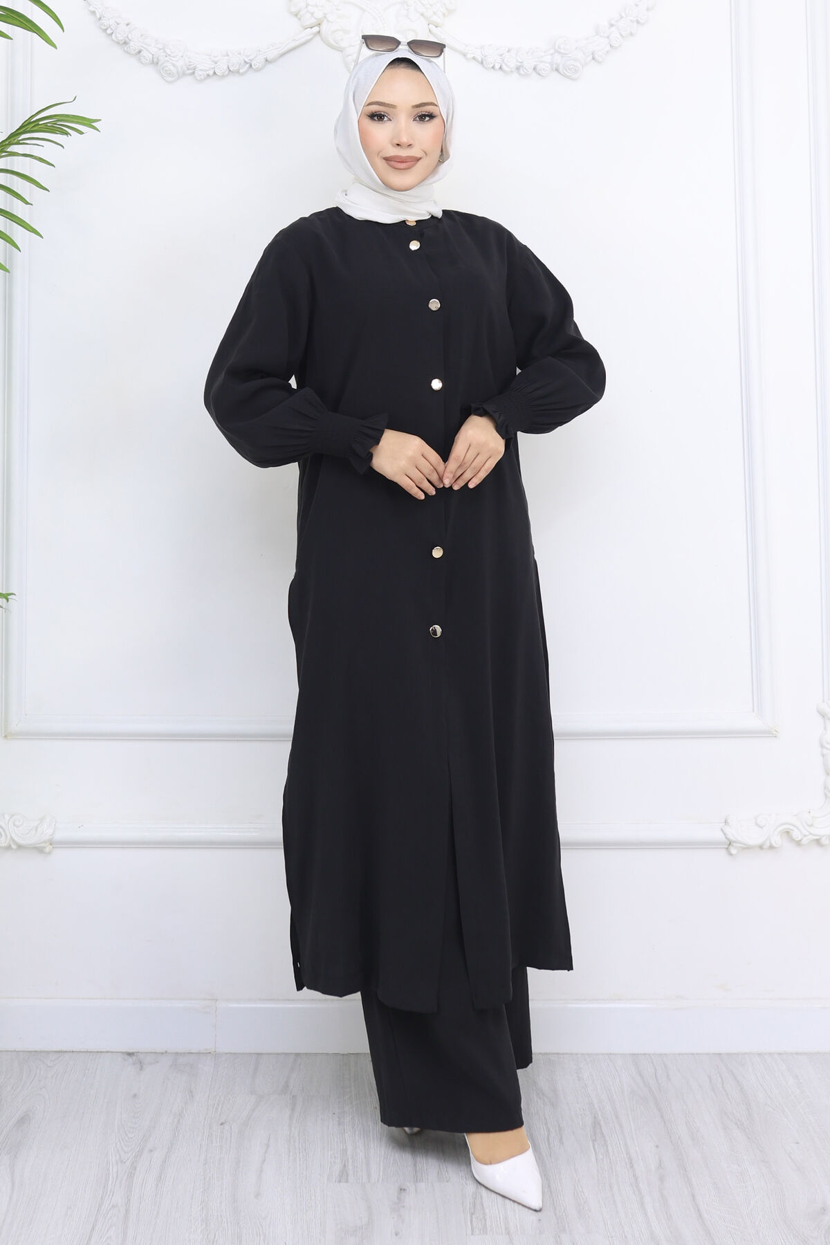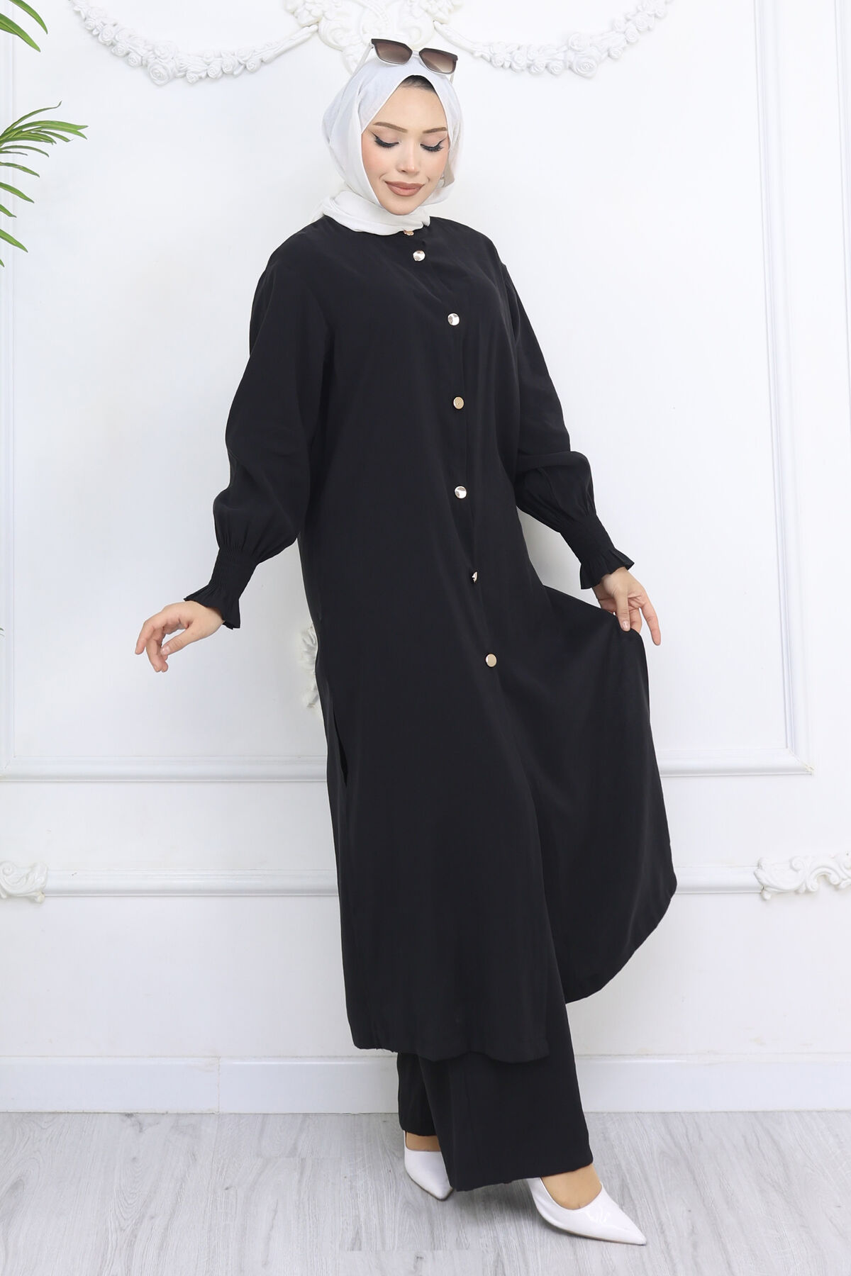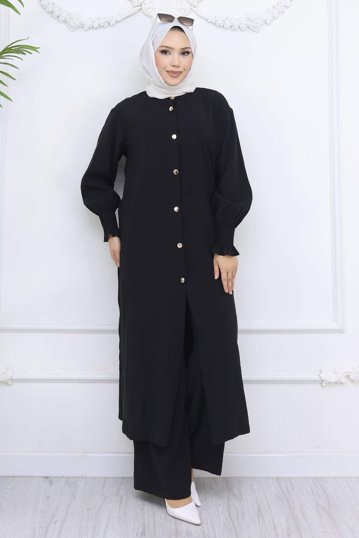 Kolları Gipeli Düğmeli Tunik Takım Siyah