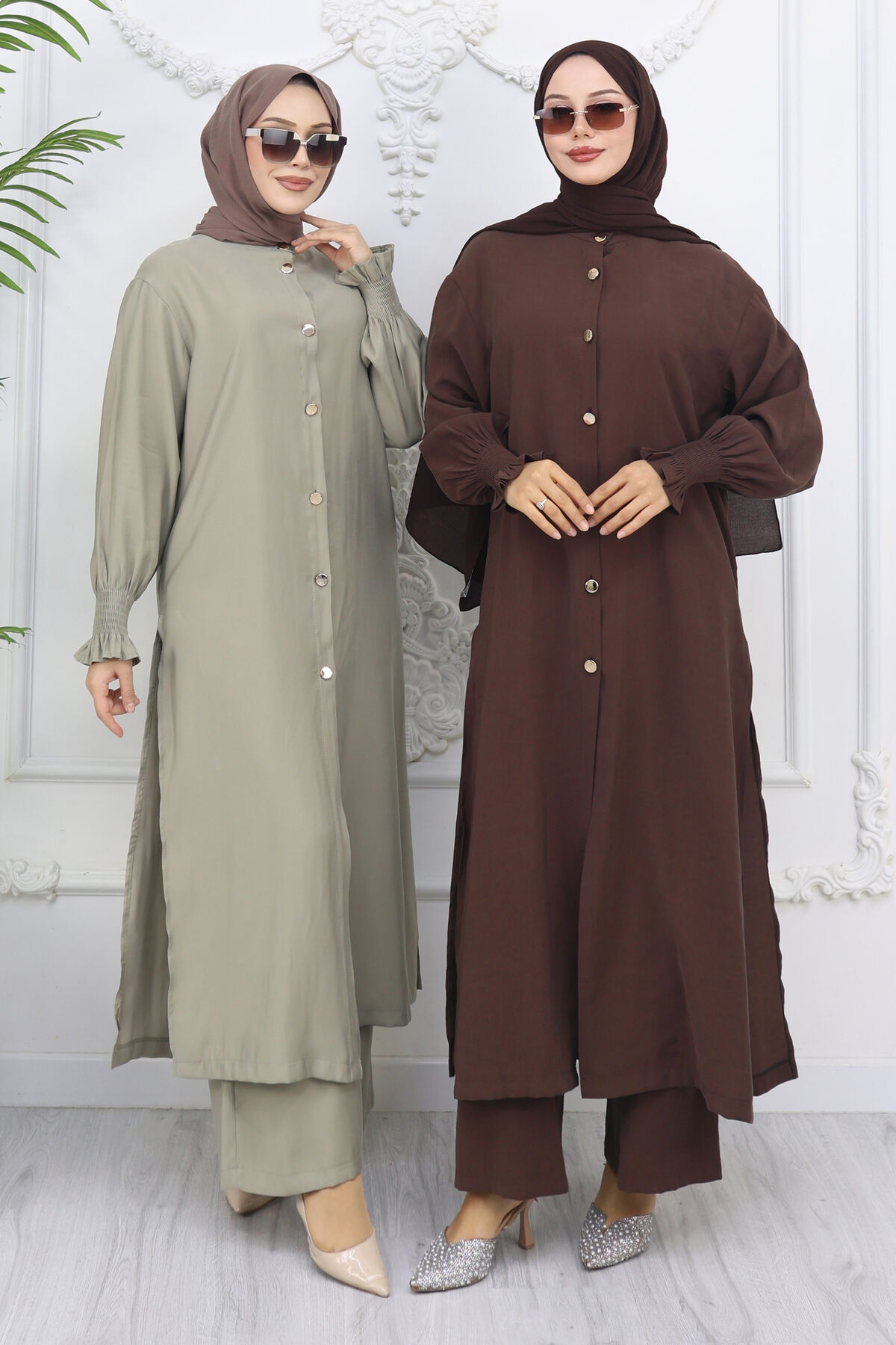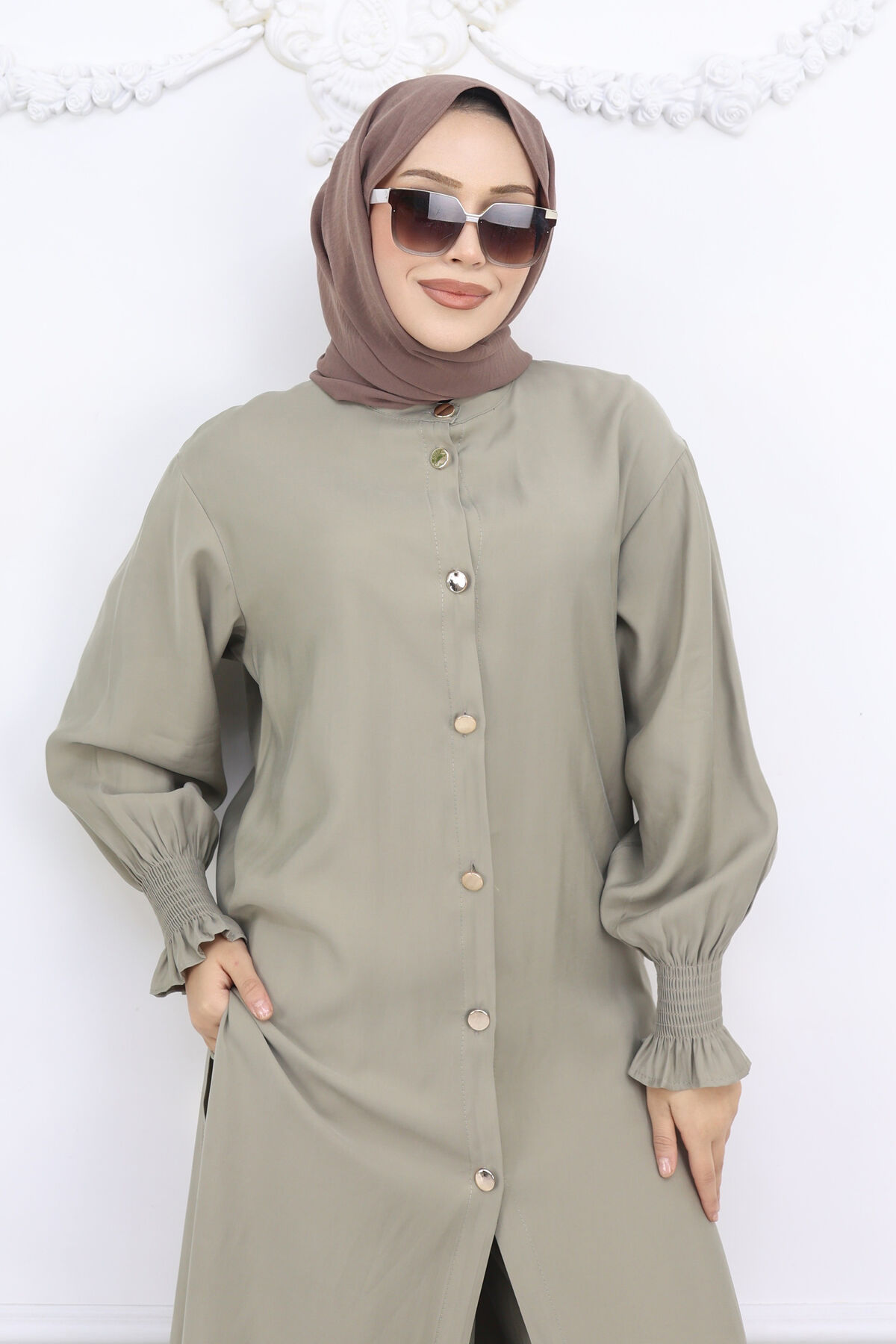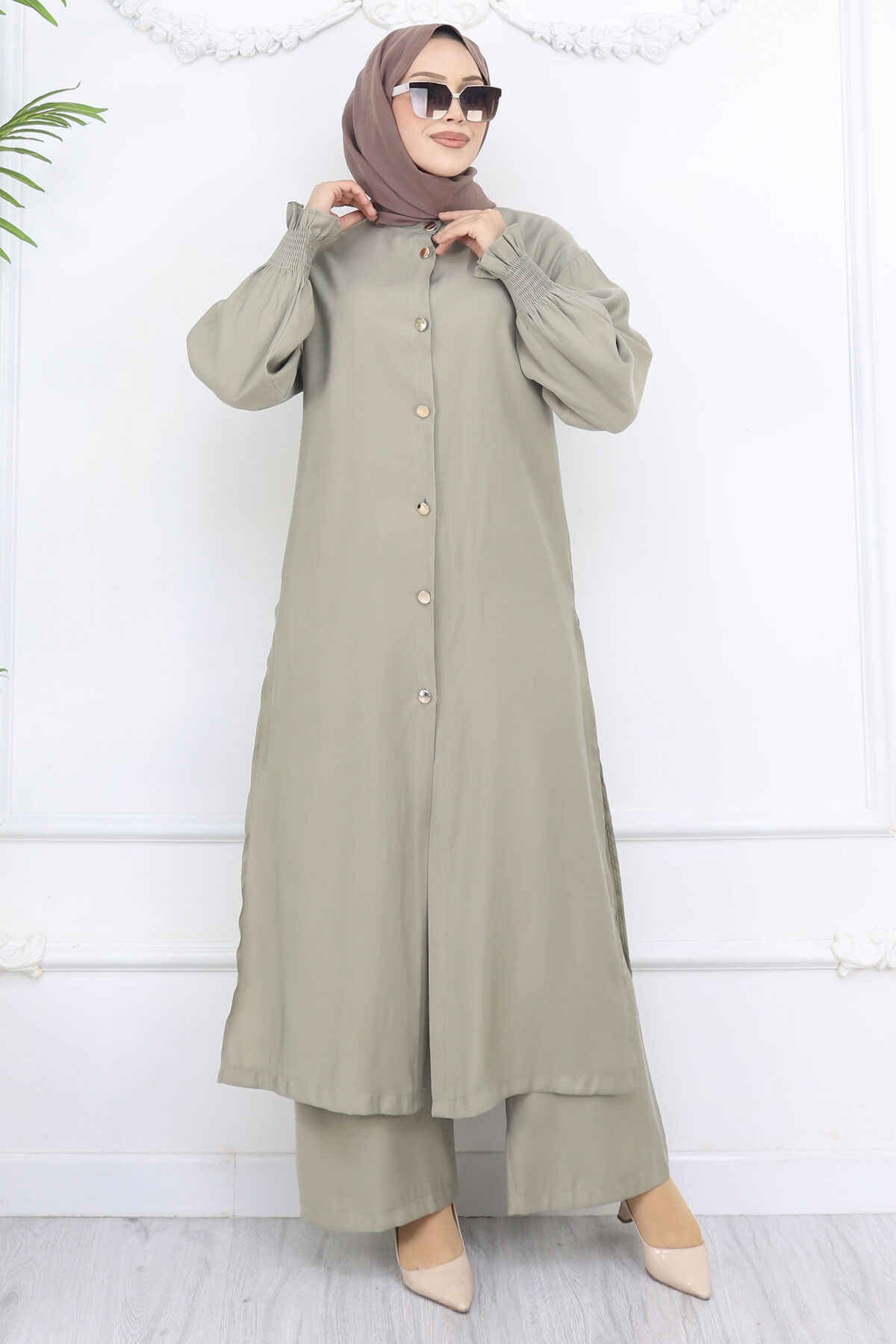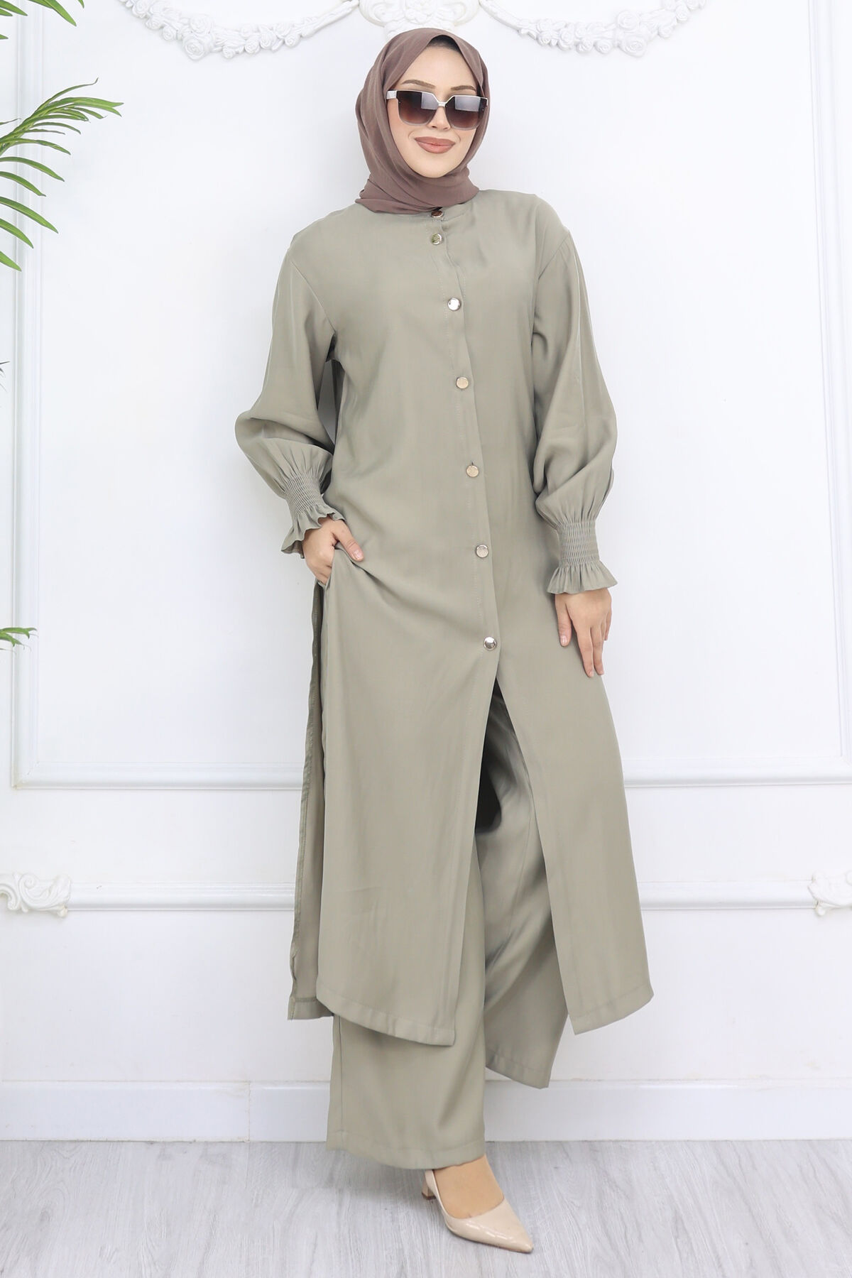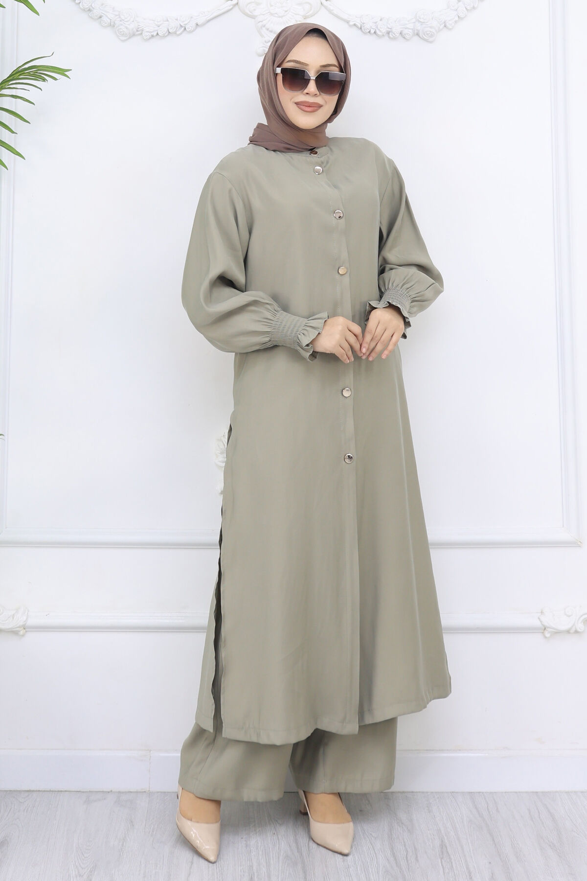 Kolları Gipeli Düğmeli Tunik Takım Yağ Yeşil