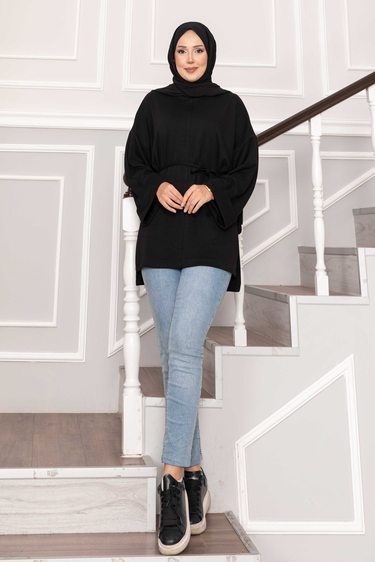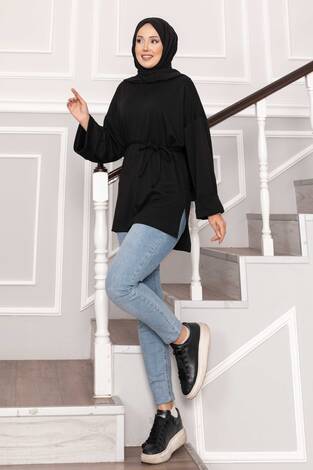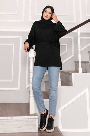 Kolu Katlamalı Kuşaklı Oyşo Tunik Siyah