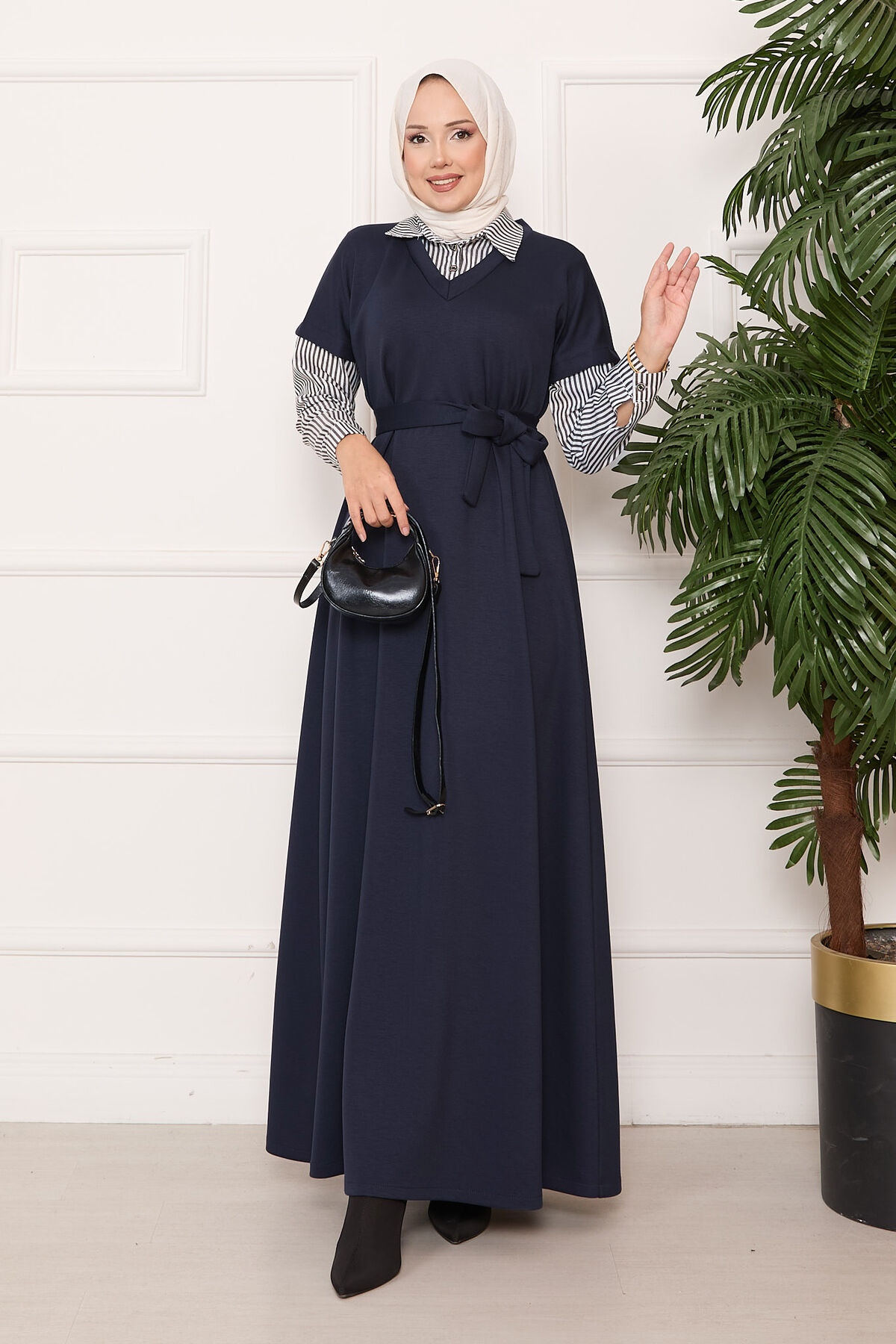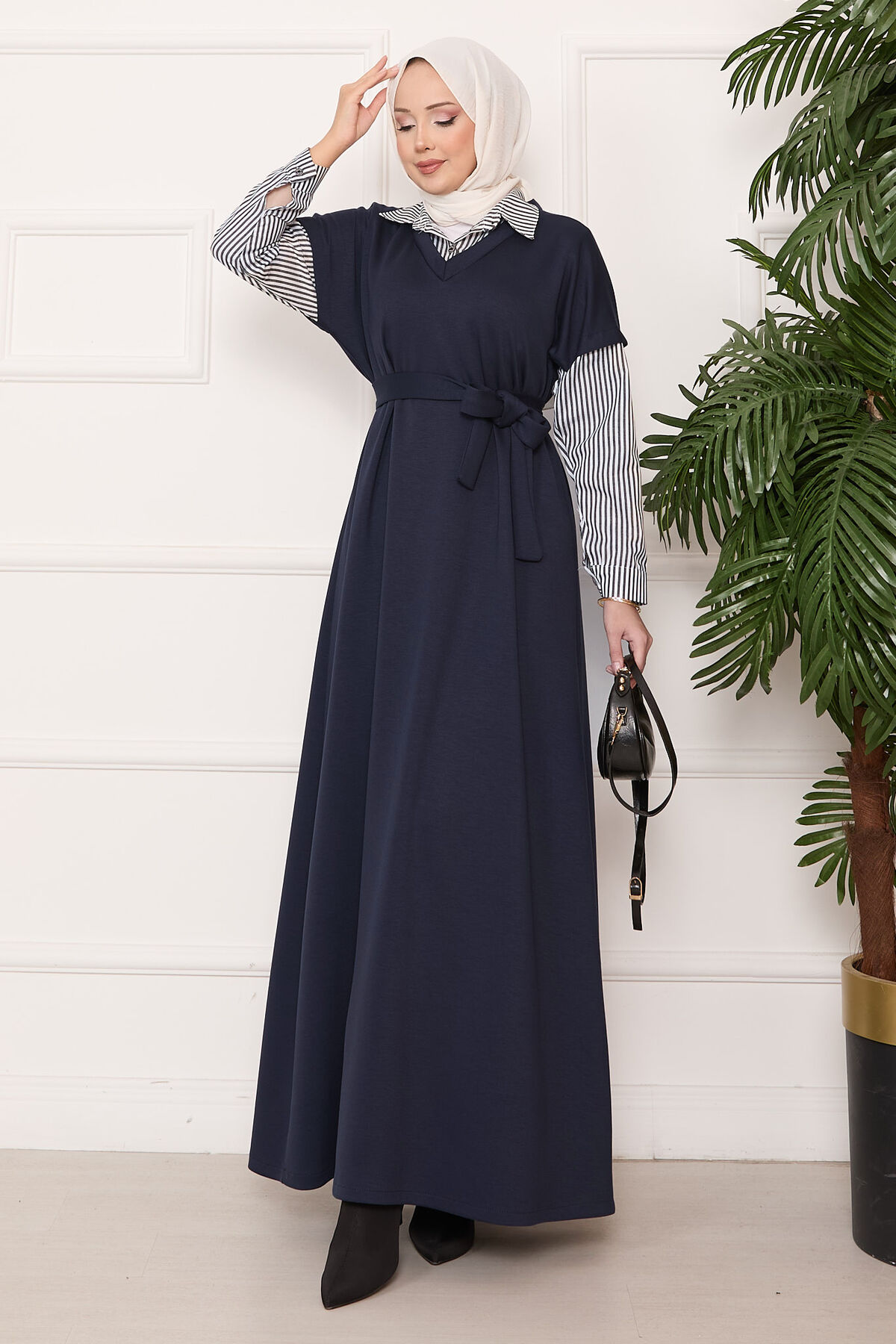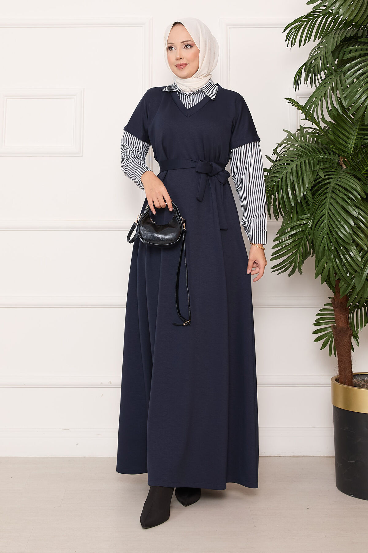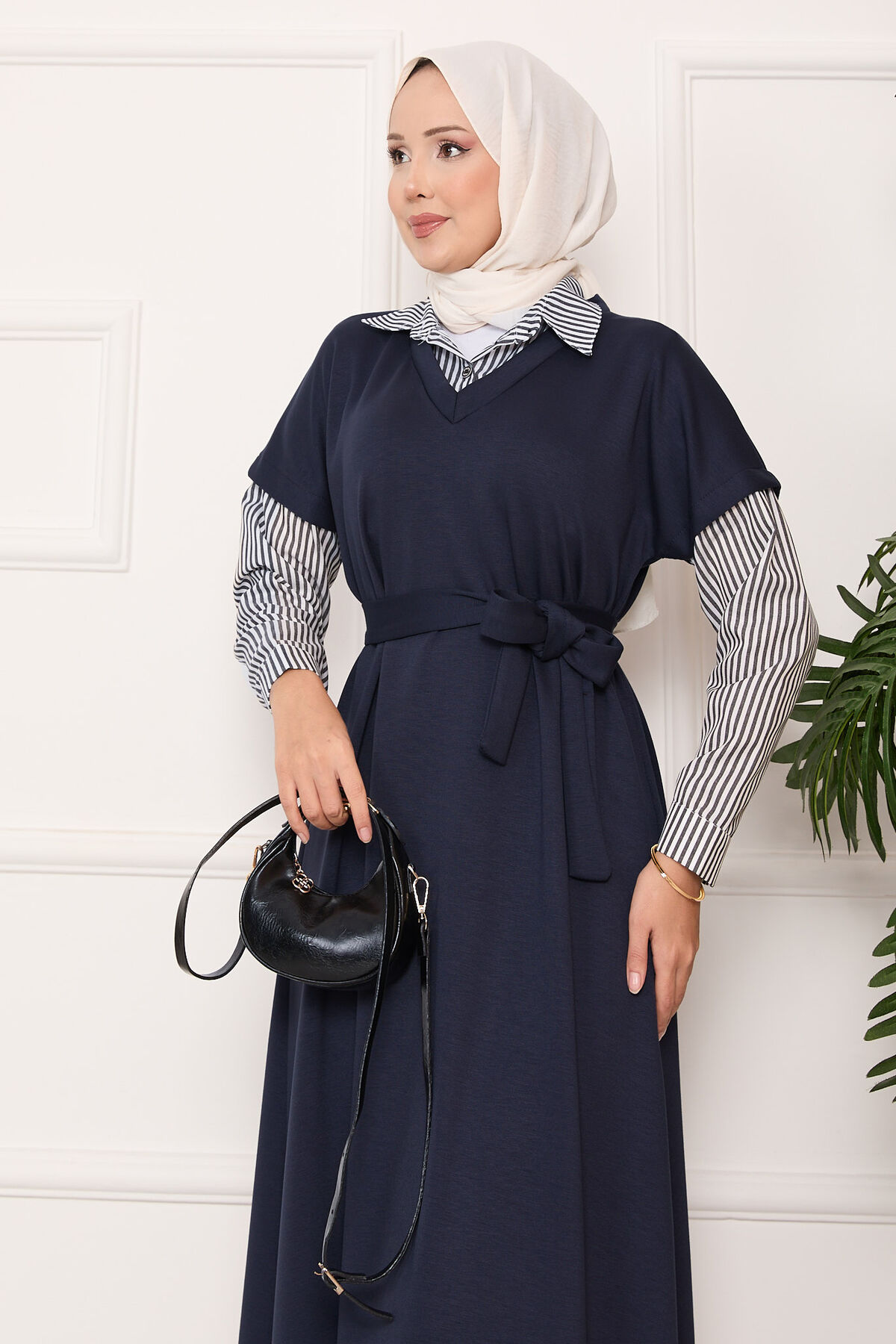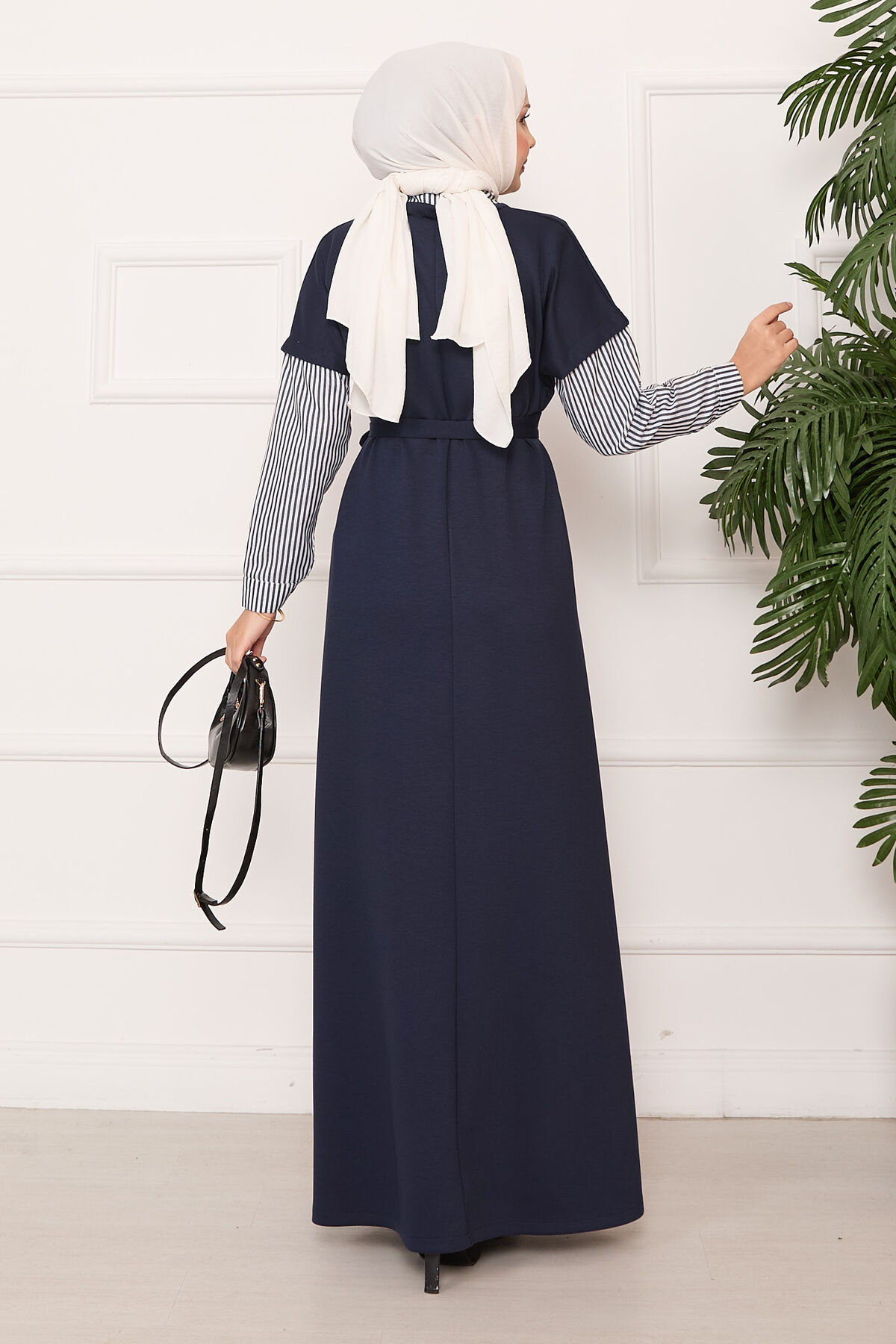 - Ürün mevsimliktir. Kolu ve yakası çizgili seyyar kuşaklı tessettür elbise.Kol manşetlerinde düğme detayı vardır.