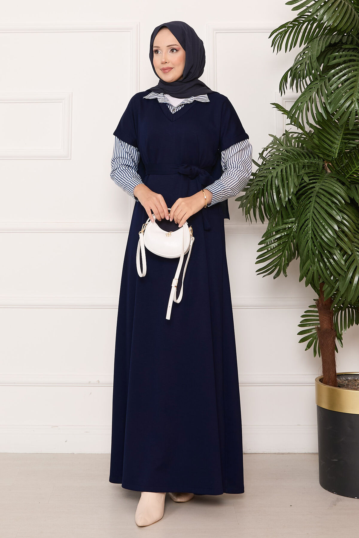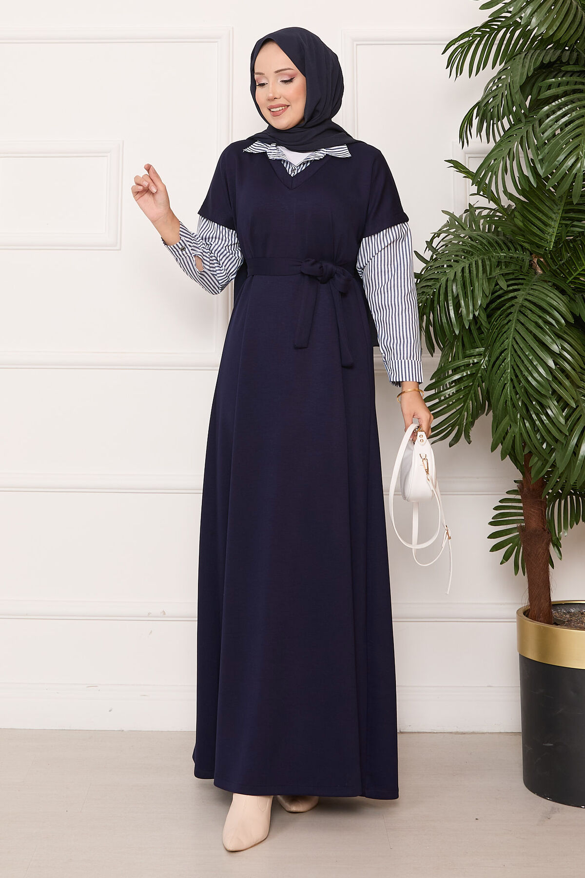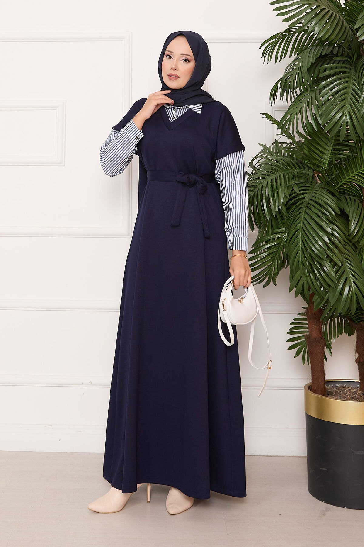 - Ürün mevsimliktir. Kolu ve yakası çizgili seyyar kuşaklı tessettür elbise.Kol manşetlerinde düğme detayı vardır.