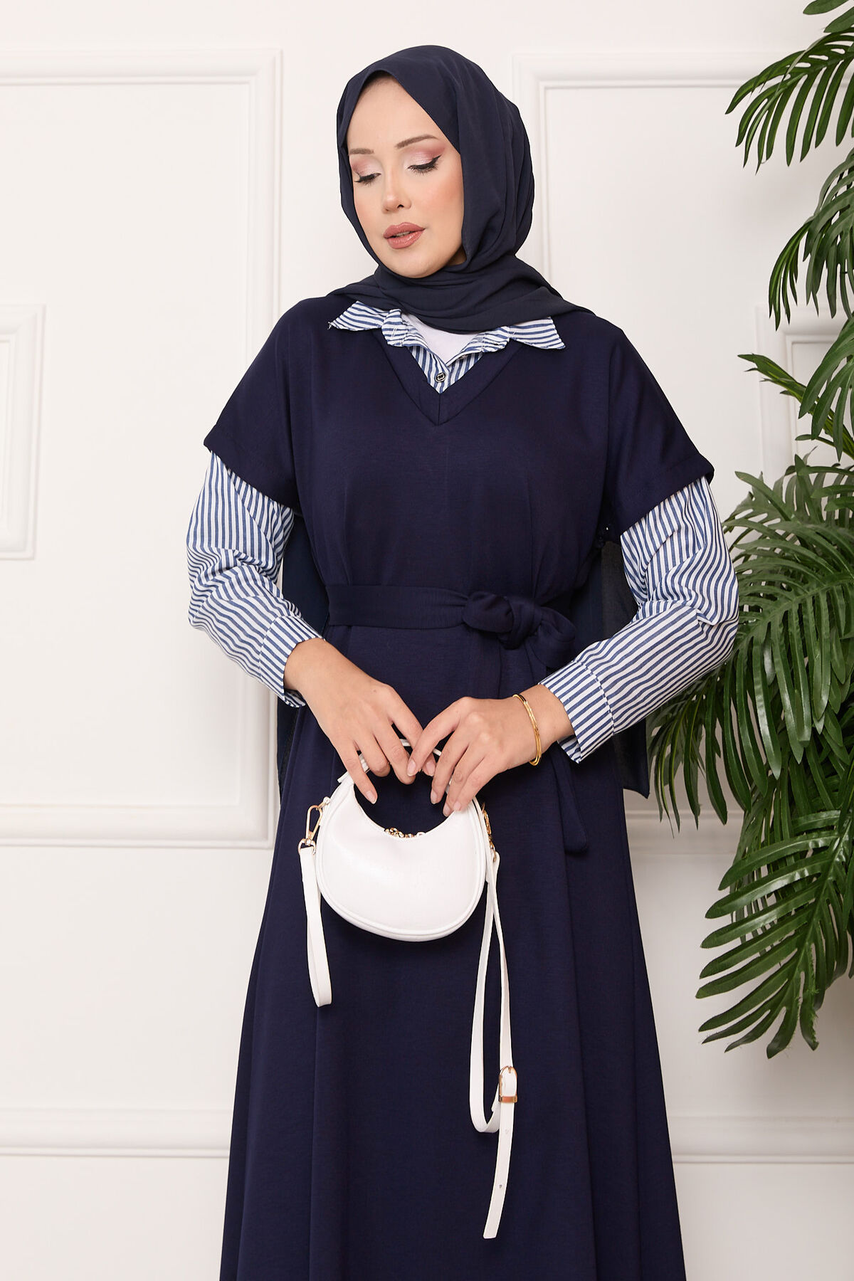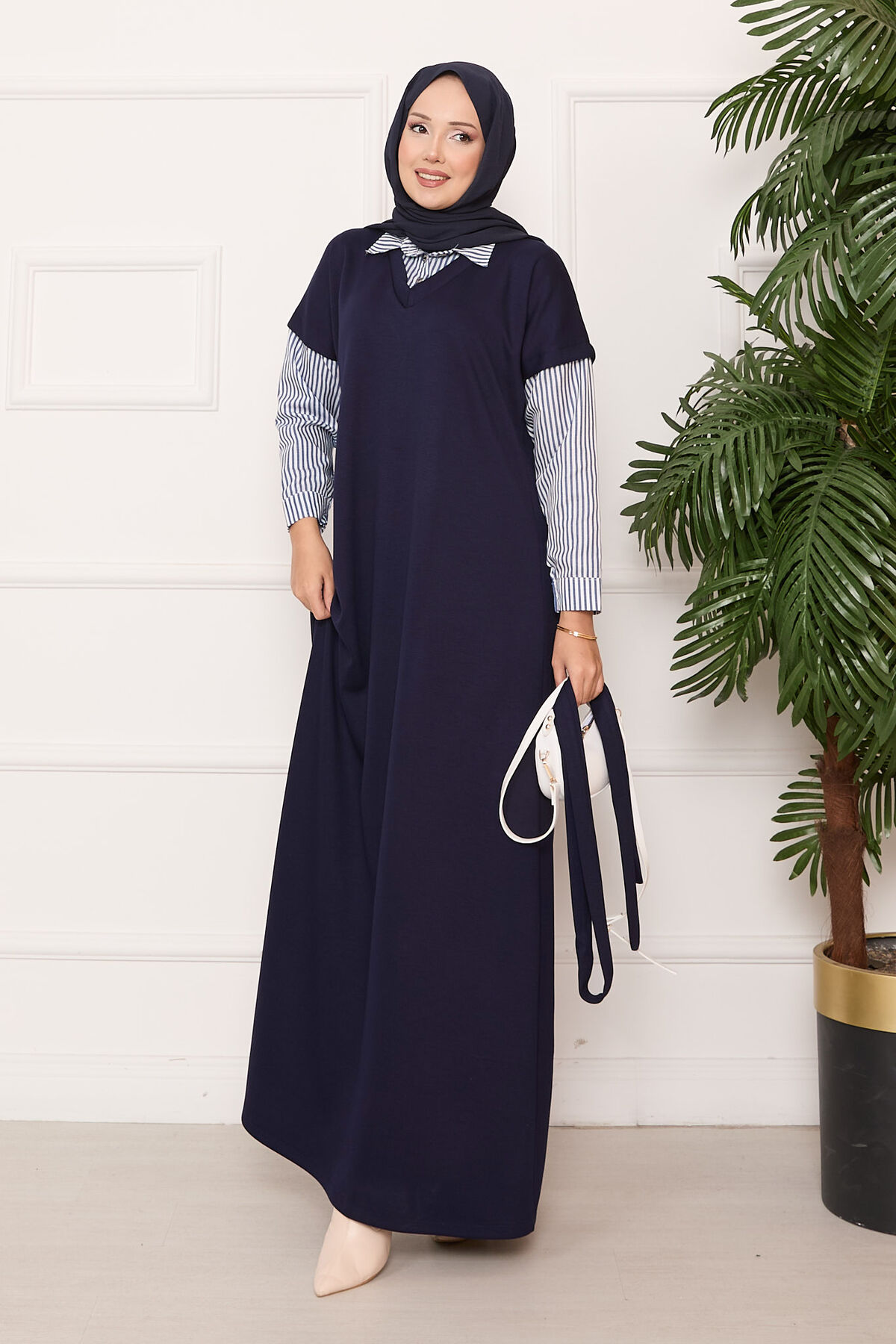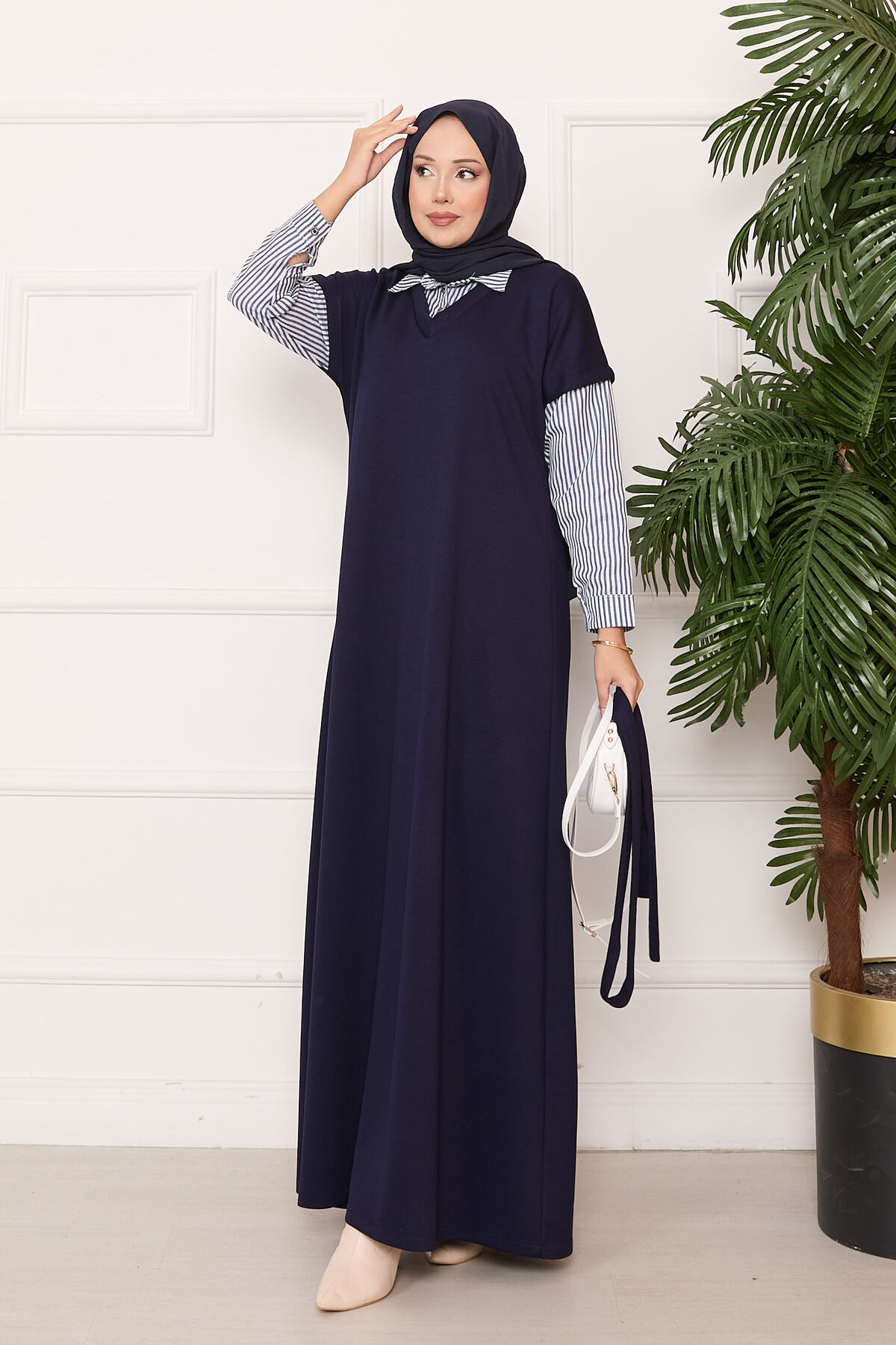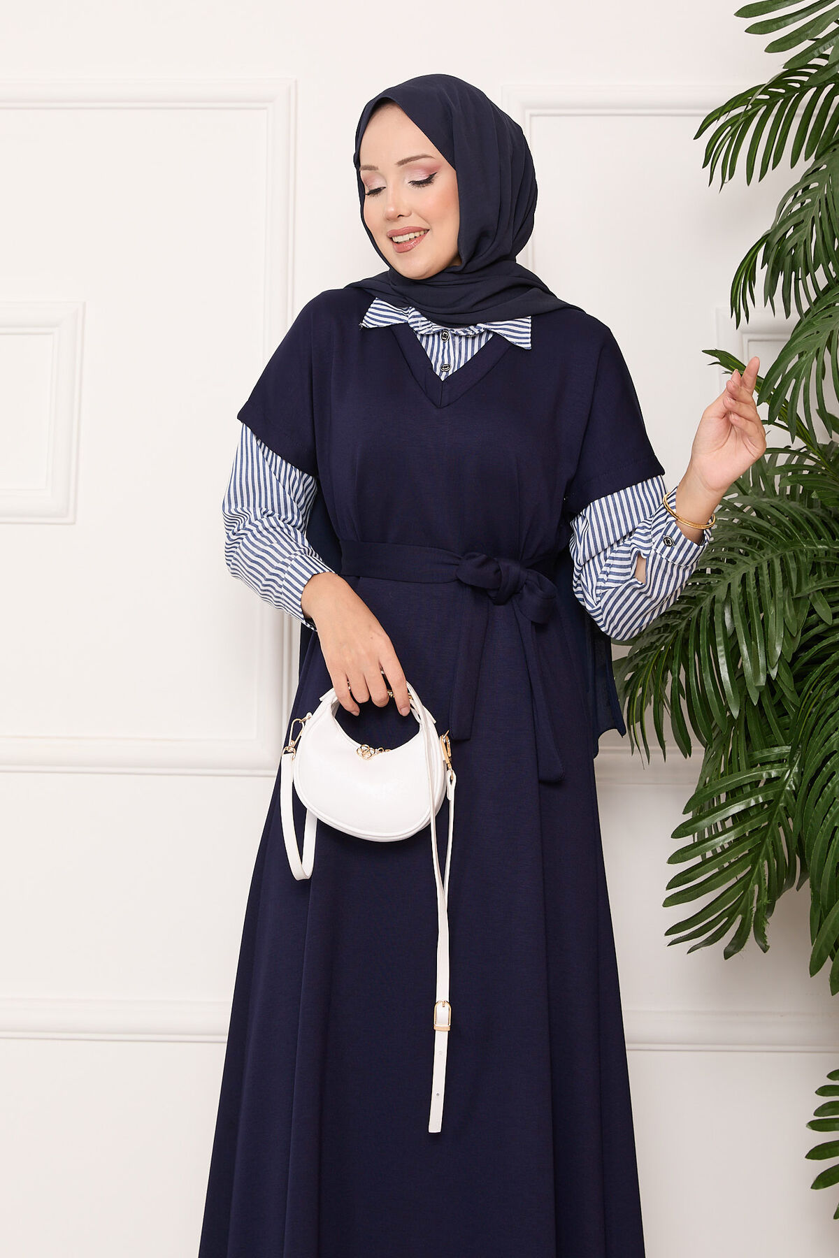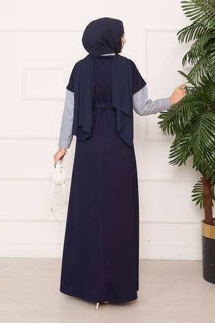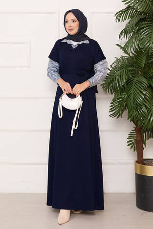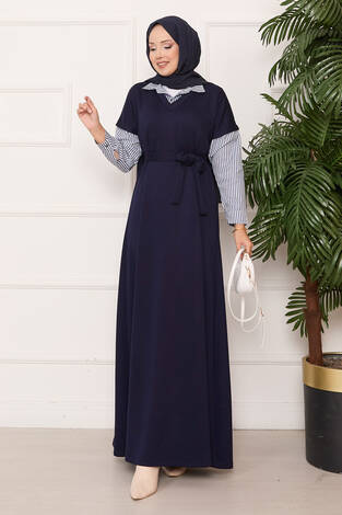 Kolu ve Yakası Çizgi Garnili Oyşo Elbise Lacivert