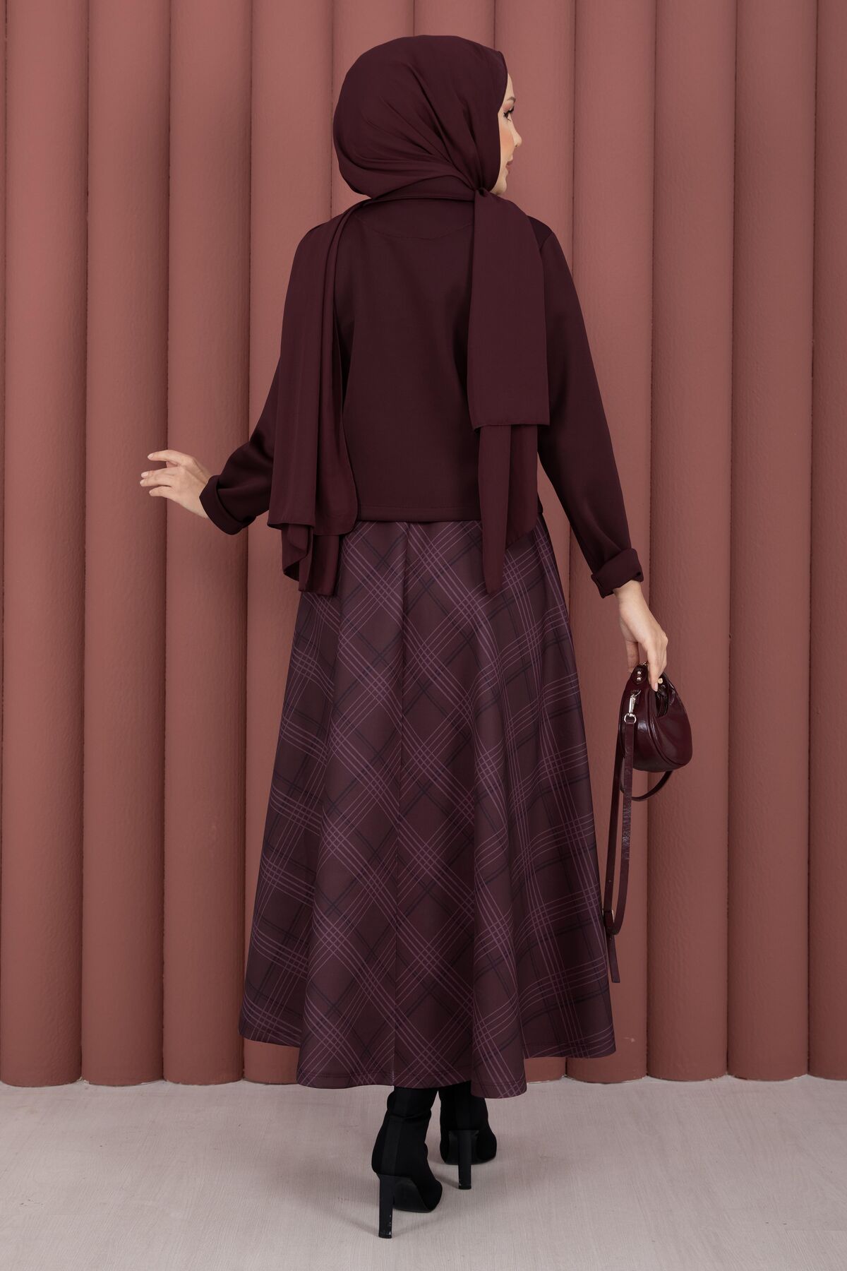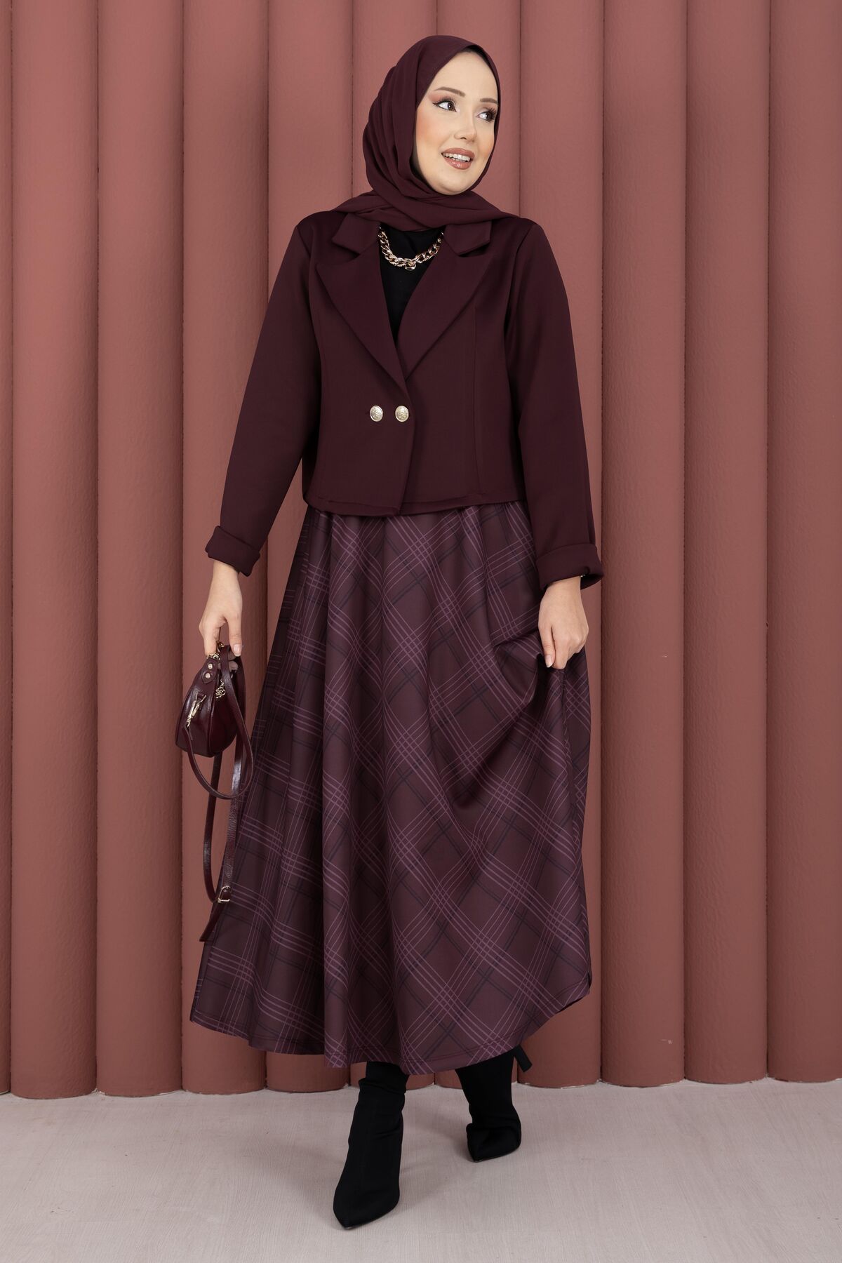Kruvaze Ceket Ekose Etek Tesettür Takım Bordo