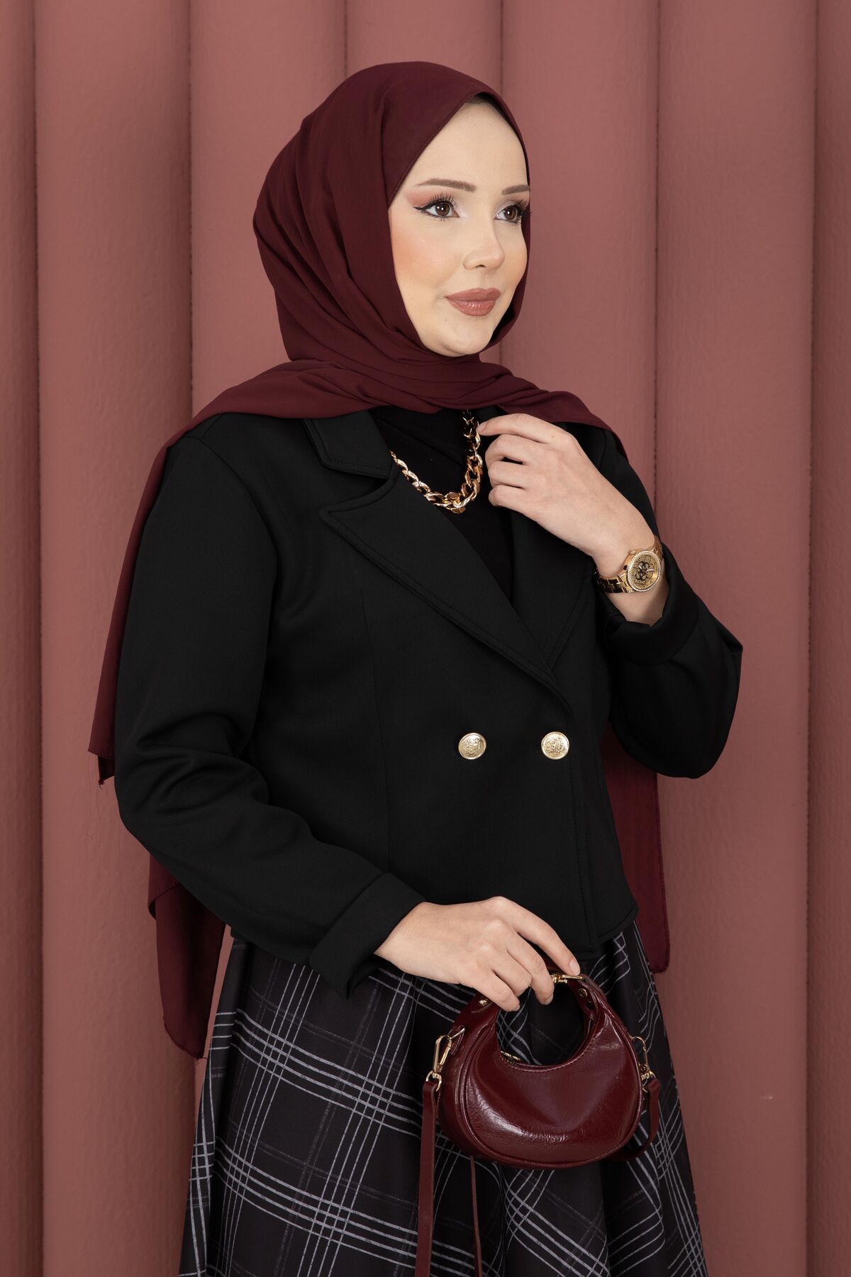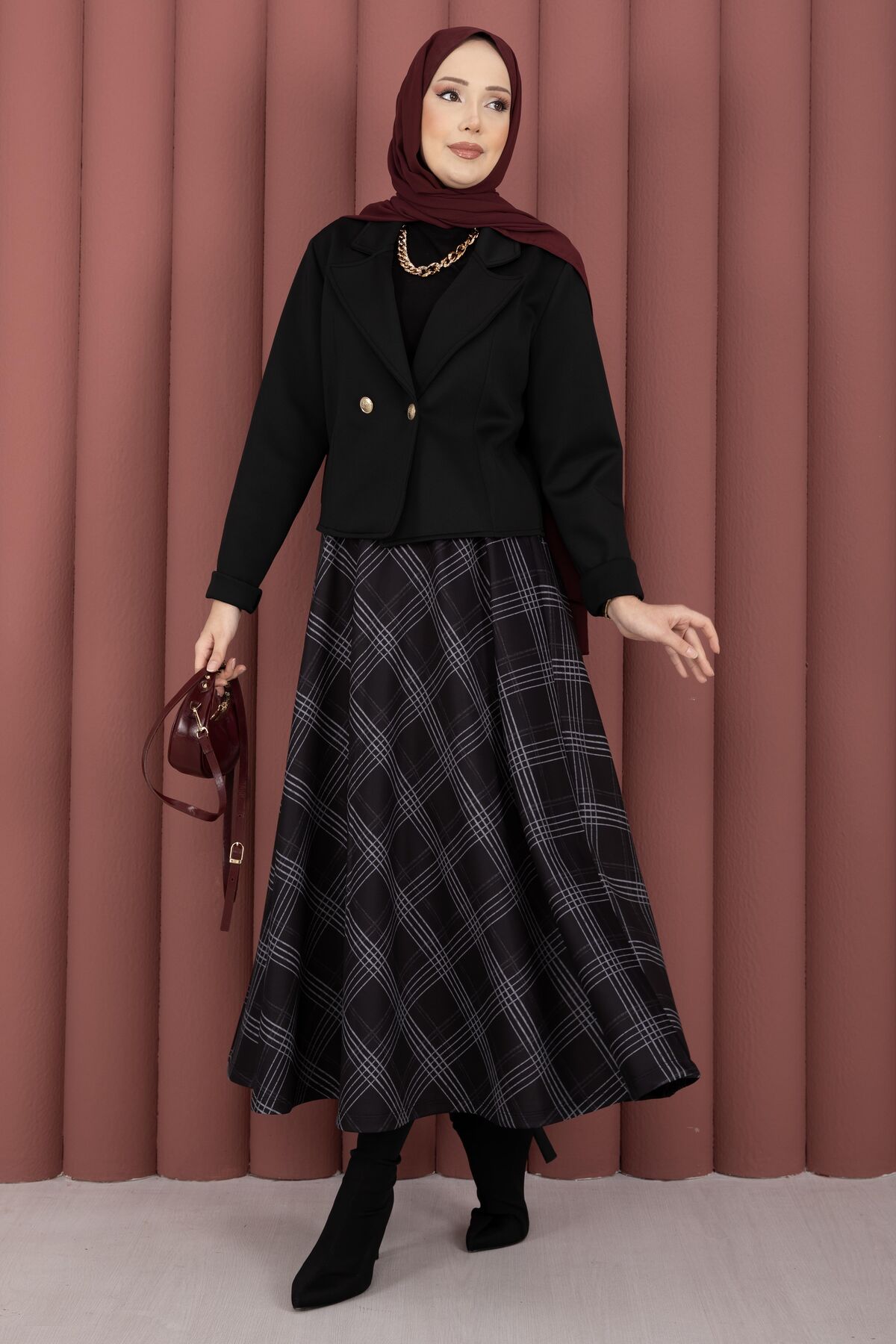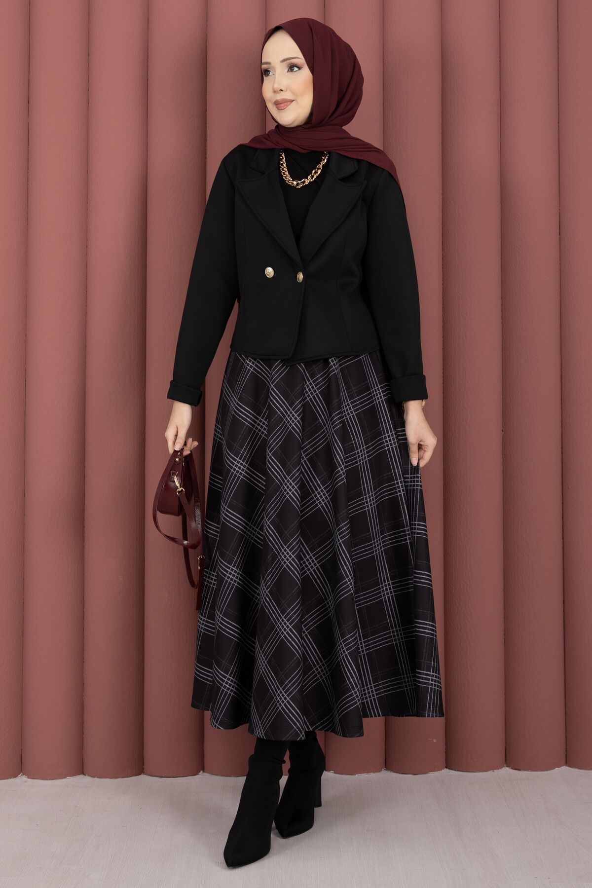 Kruvaze Ceket Ekose Etek Tesettür Takım