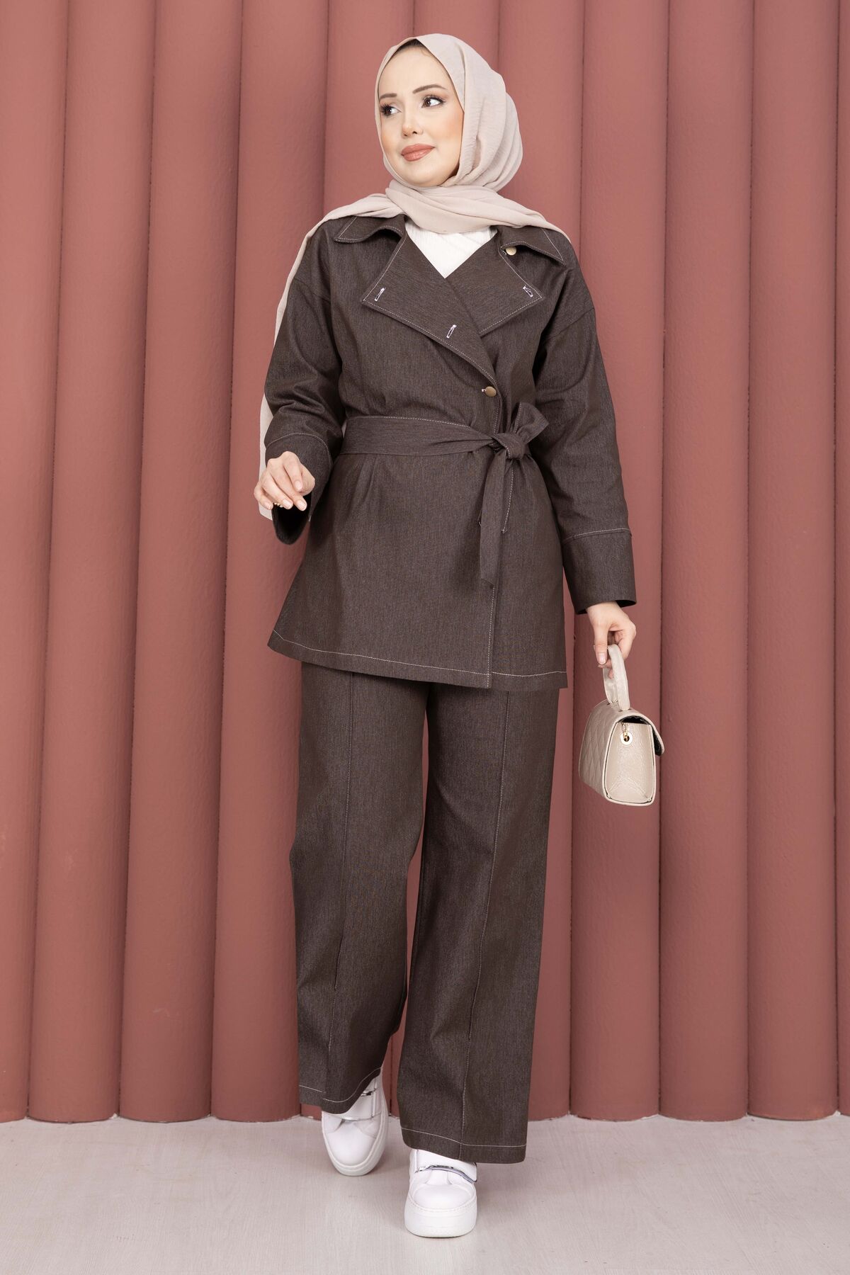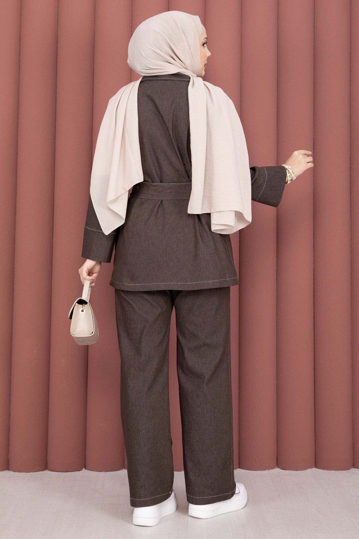 Kruvaze Yaka Gold Düğmeli İkili Kot Takım Kahve