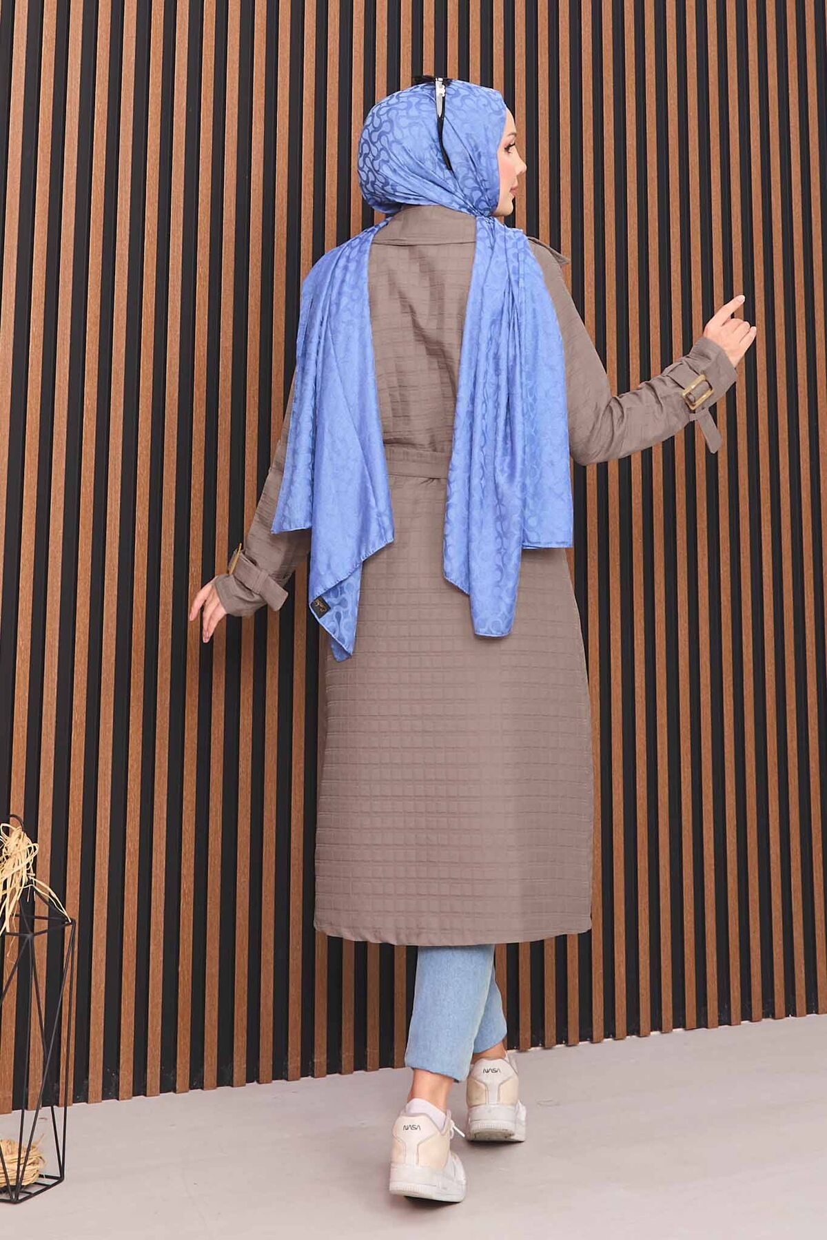 Kruvaze Yaka Kemerli Tesettür Kapitone Trençkot Vizon