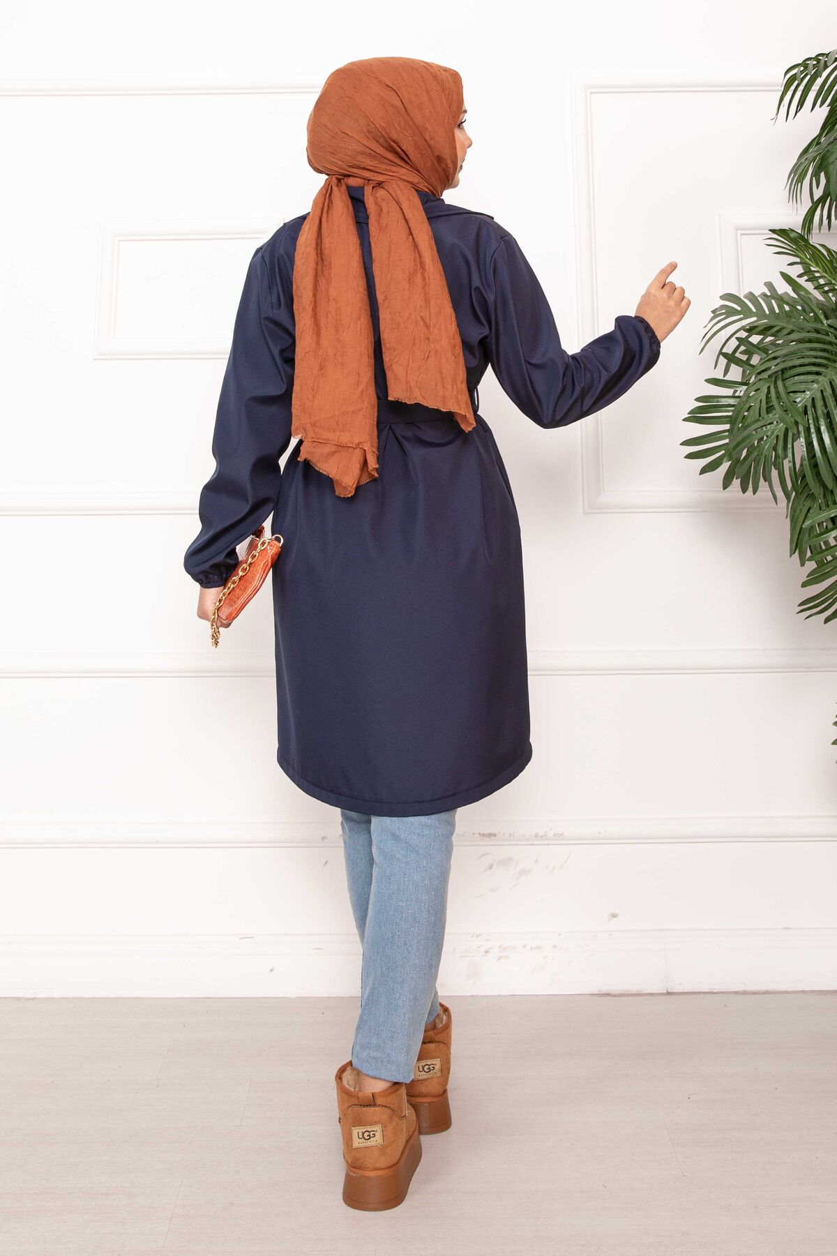 - Ürün Sonbahar & Kış modasıdır.Kruvaze yaka belden seyyar kuşaklı kol manşetleri lastikli yandan çift cepli trençkot.