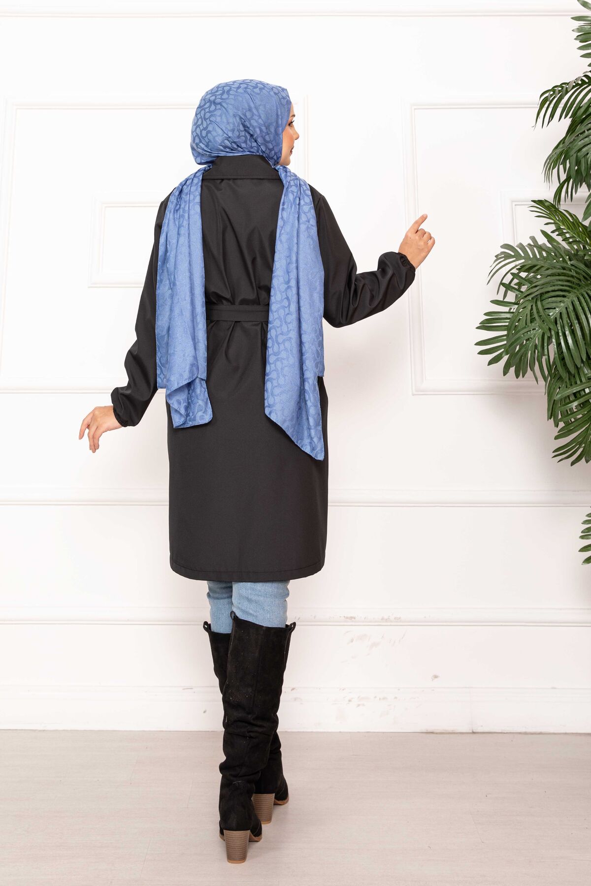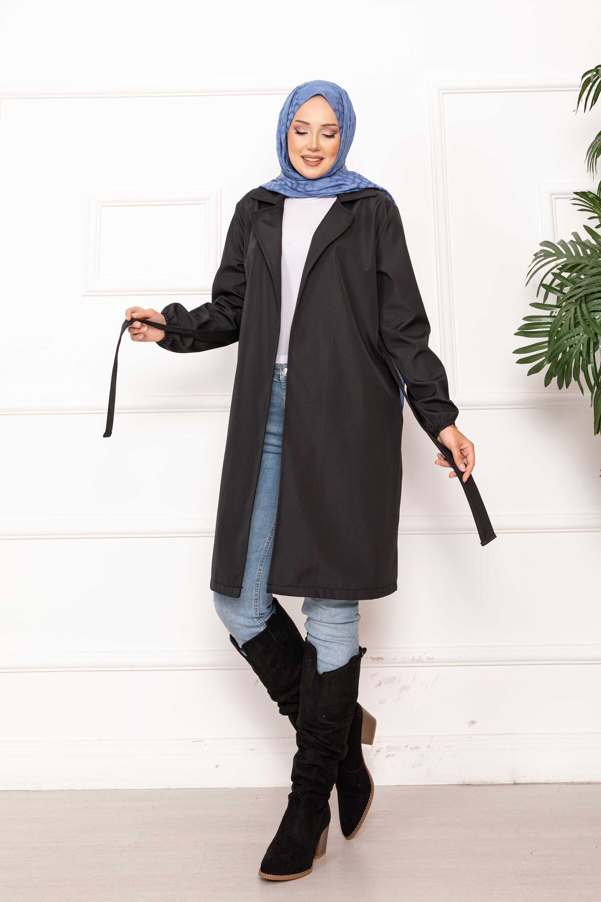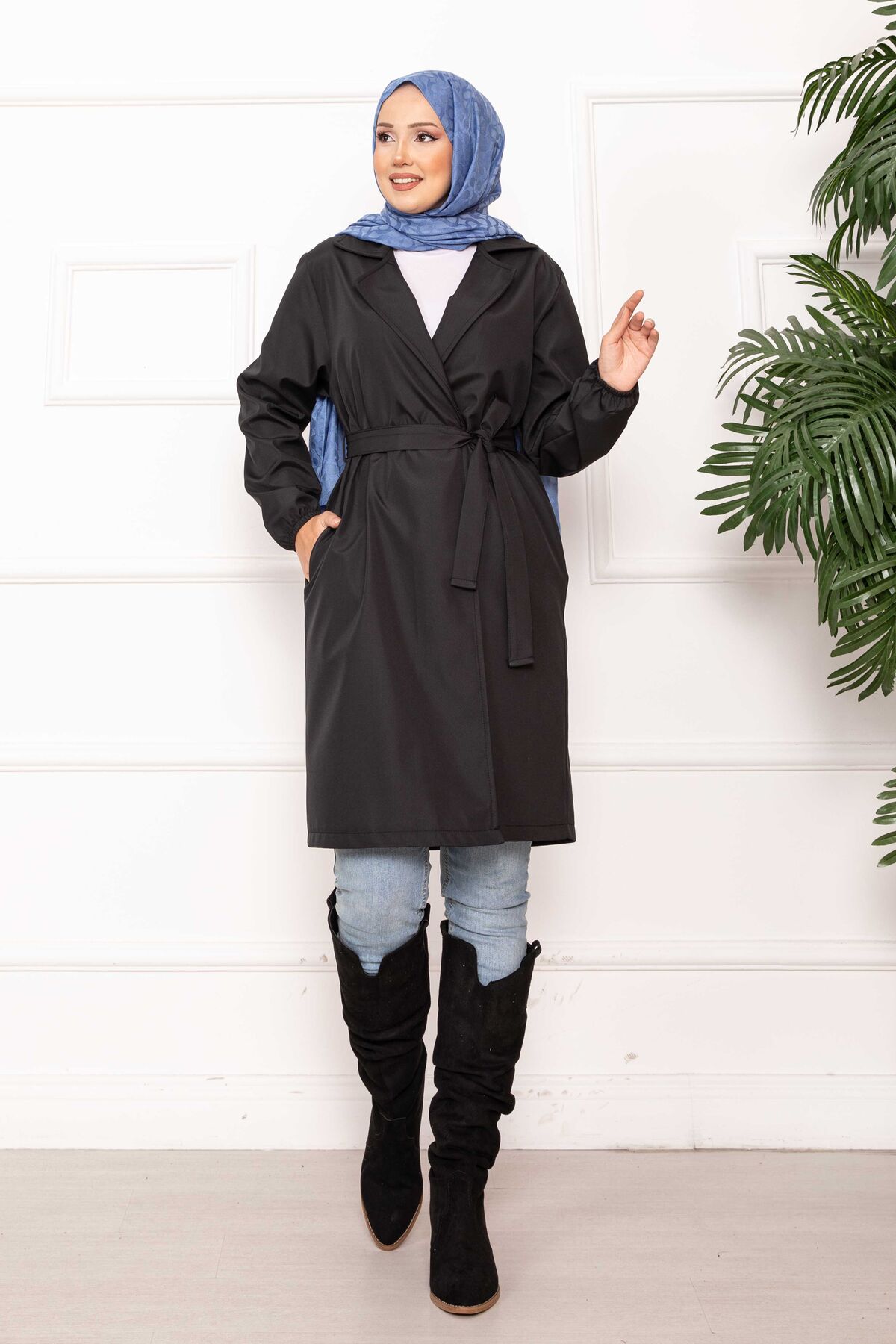 - Ürün Sonbahar & Kış modasıdır.Kruvaze yaka belden seyyar kuşaklı kol manşetleri lastikli yandan çift cepli trençkot.