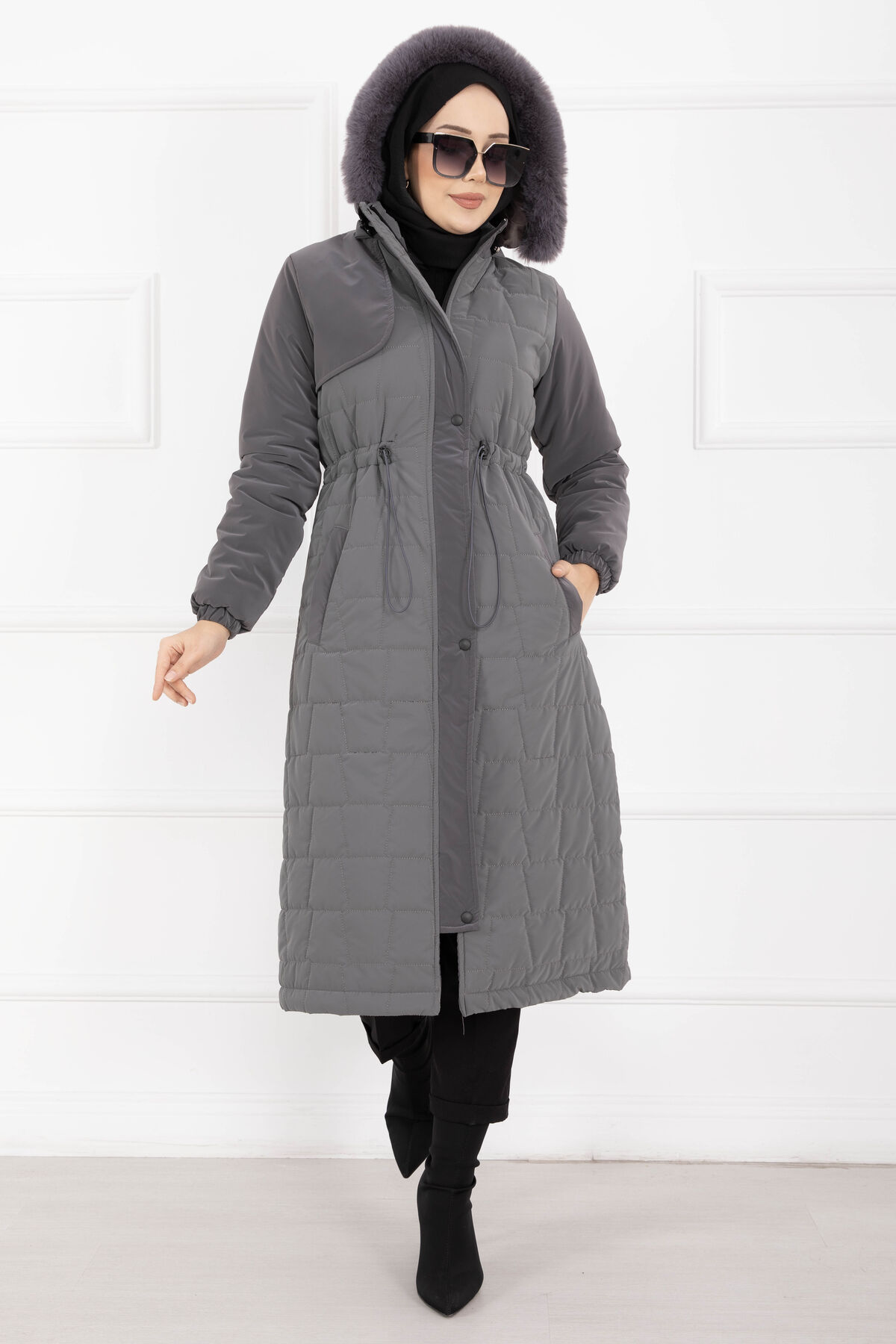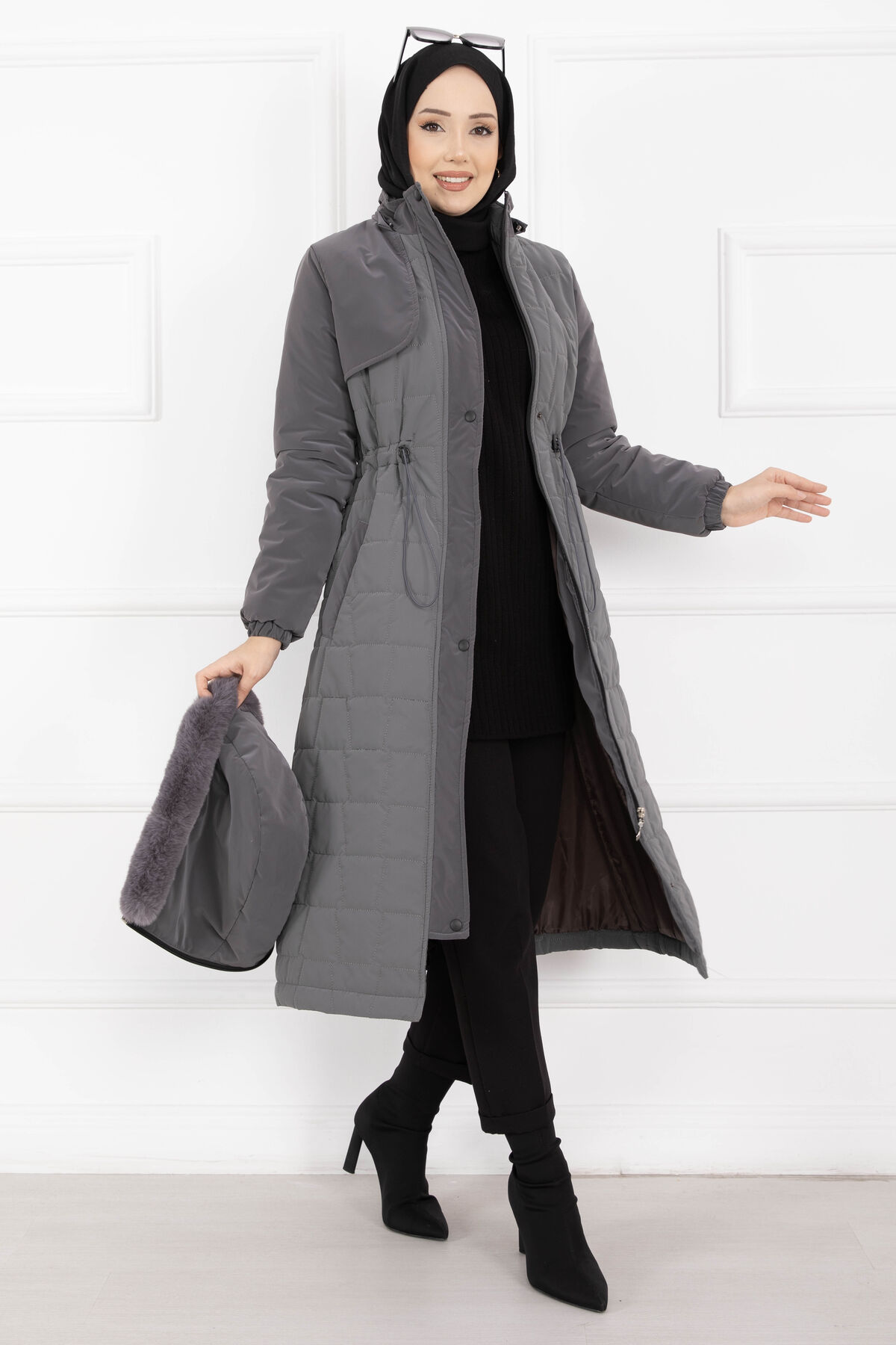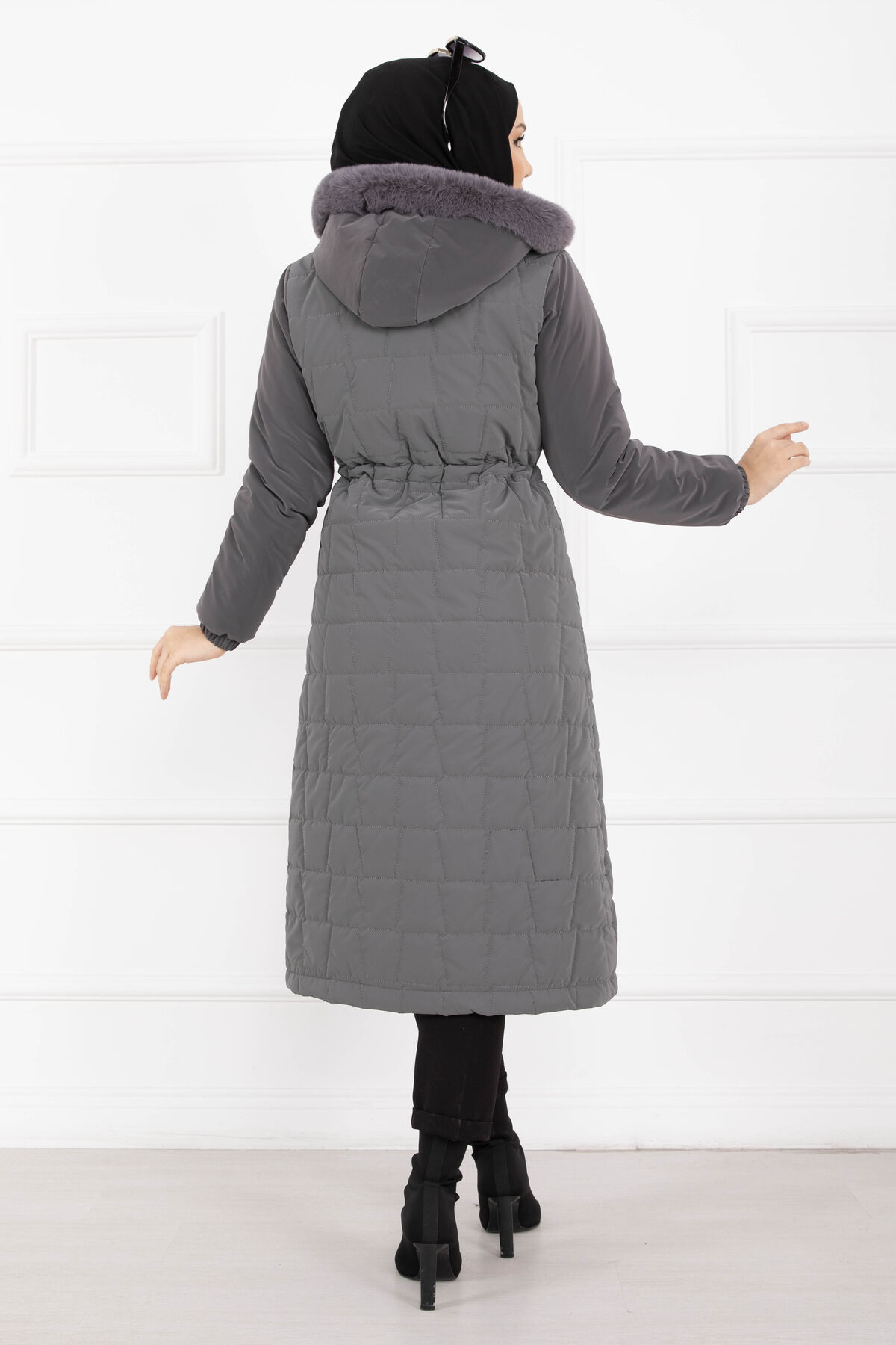 Kürk Kapüşonlu Beli Bağcıklı Nova Kaban Füme