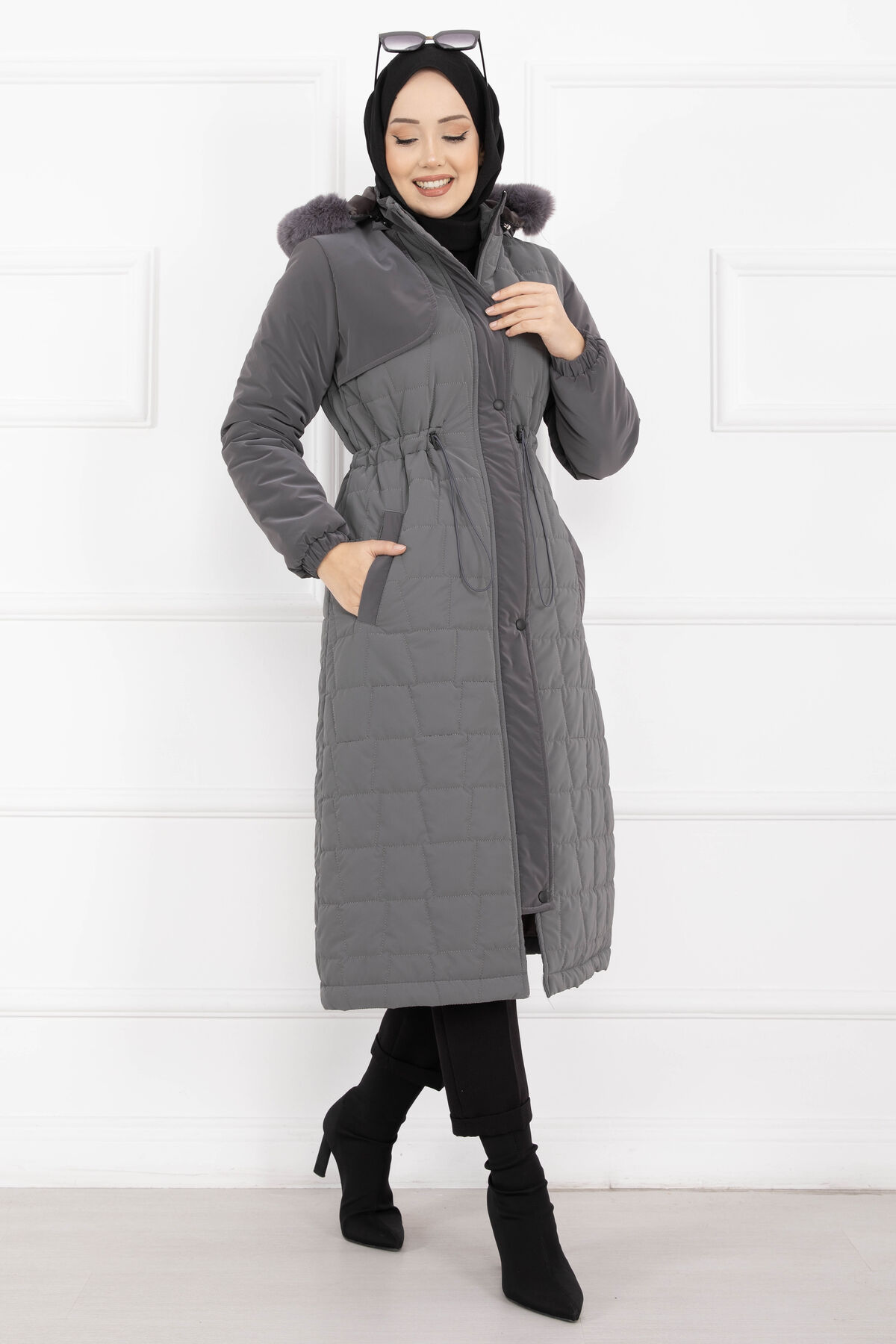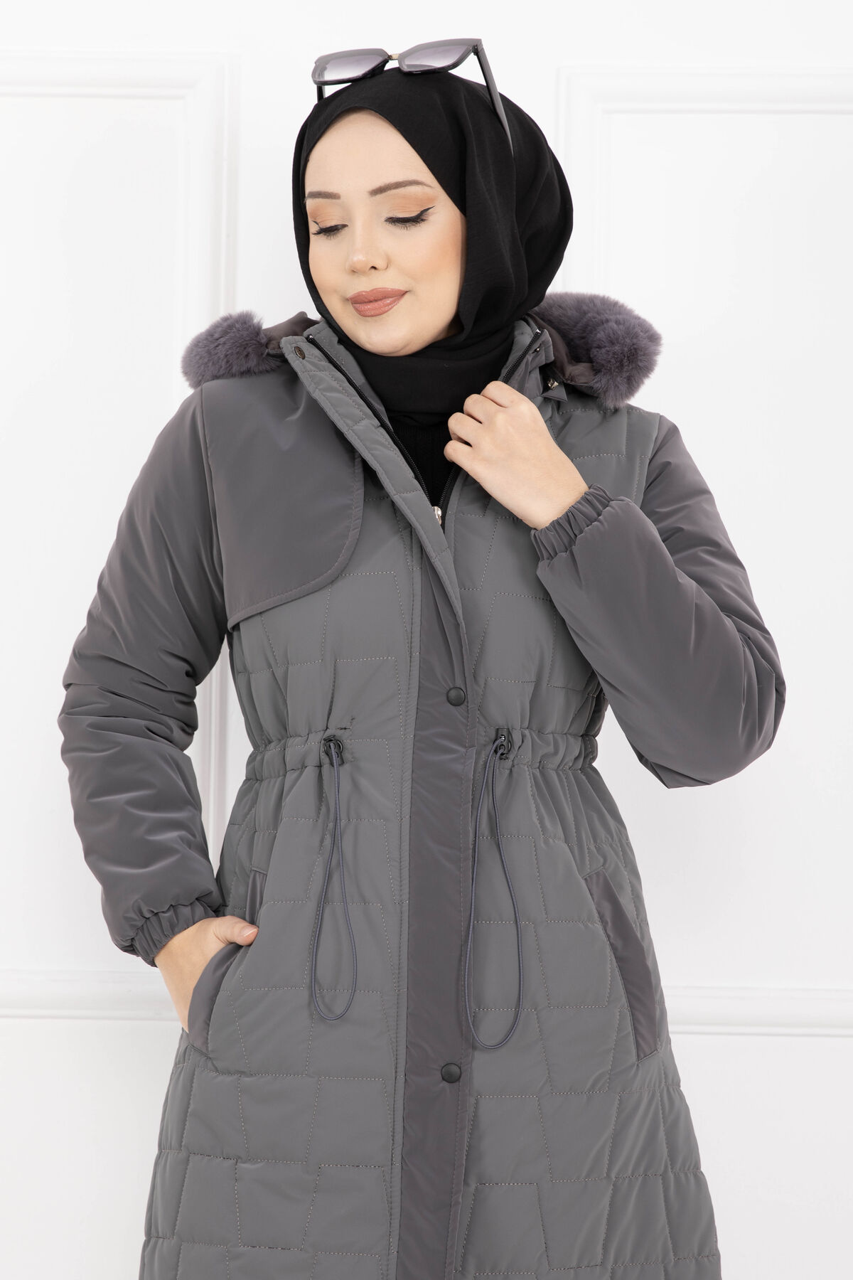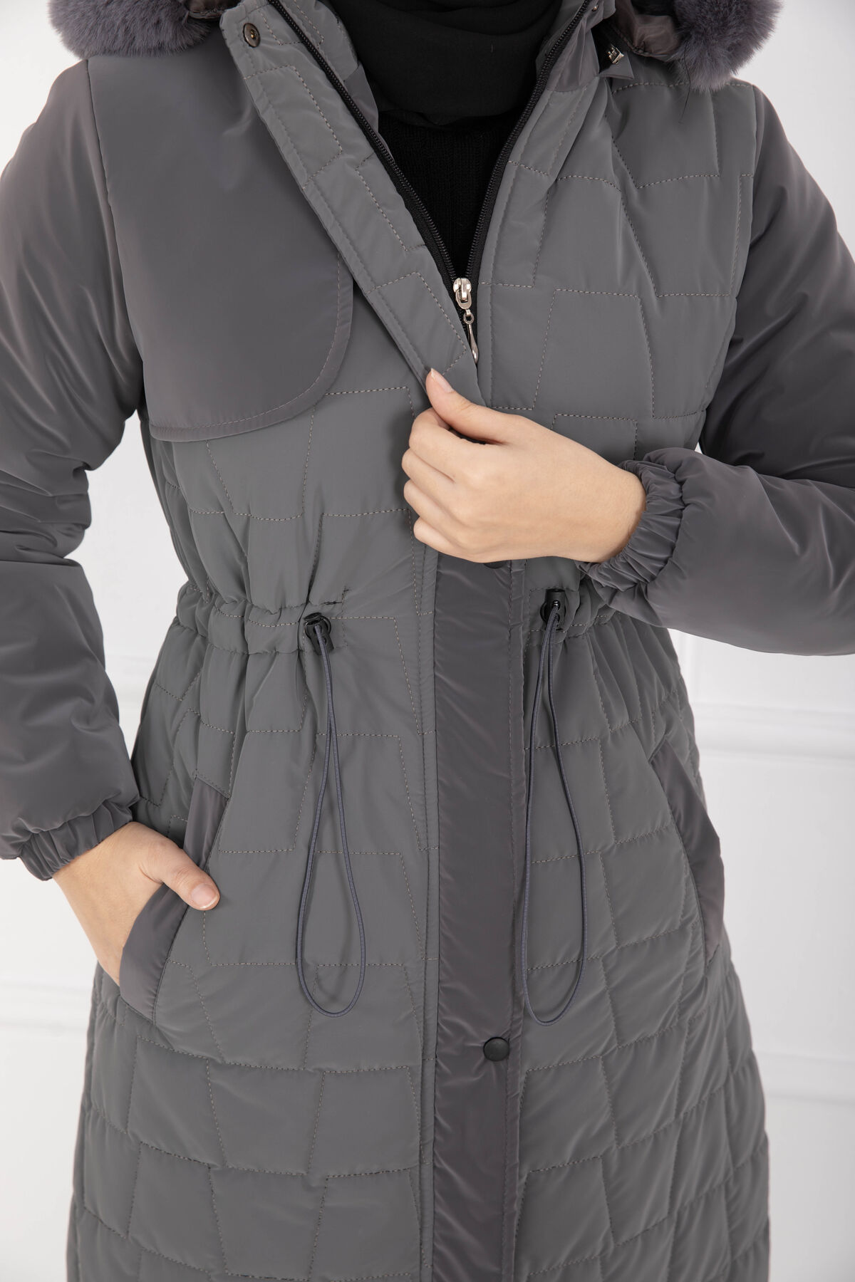 Kürk Kapüşonlu Beli Bağcıklı Nova Kaban Füme