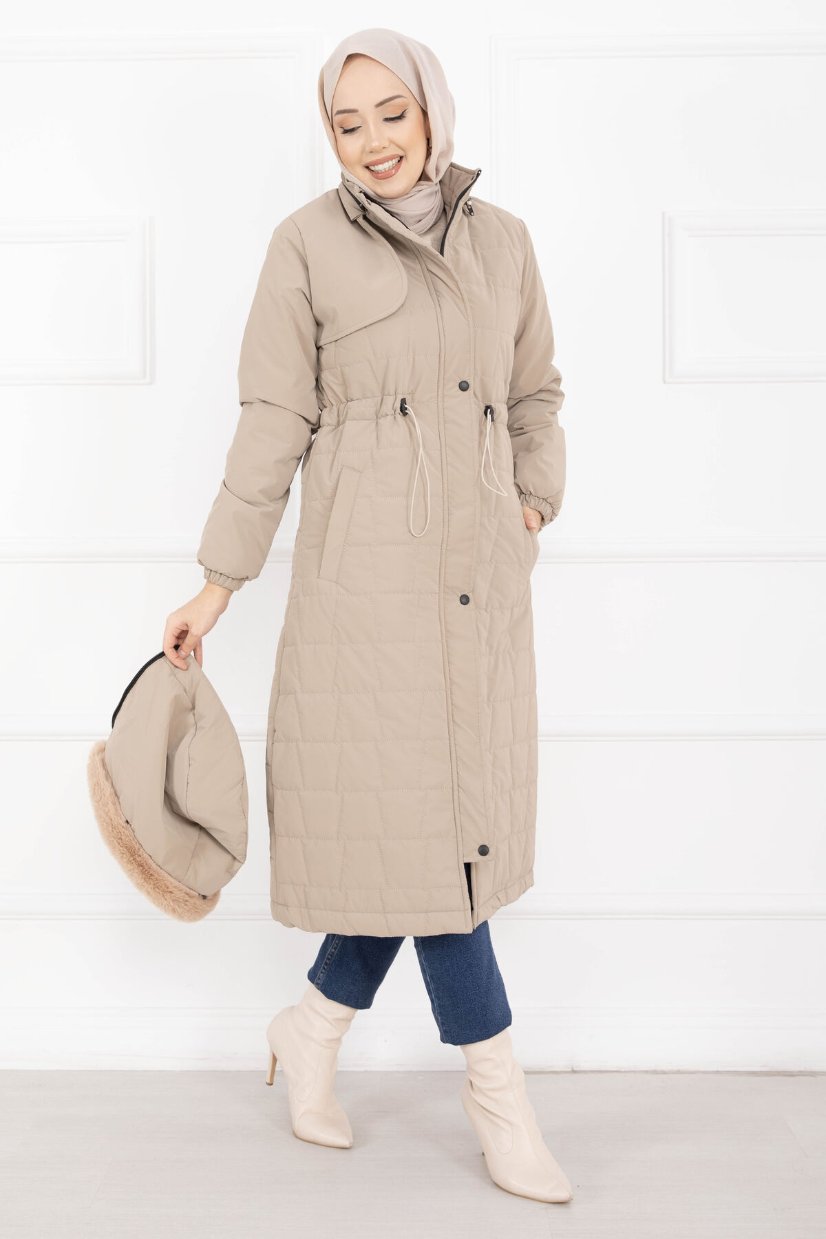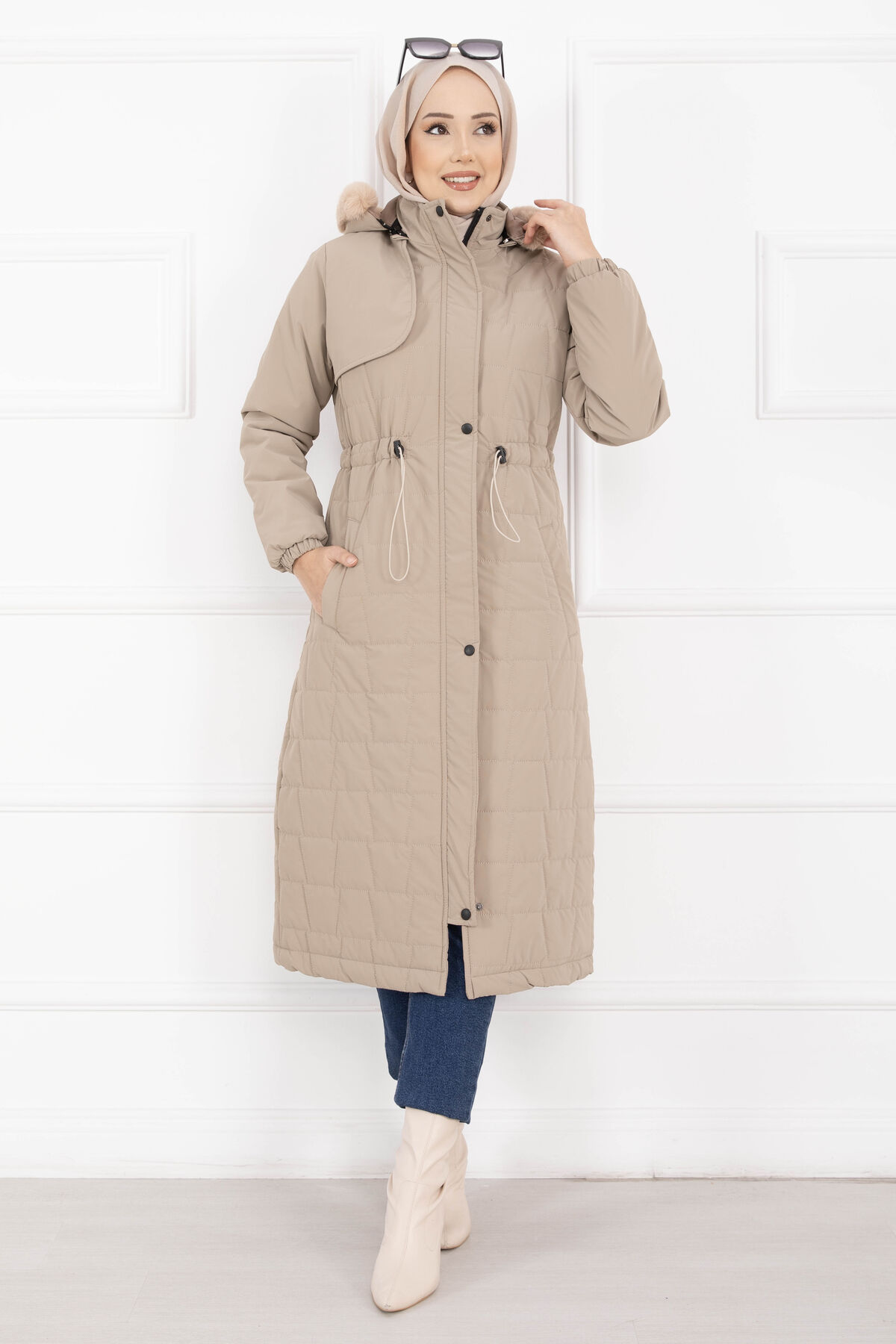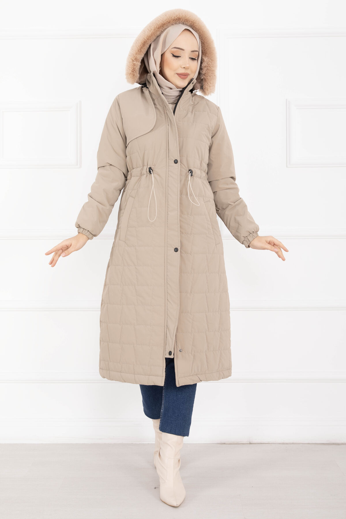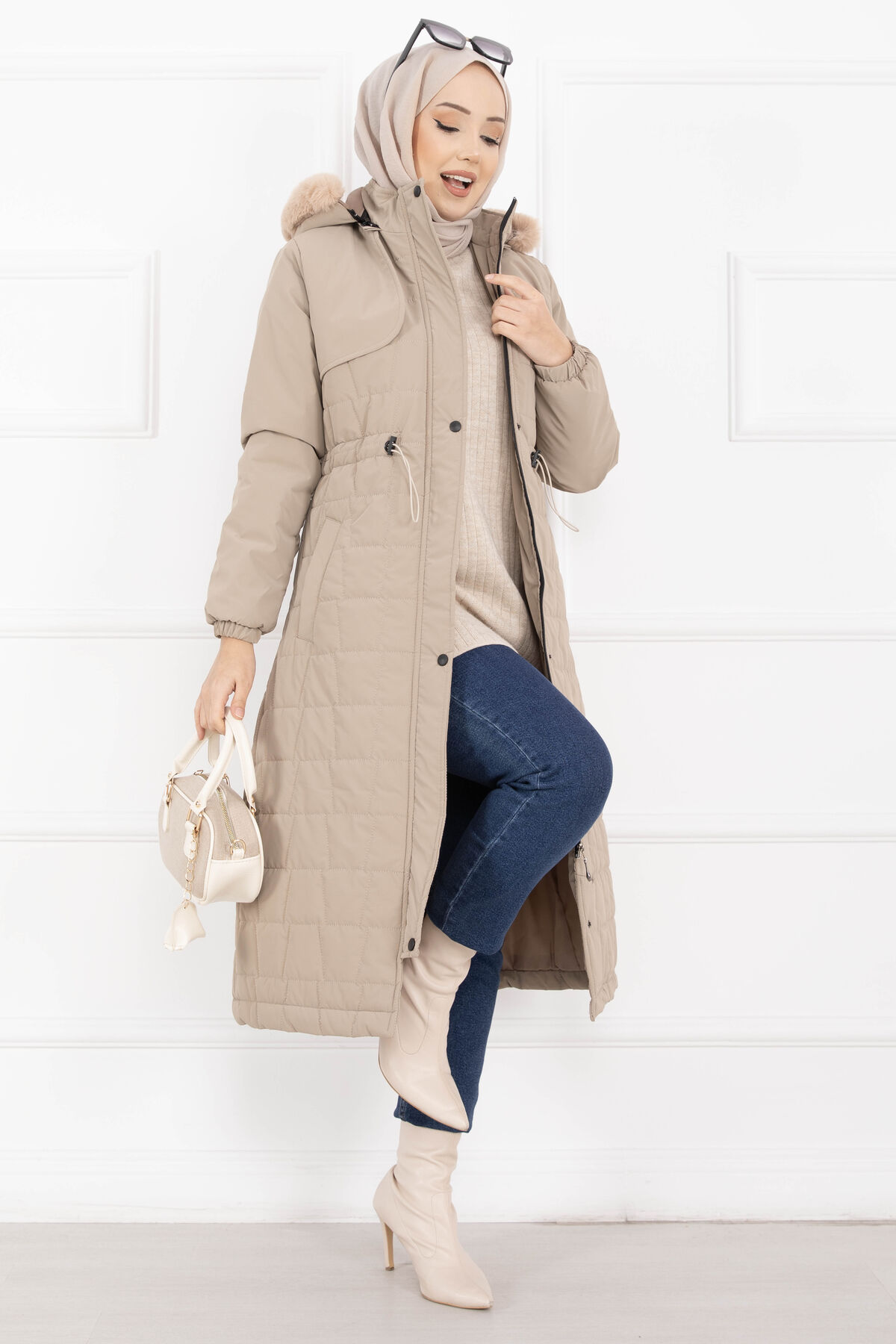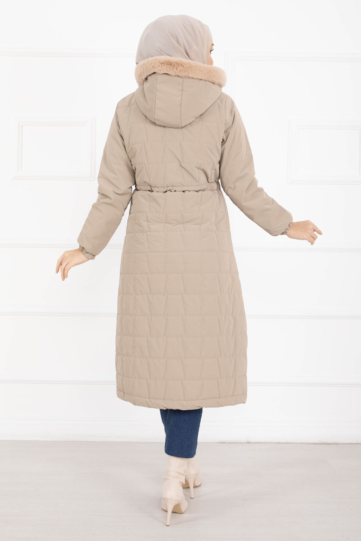 Kürk Kapüşonlu Beli Bağcıklı Nova Kaban Vizon