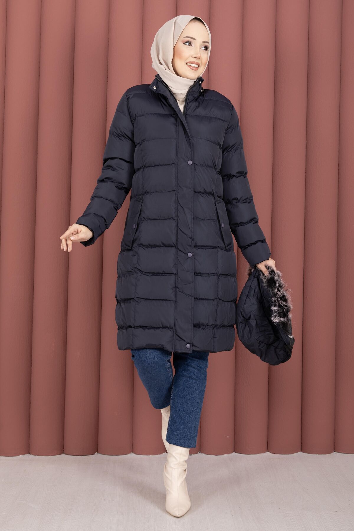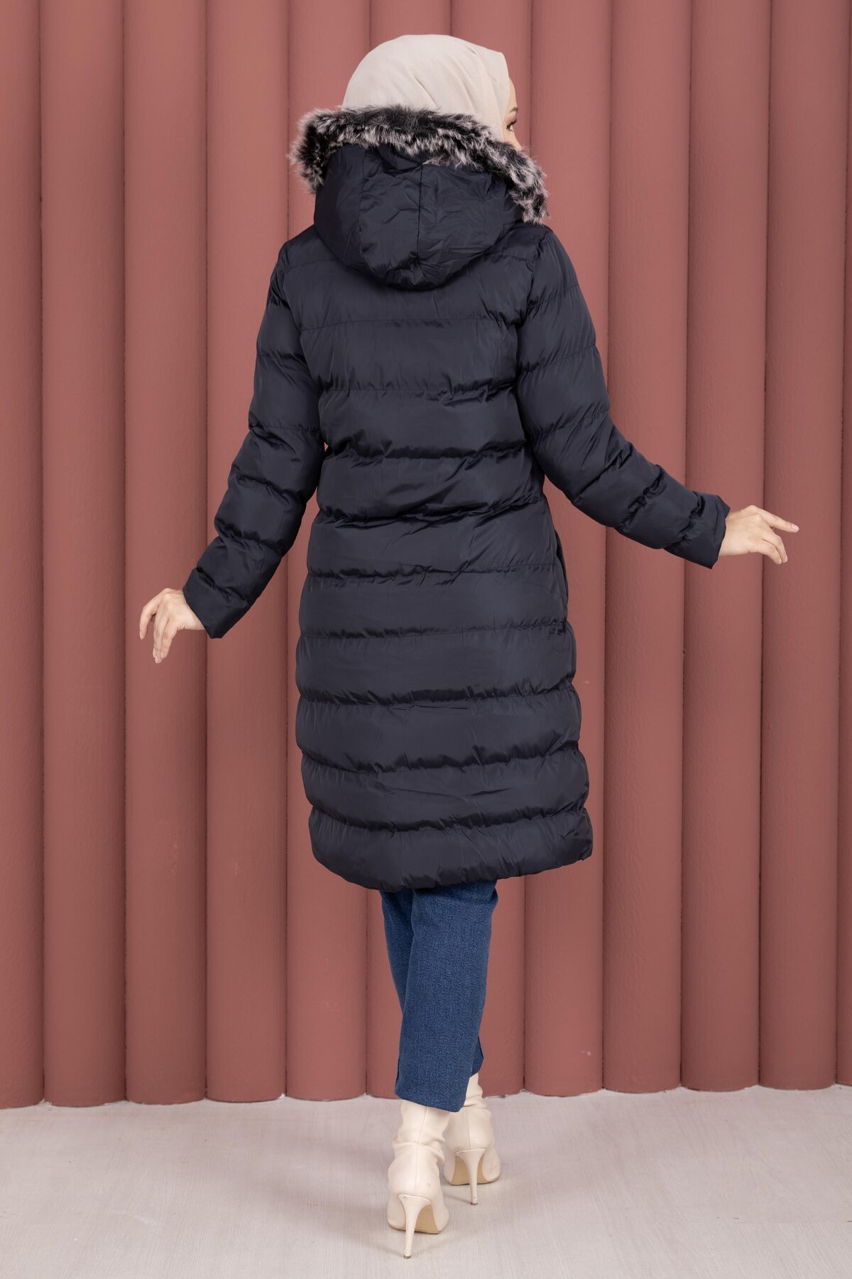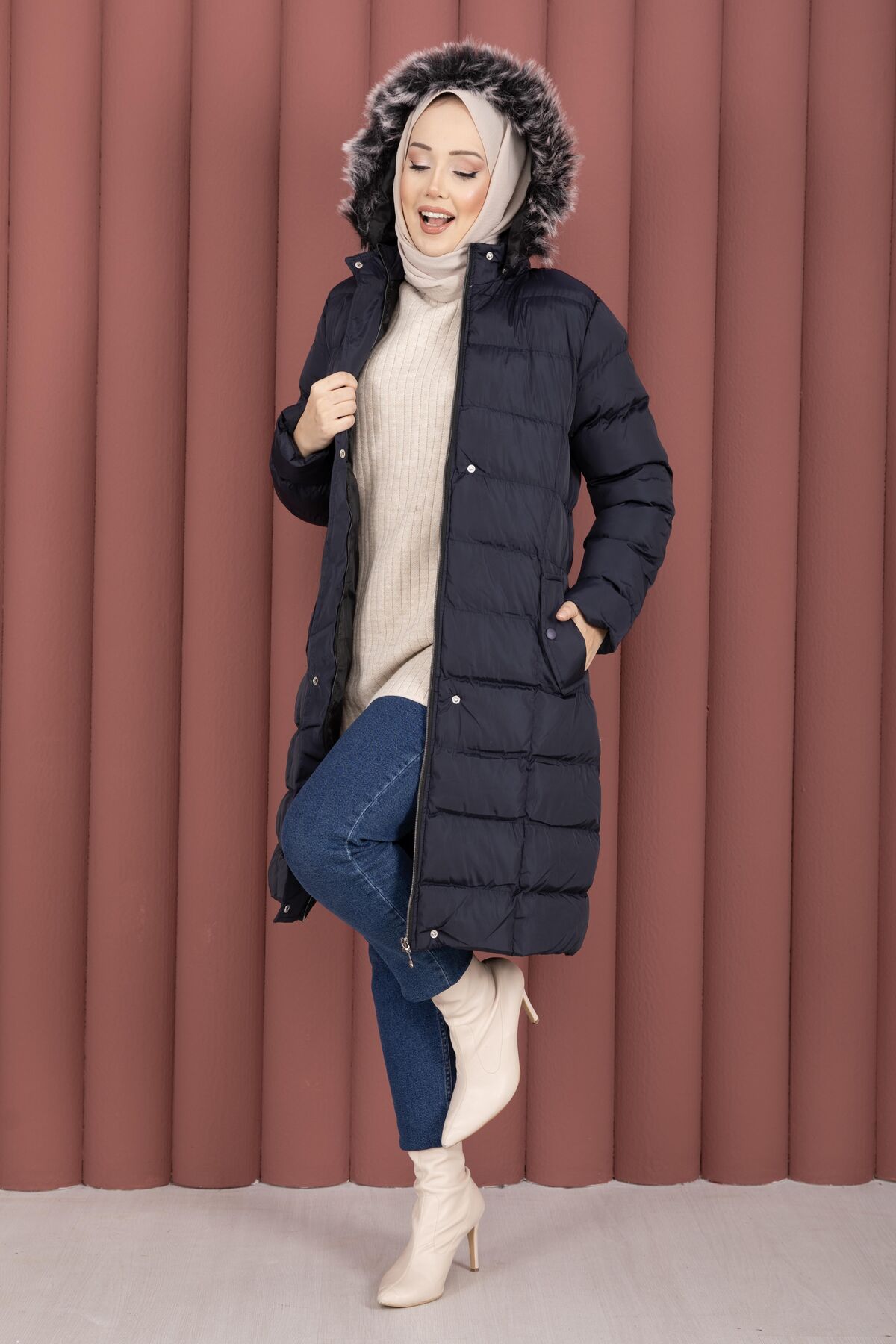 Kürk Kapüşonlu Çıtçıt Detaylı Şişme Mont Lacivert