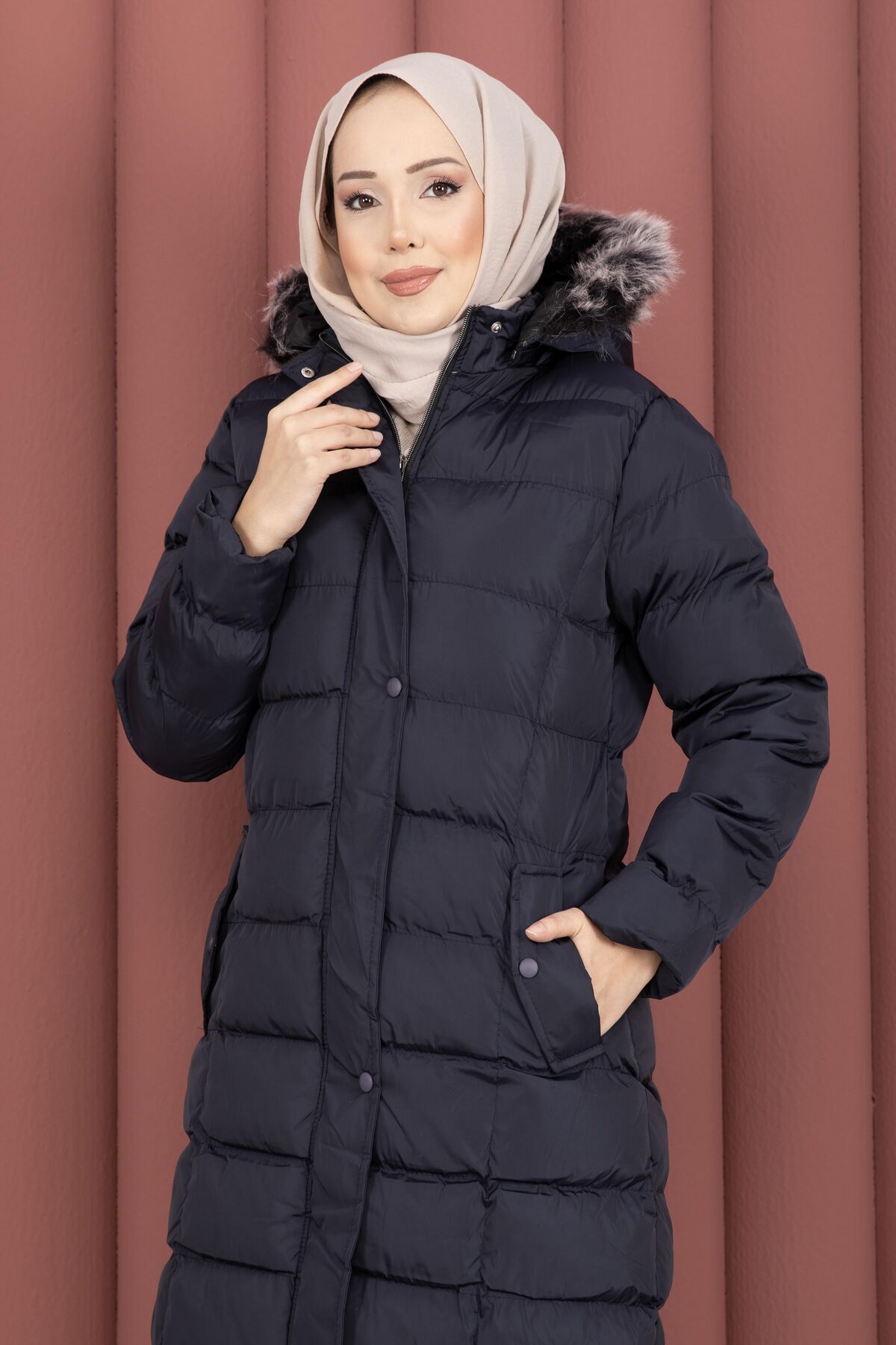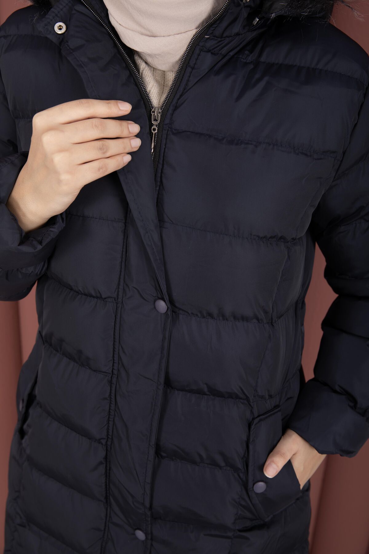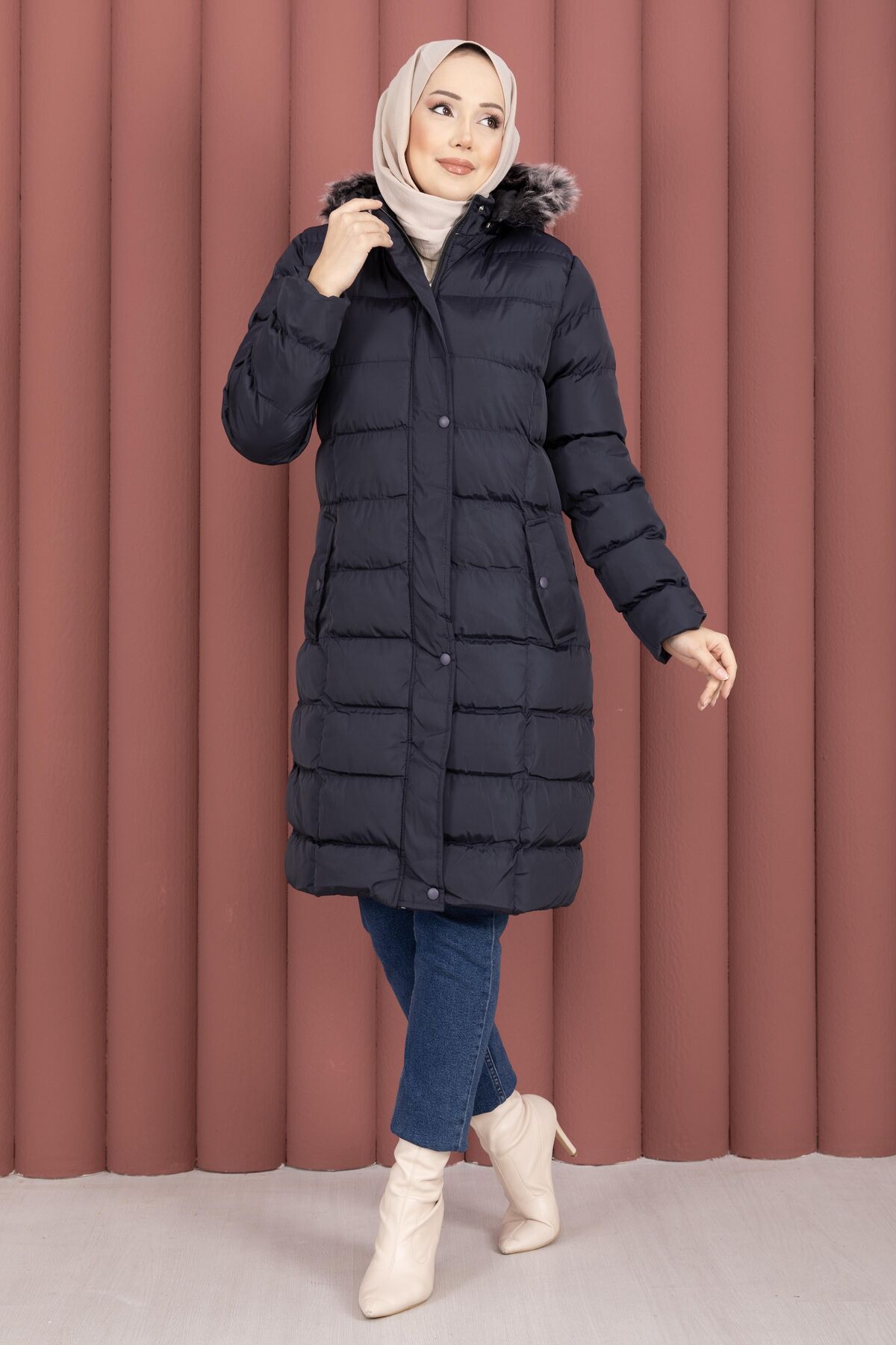 Kürk Kapüşonlu Çıtçıt Detaylı Şişme Mont Lacivert