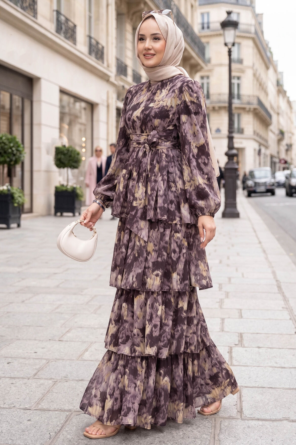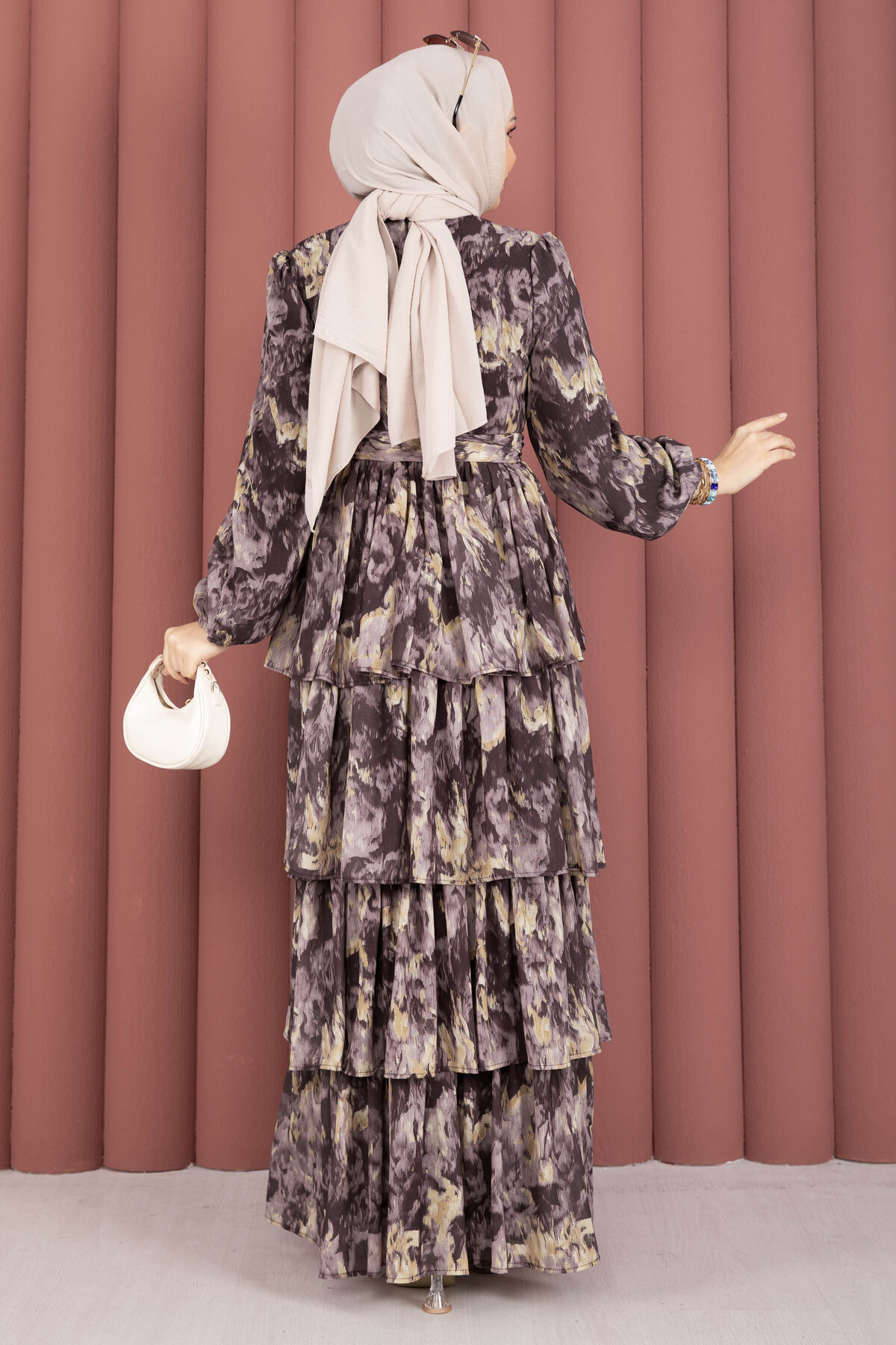 Kuşak Detaylı Yoryo Şifon Elbise Kahve