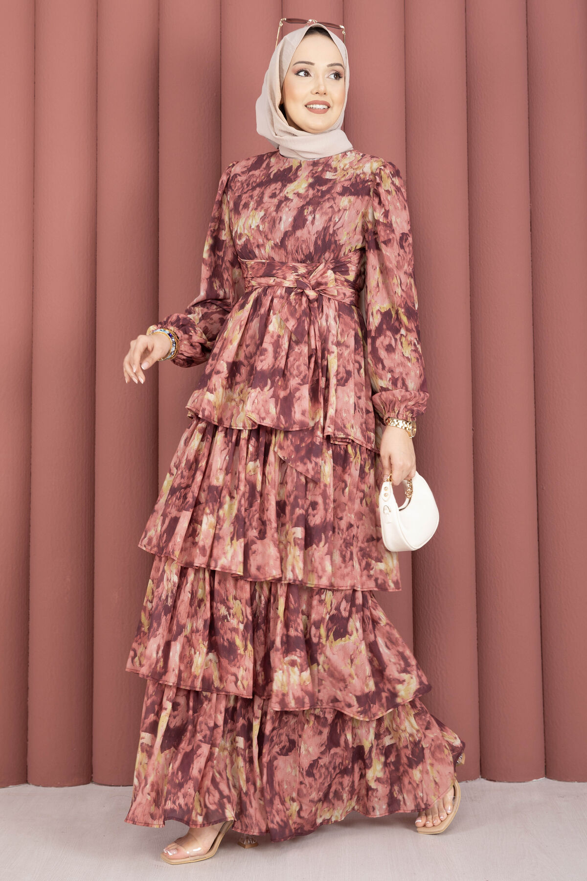Kuşak Detaylı Yoryo Şifon Elbise Mürdüm