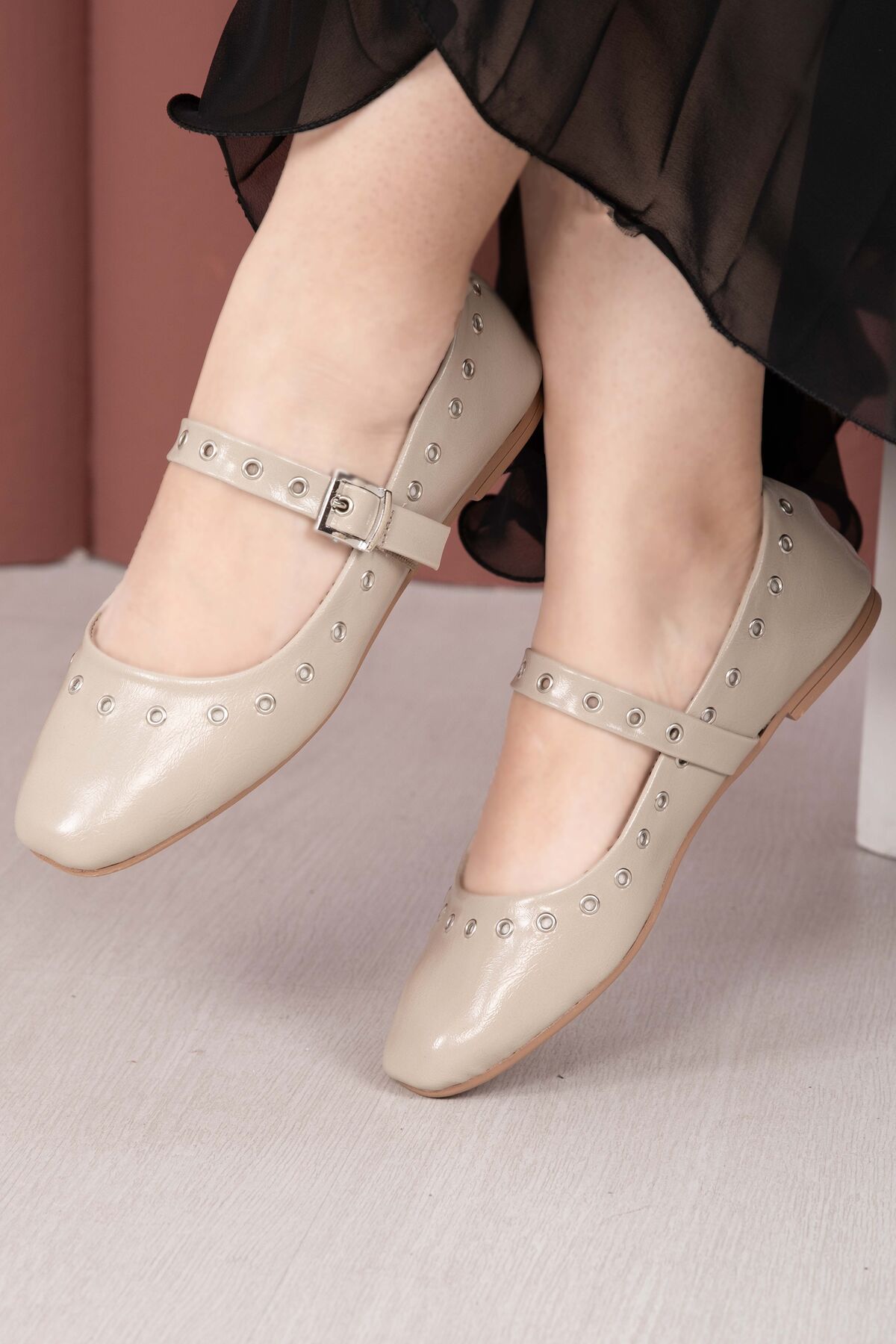 Kuşgözü Detaylı Mary Jane Babet Ayakkabı Bej