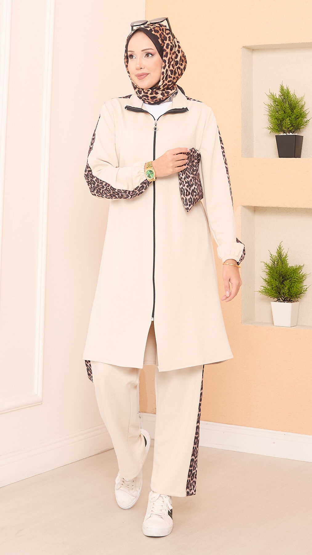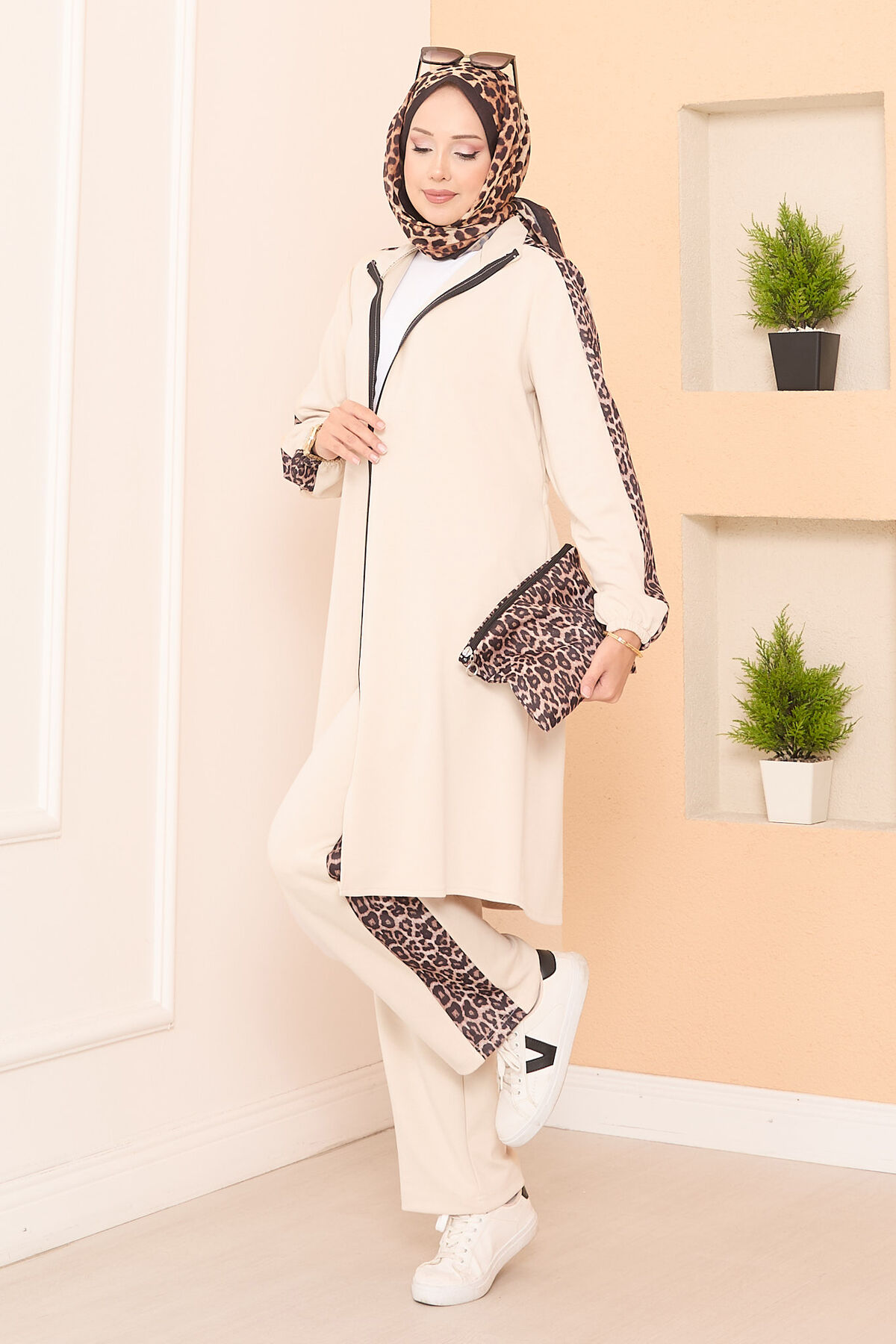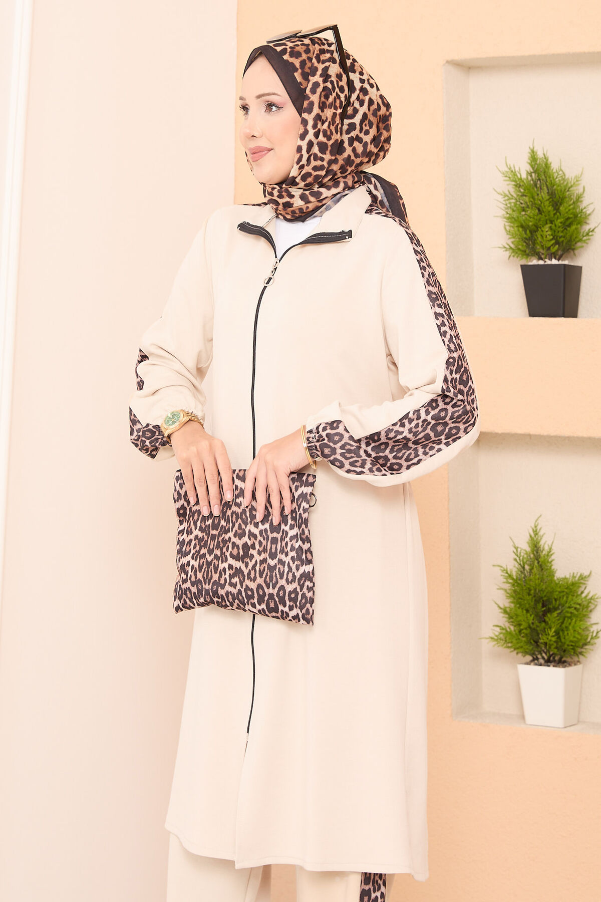 Leopar Şeritli Fermuarlı Oyşo Takım Bej