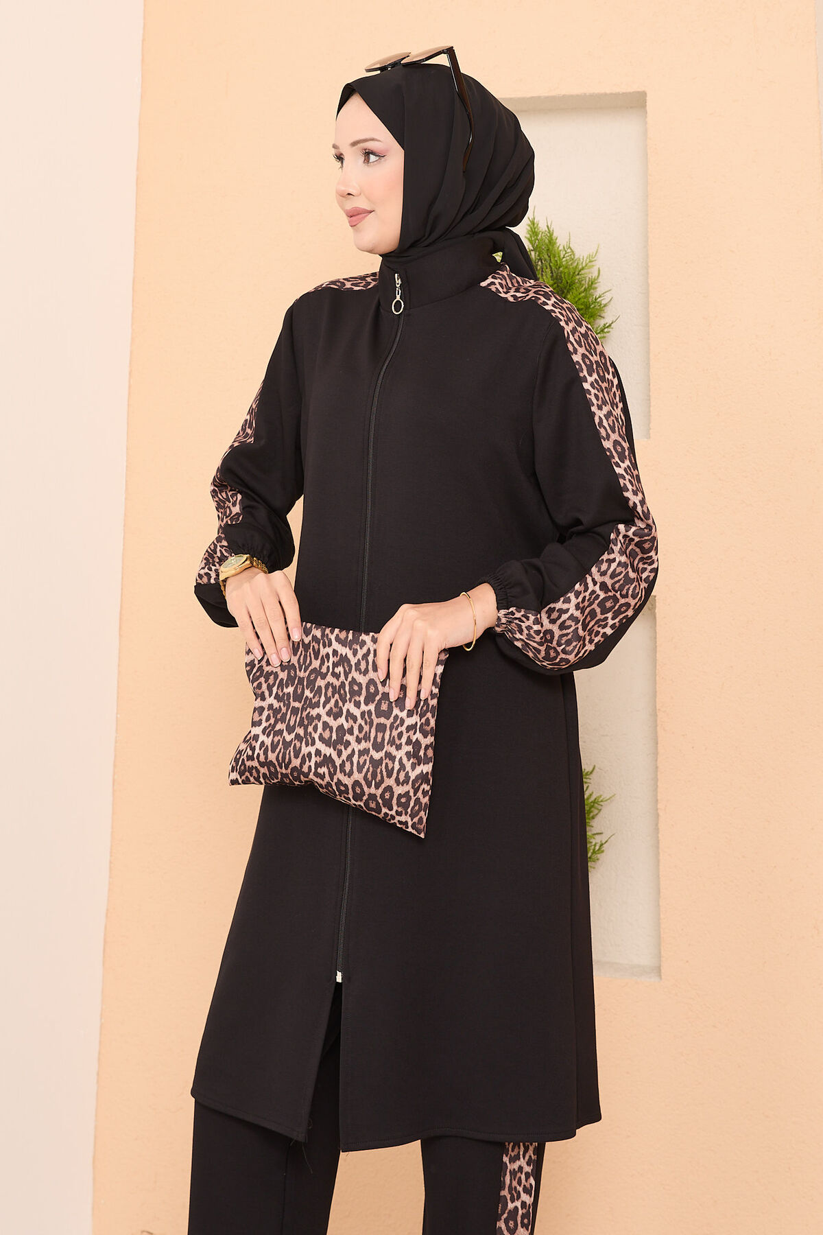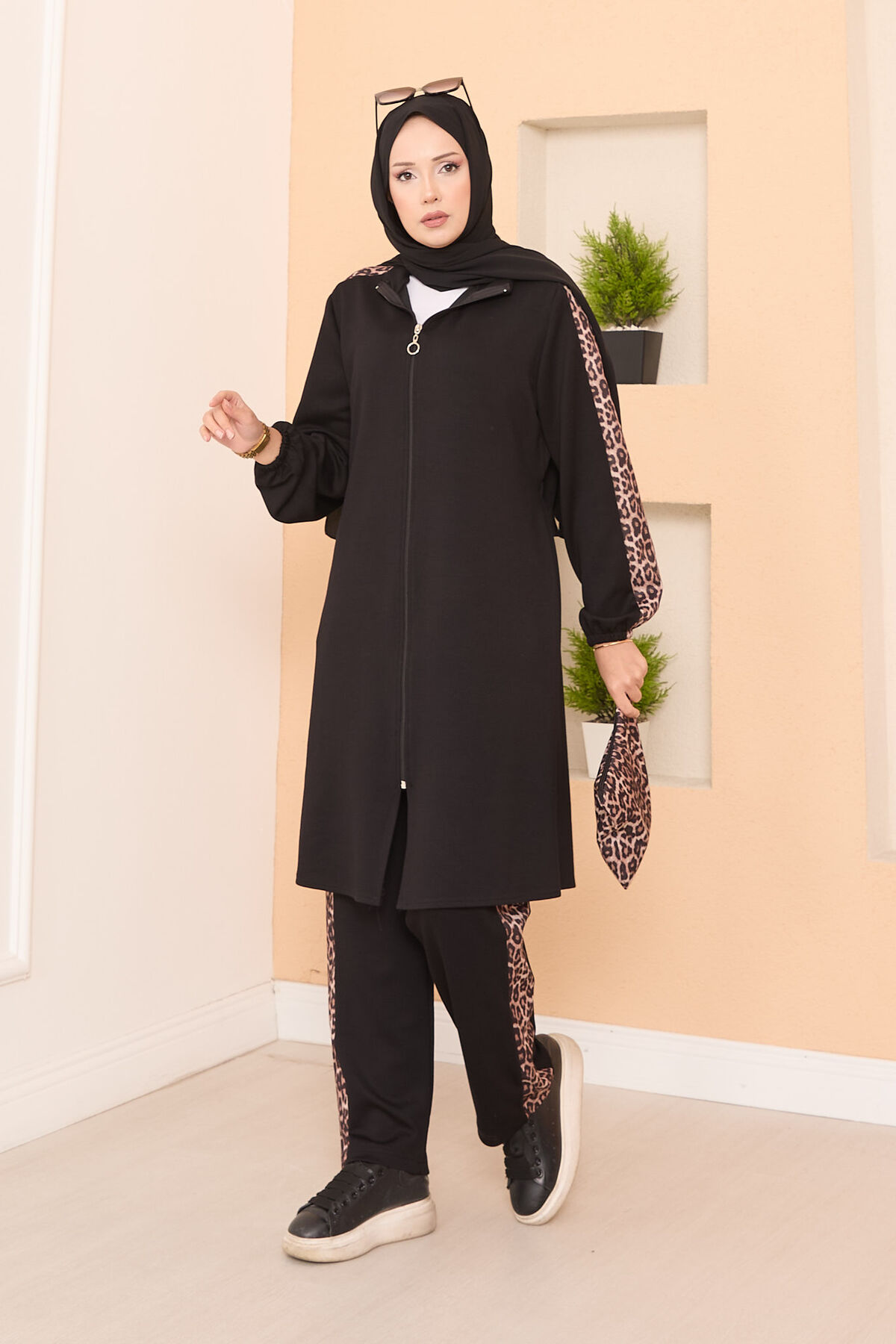 Leopar Şeritli Fermuarlı Oyşo Takım Siyah