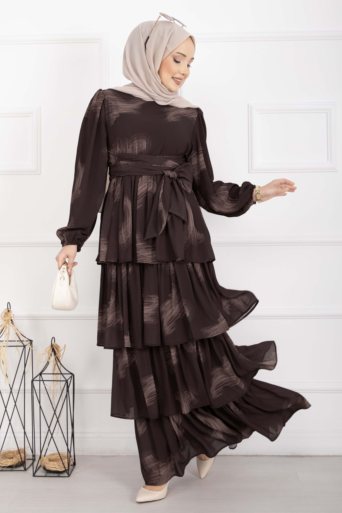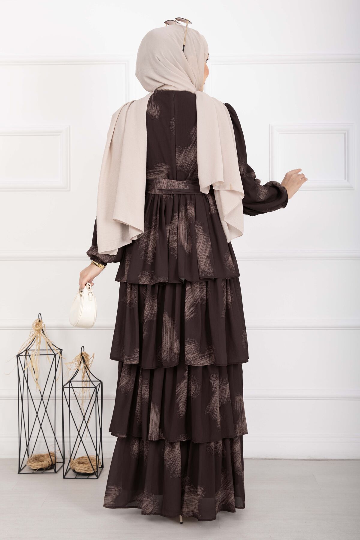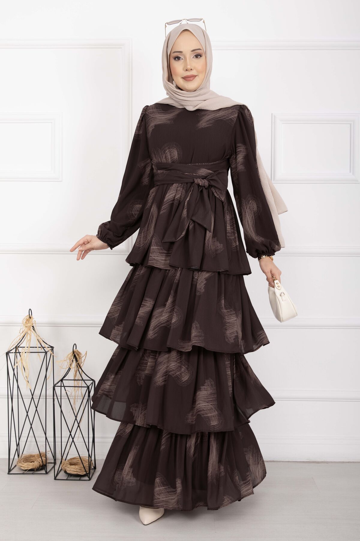 Liva Kuşaklı Kat Kat Elbise Kahve