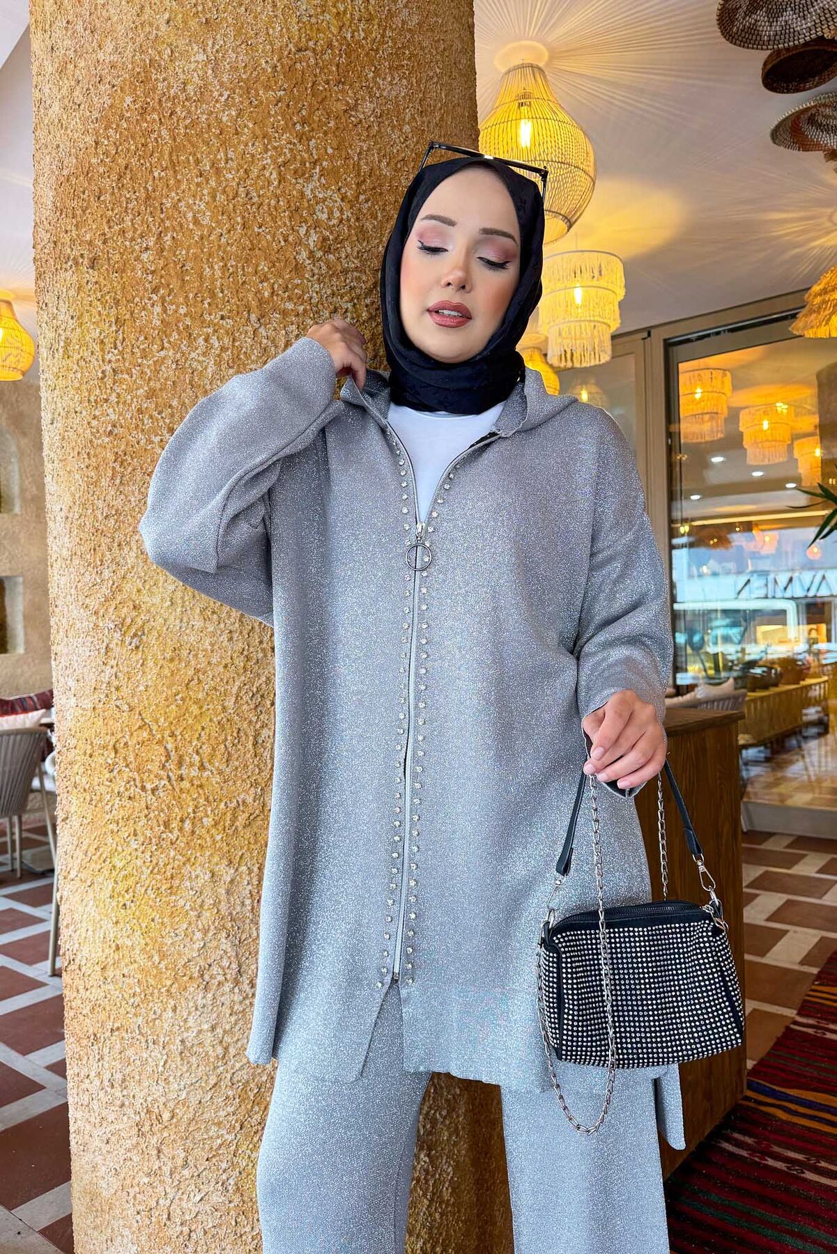 Lüks Taş Şeritli Simli Triko İkili Takım Gri