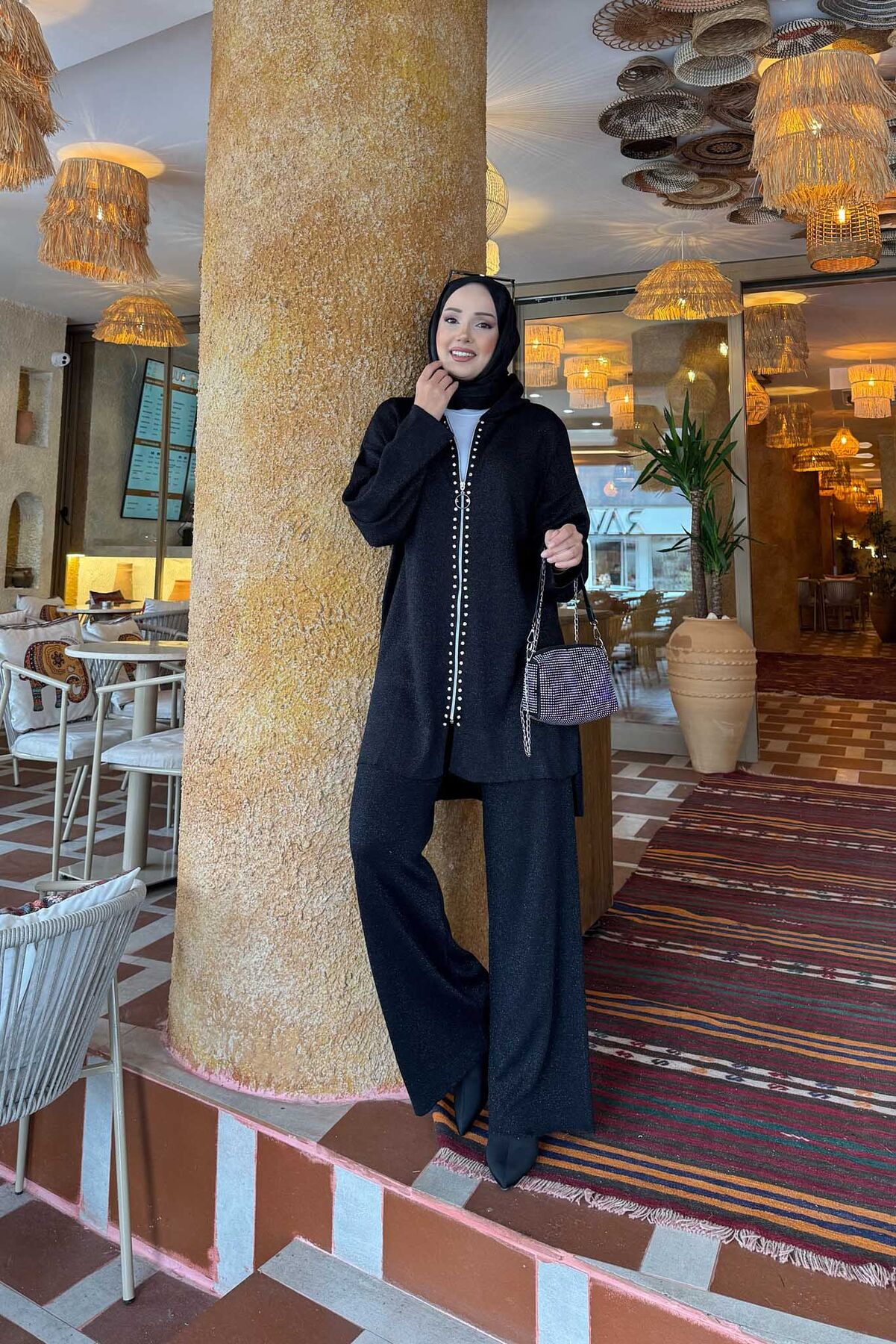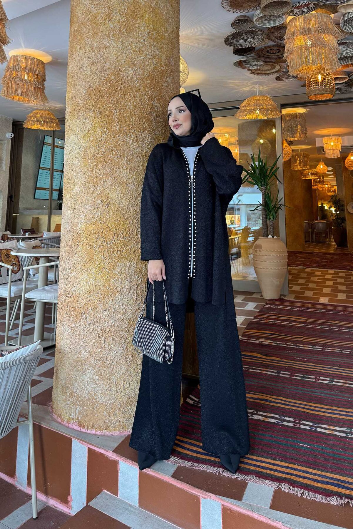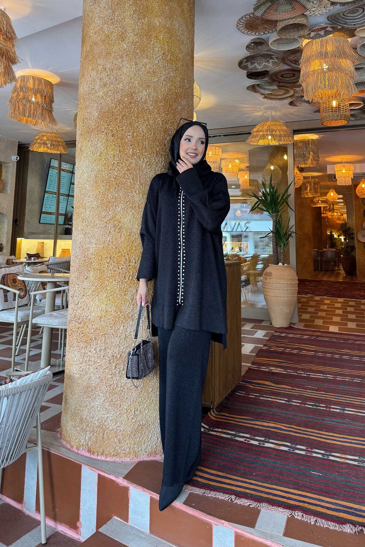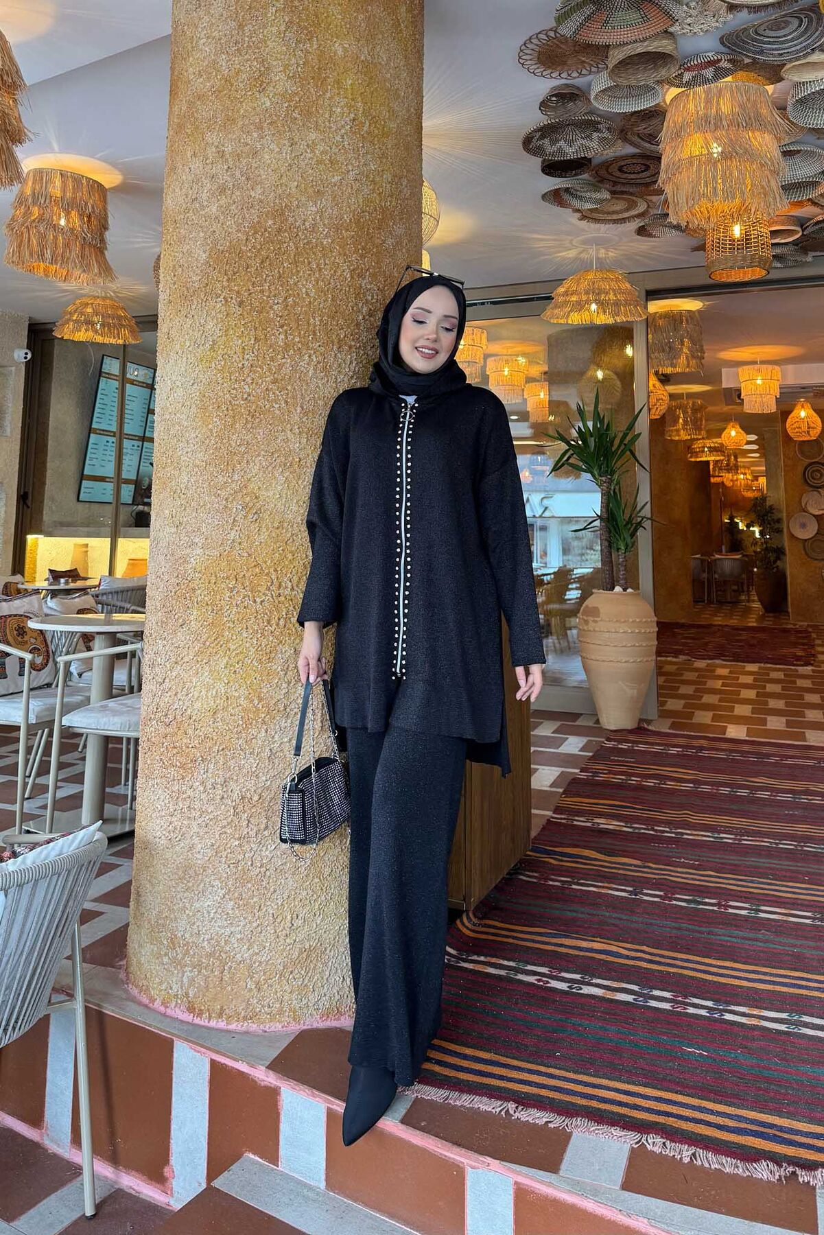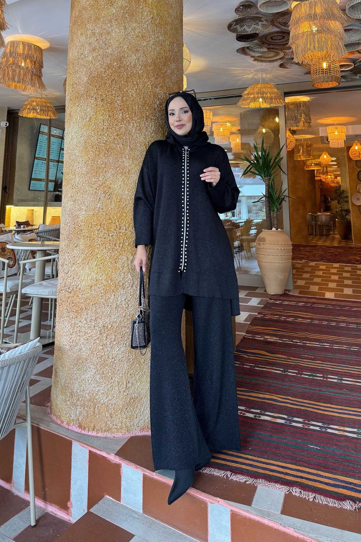 Lüks Taş Şeritli Simli Triko İkili Takım Siyah