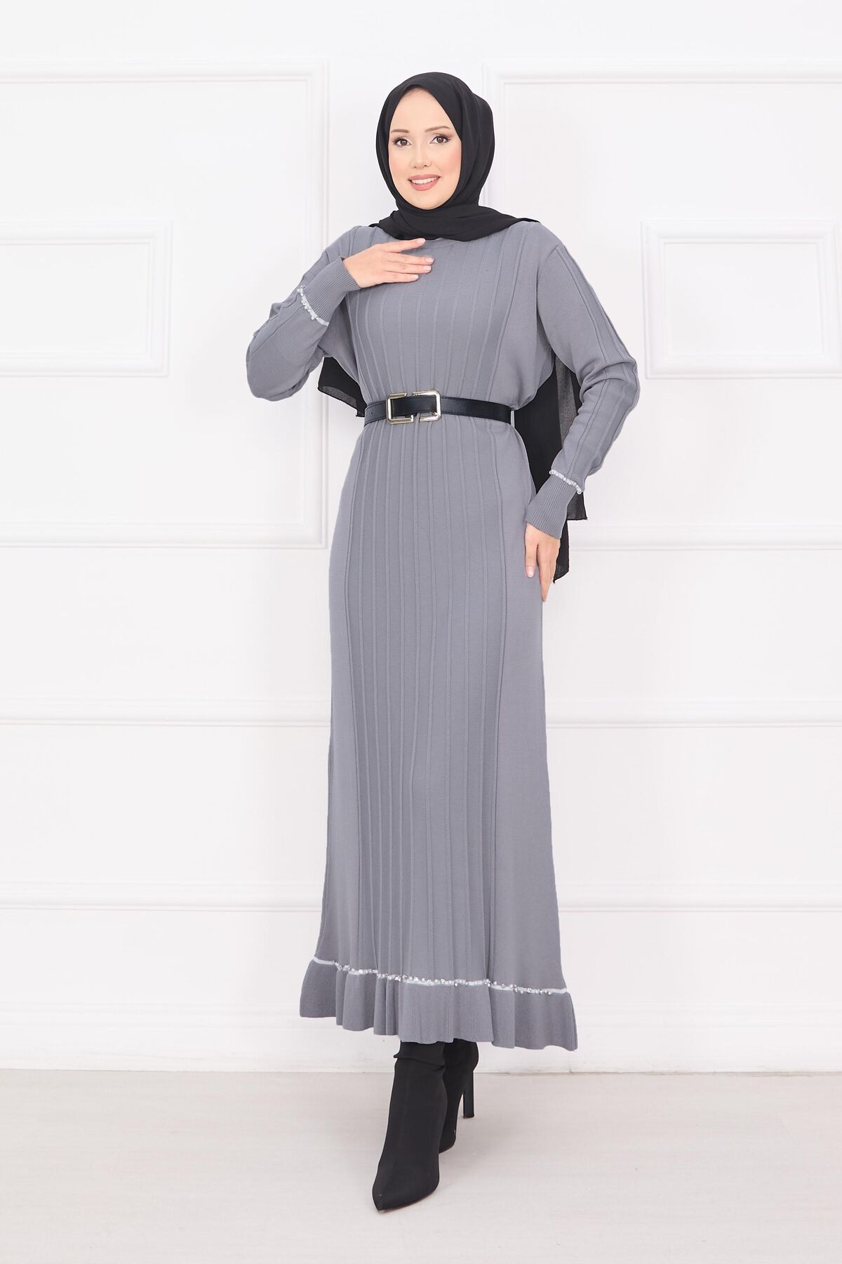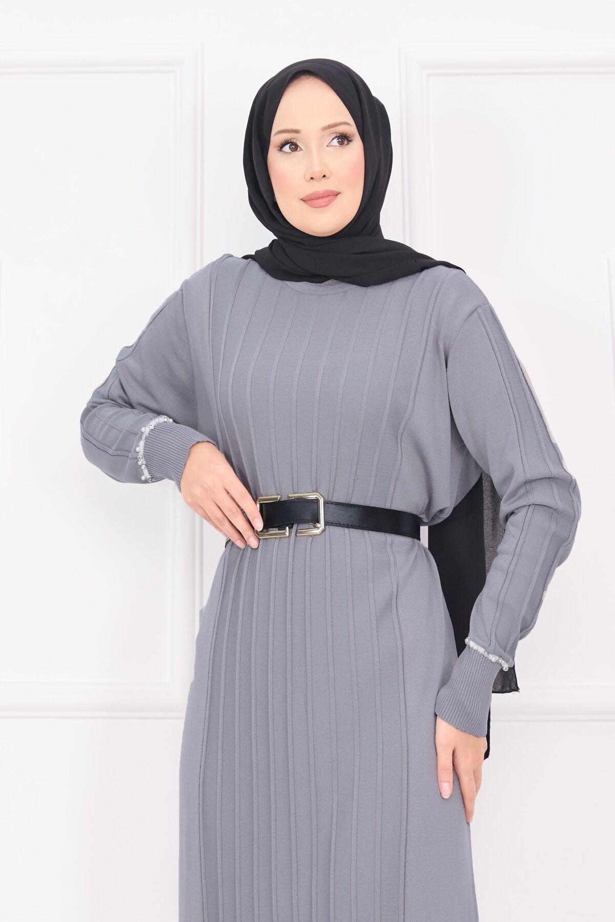 Manşeti Ve Eteği Taş İşlemeli Tesettür Triko Elbise Gri Yorumları