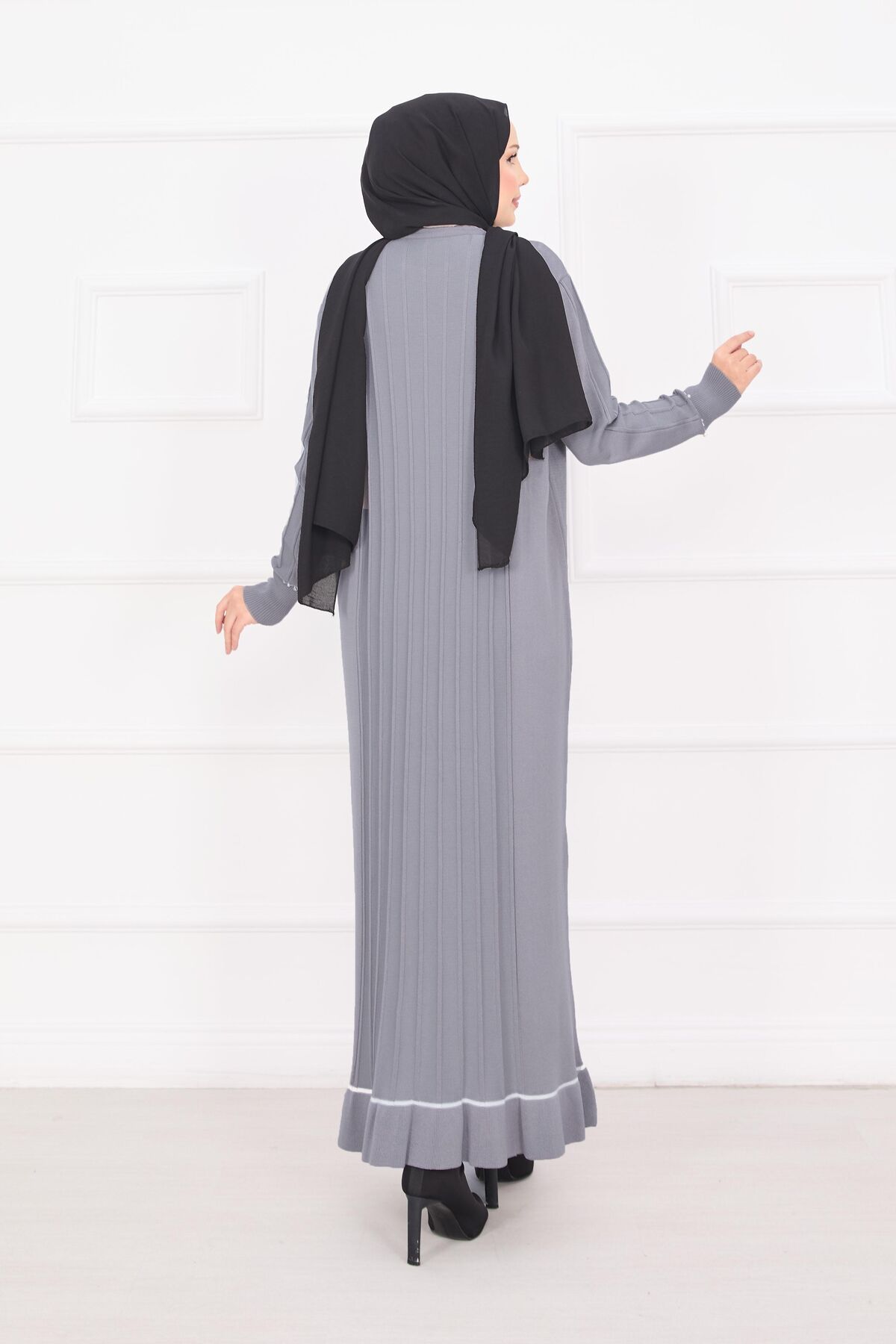 Manşeti Ve Eteği Taş İşlemeli Tesettür Triko Elbise Gri