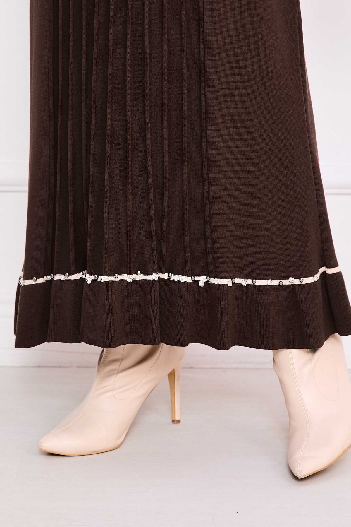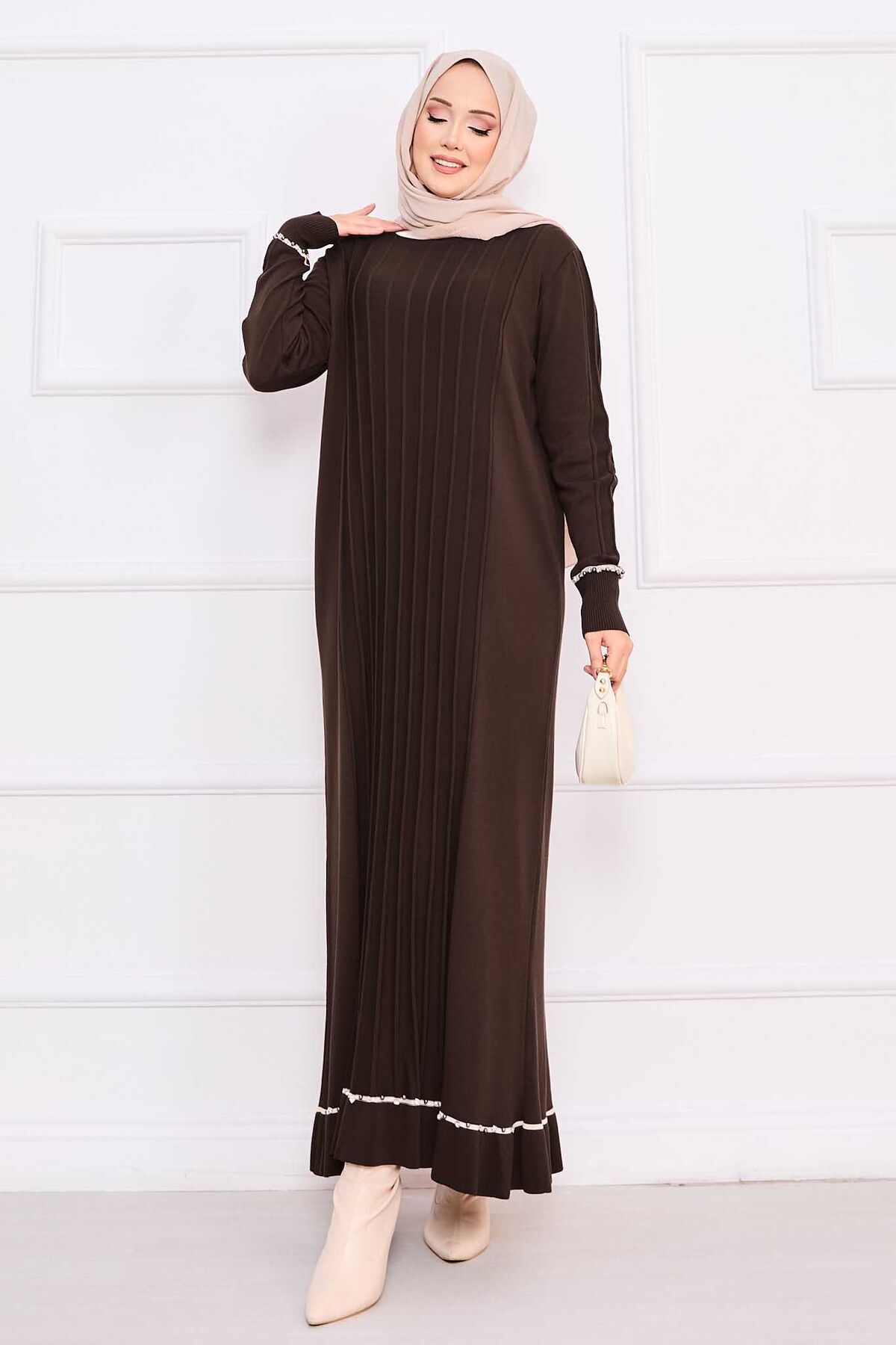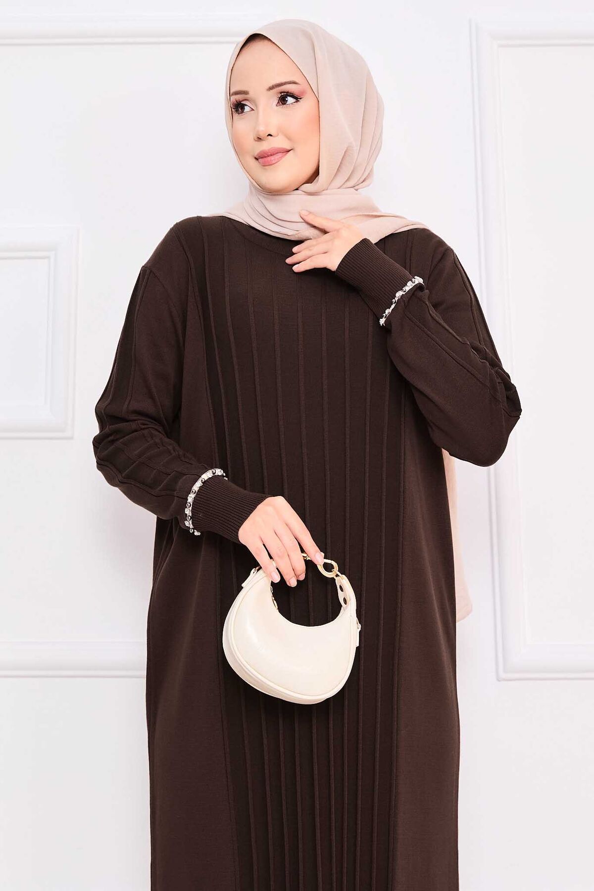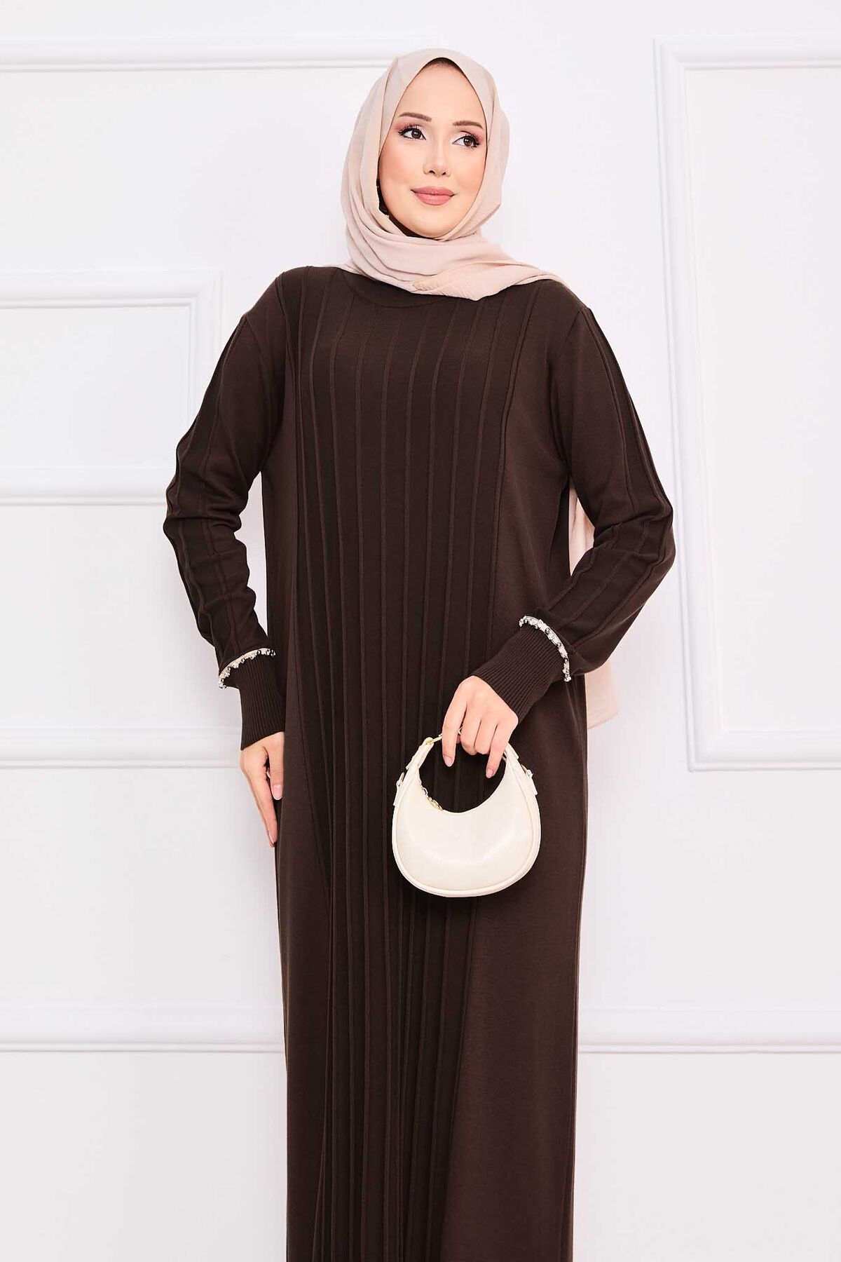 Manşeti Ve Eteği Taş İşlemeli Tesettür Triko Elbise Kahve