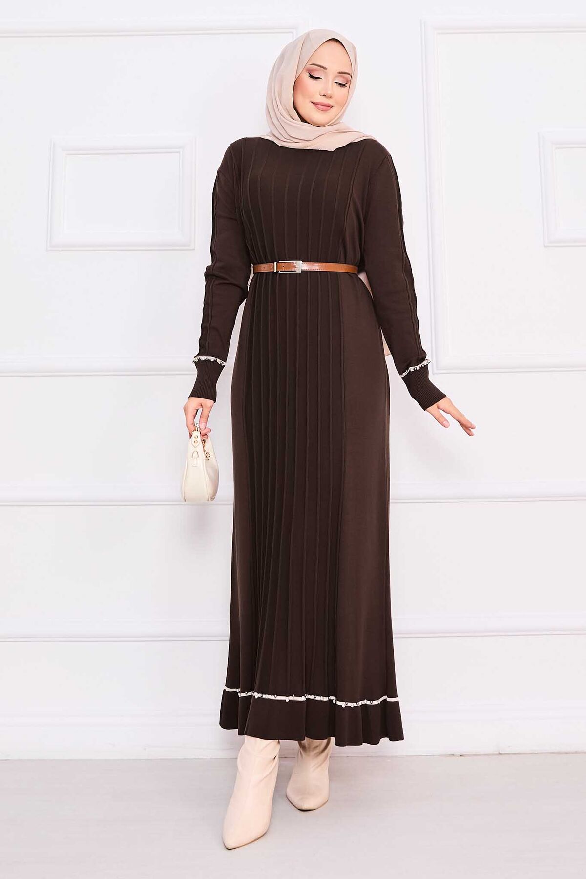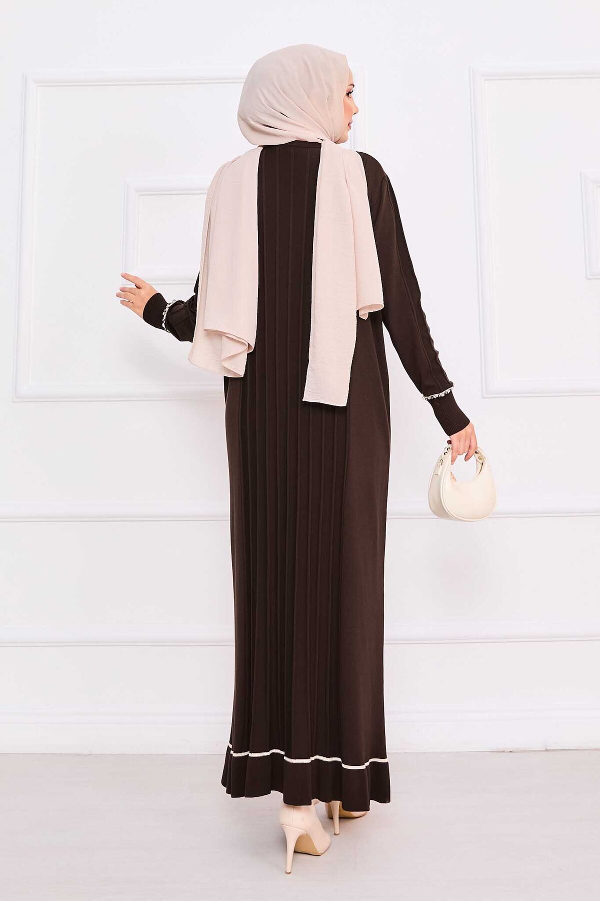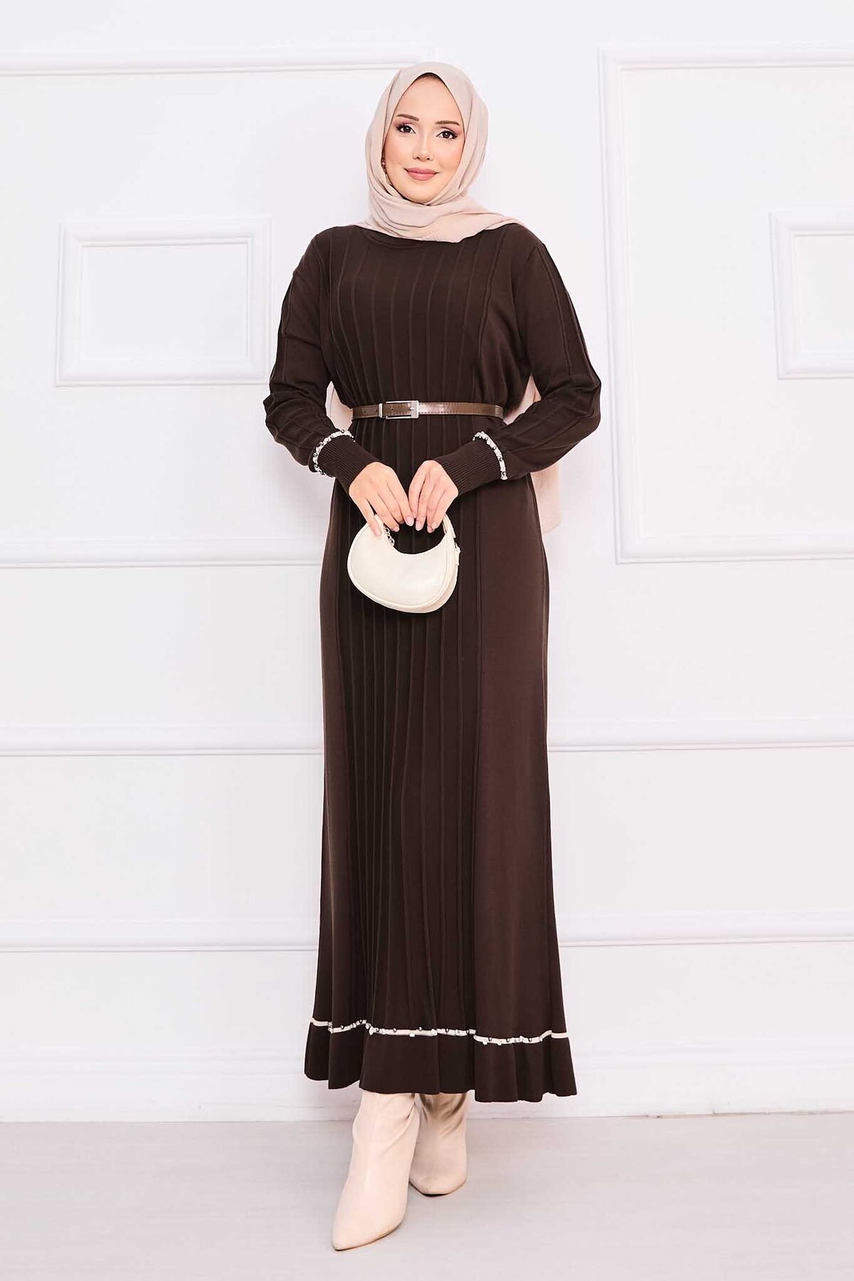 Manşeti Ve Eteği Taş İşlemeli Tesettür Triko Elbise Kahve