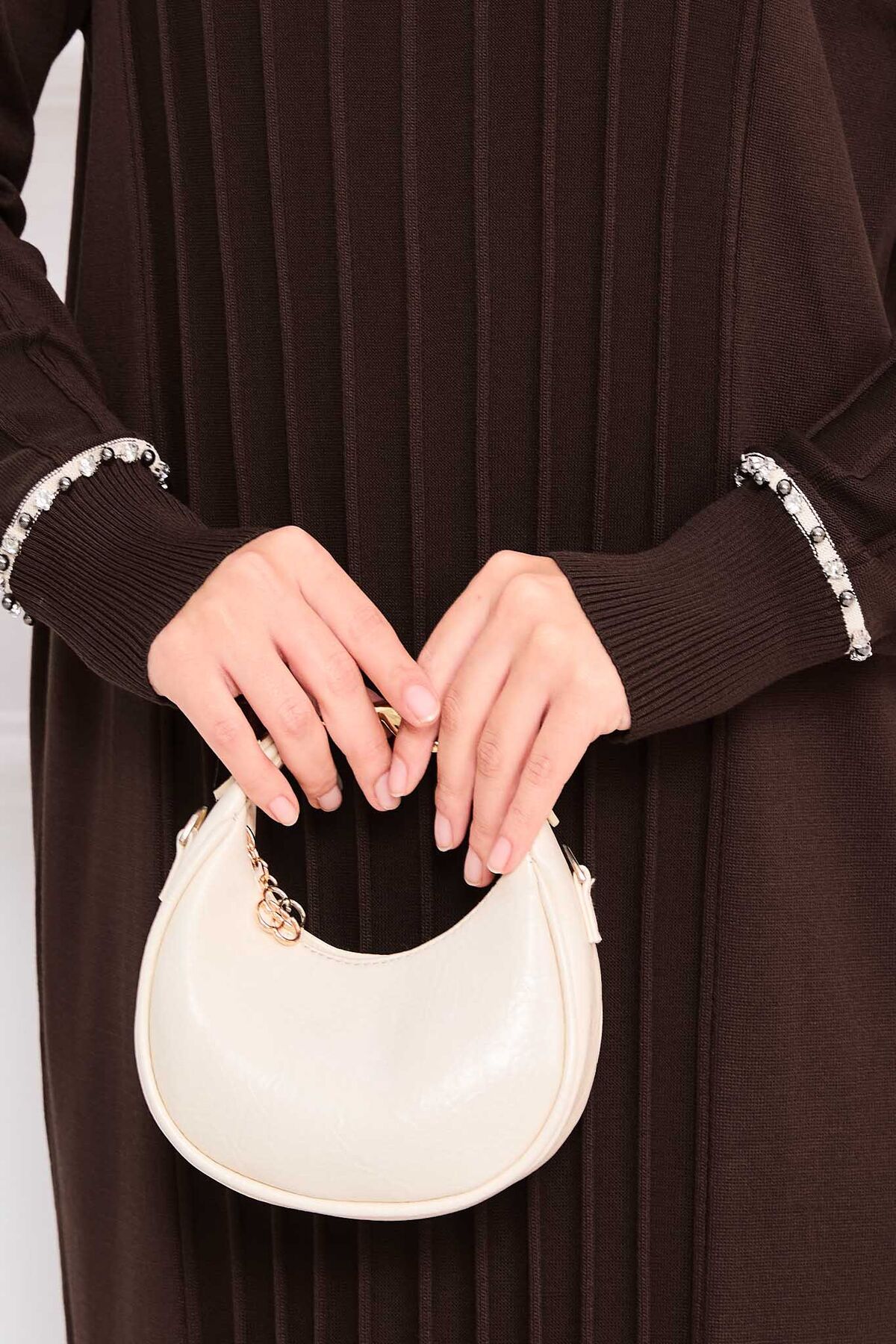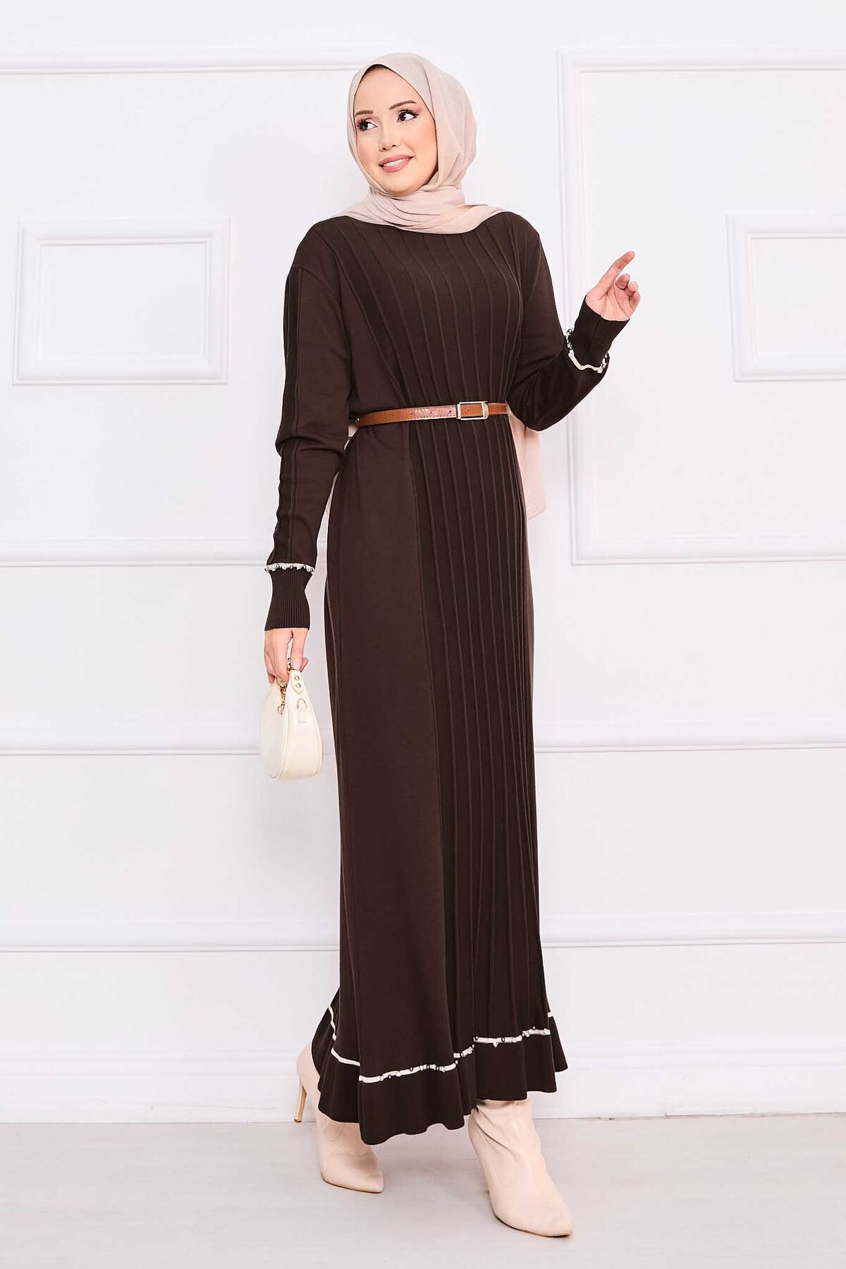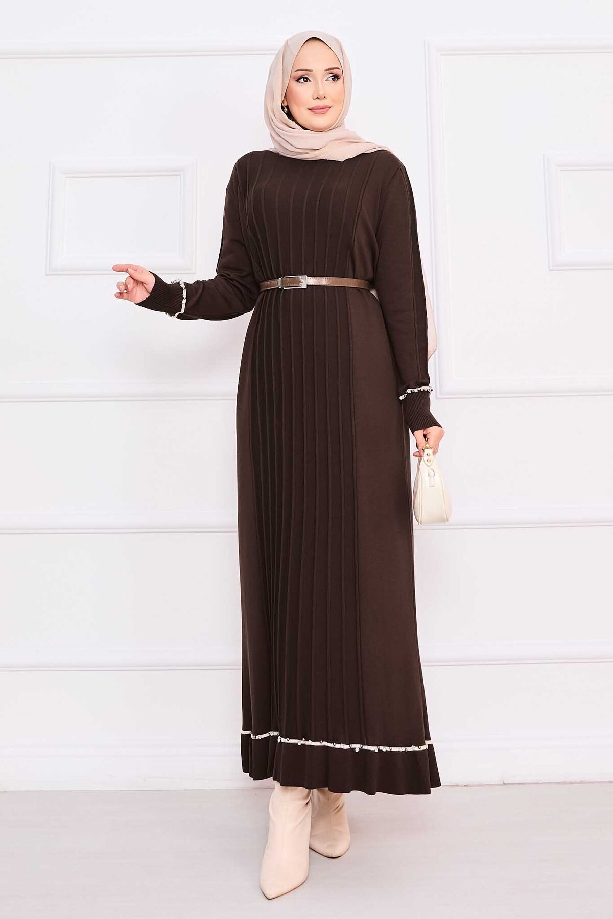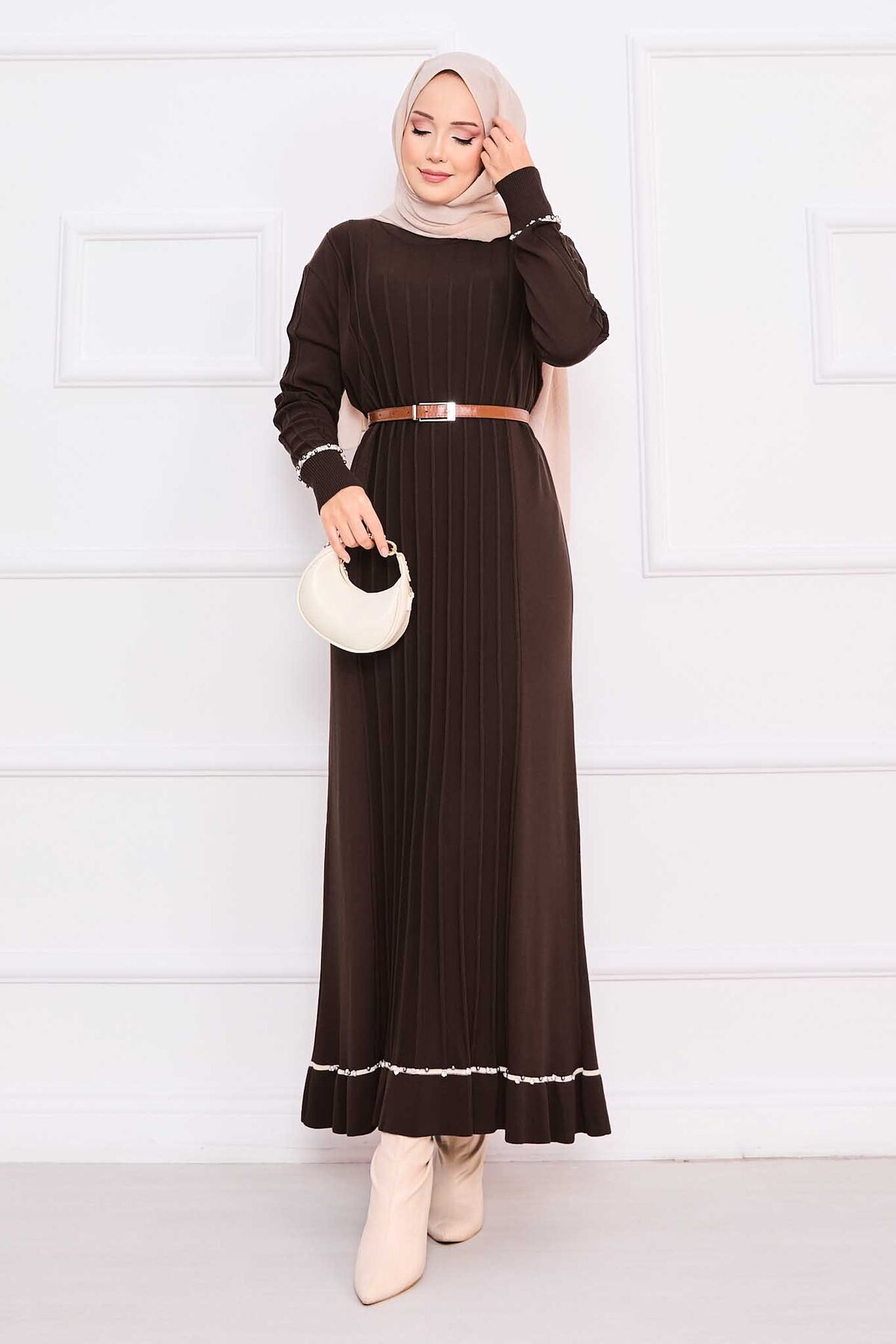 Manşeti Ve Eteği Taş İşlemeli Tesettür Triko Elbise Kahve