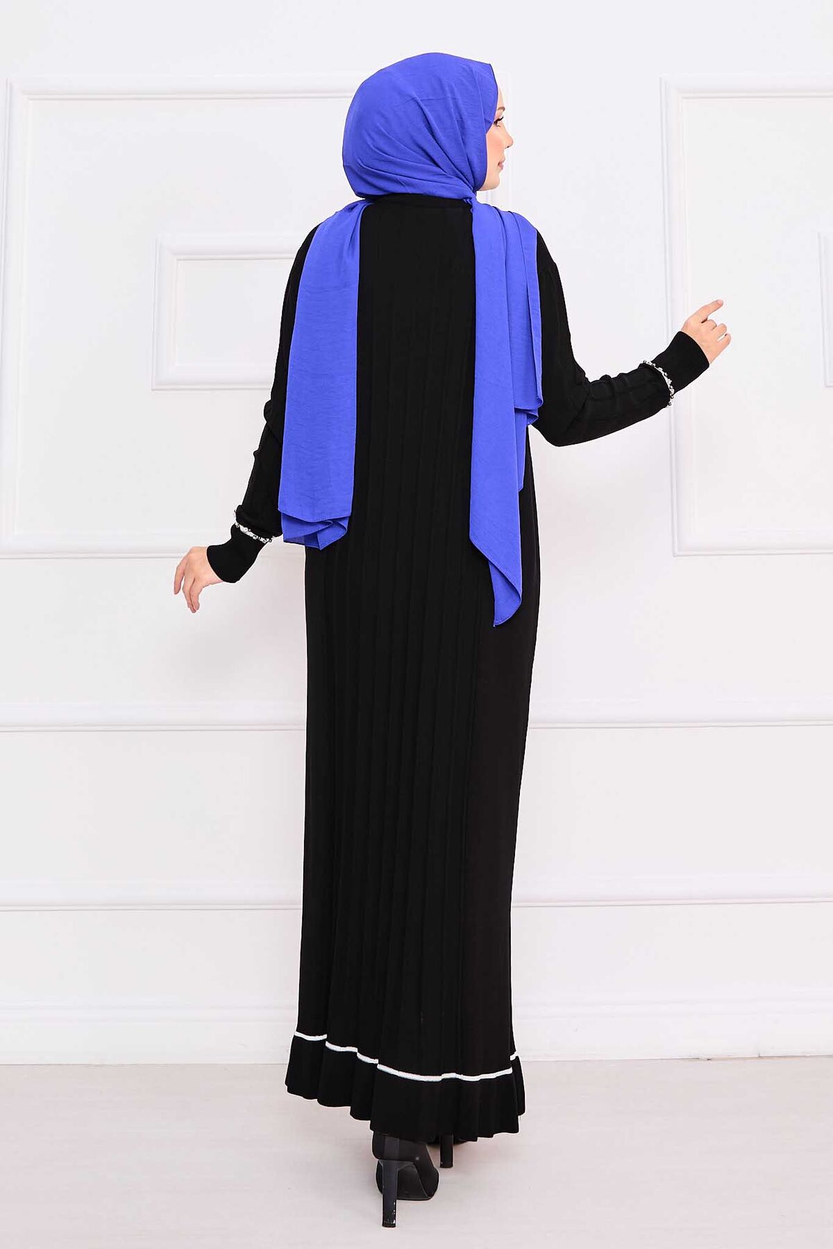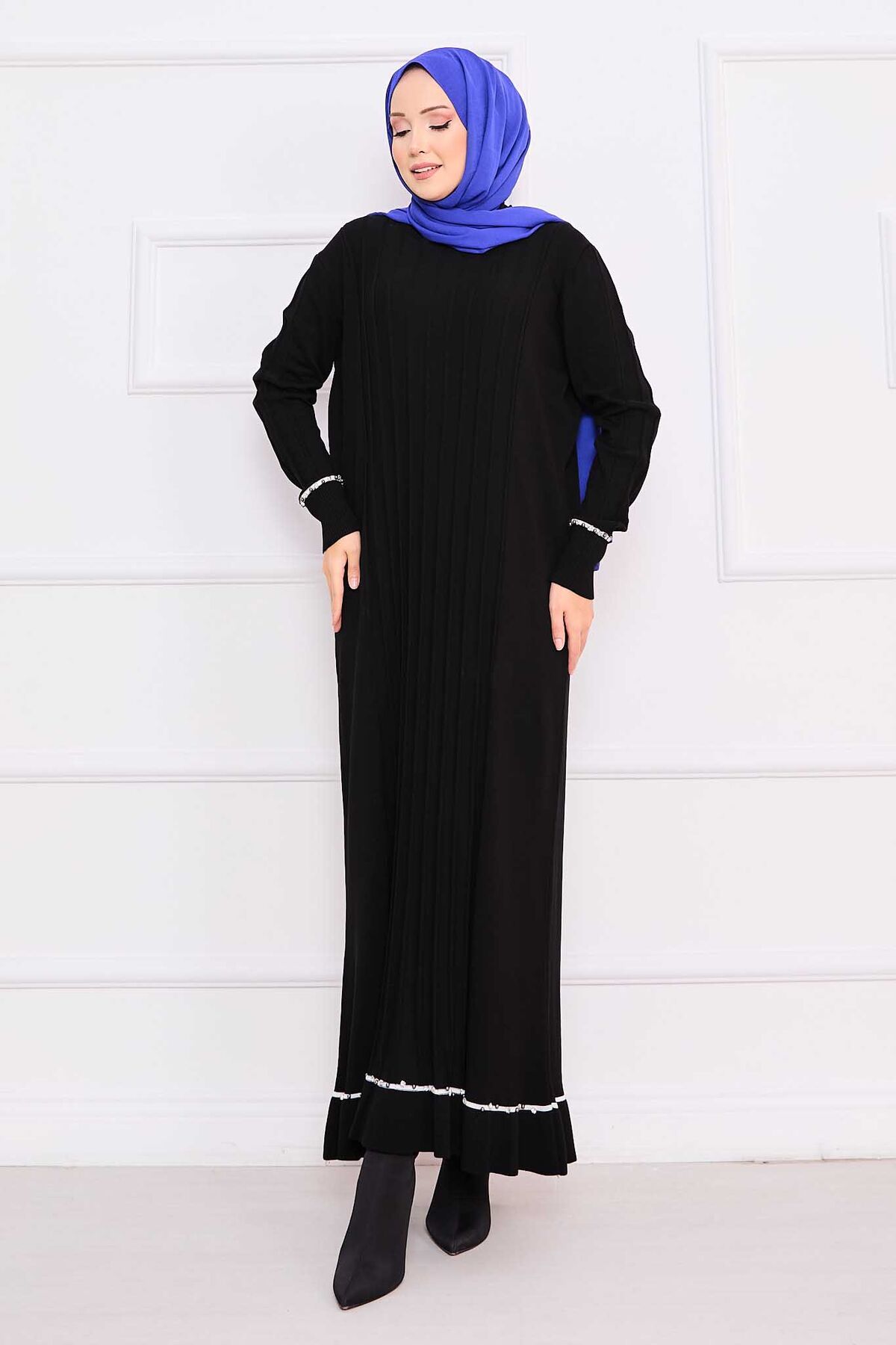 Manşeti Ve Eteği Taş İşlemeli Tesettür Triko Elbise Siyah