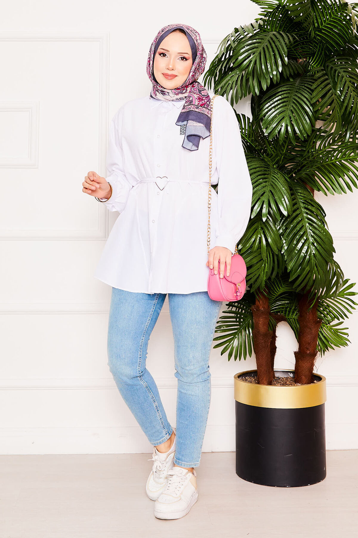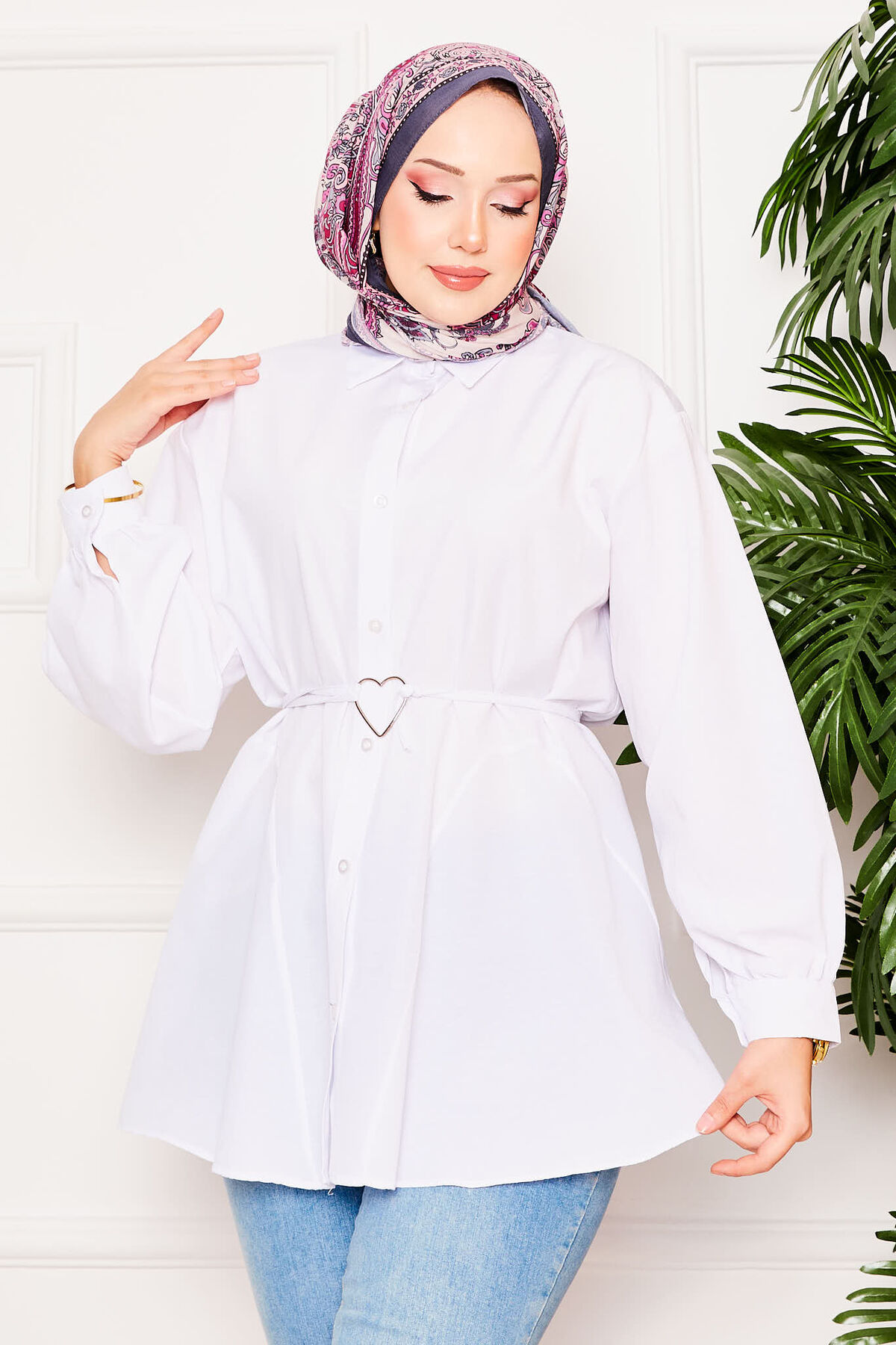 Metal Kalp Figürüyle Bağcıklı Terikoton Gömlek Tunik Beyaz
