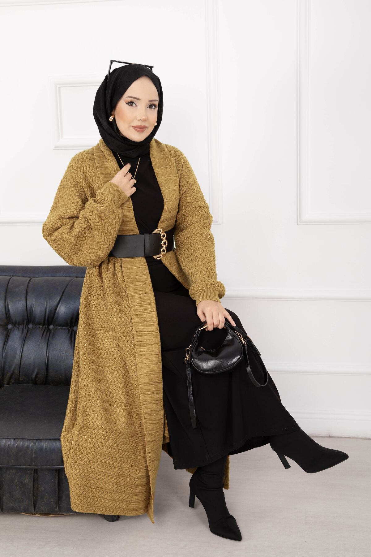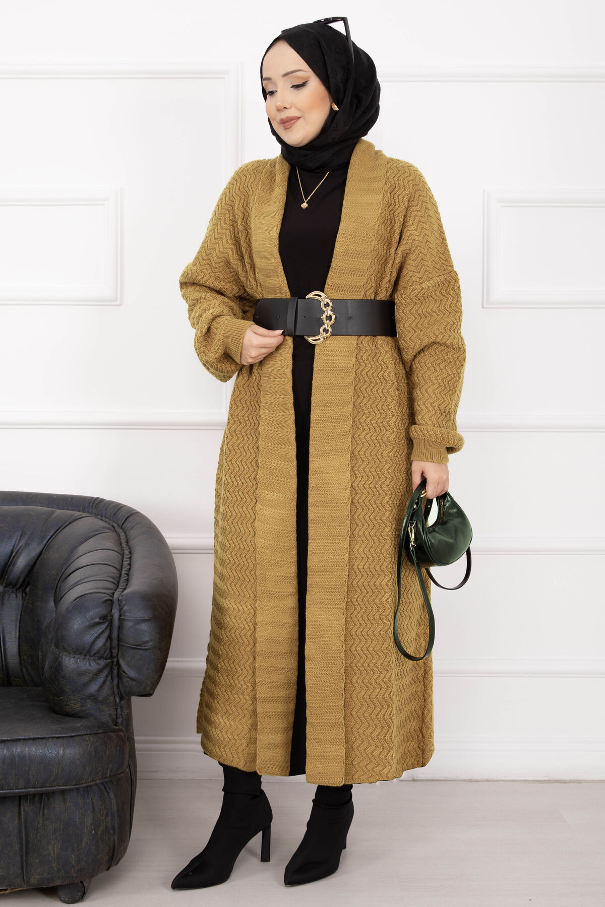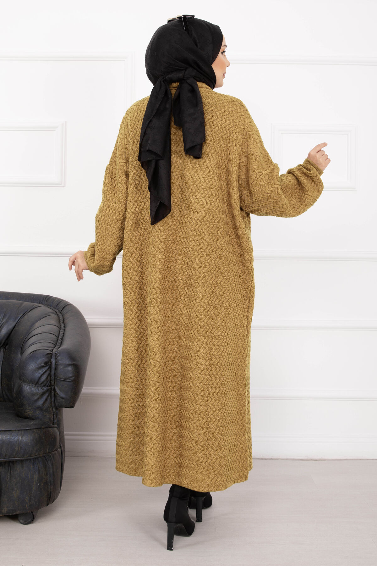 Mina Şal Yaka Uzun Triko Hırka Hardal