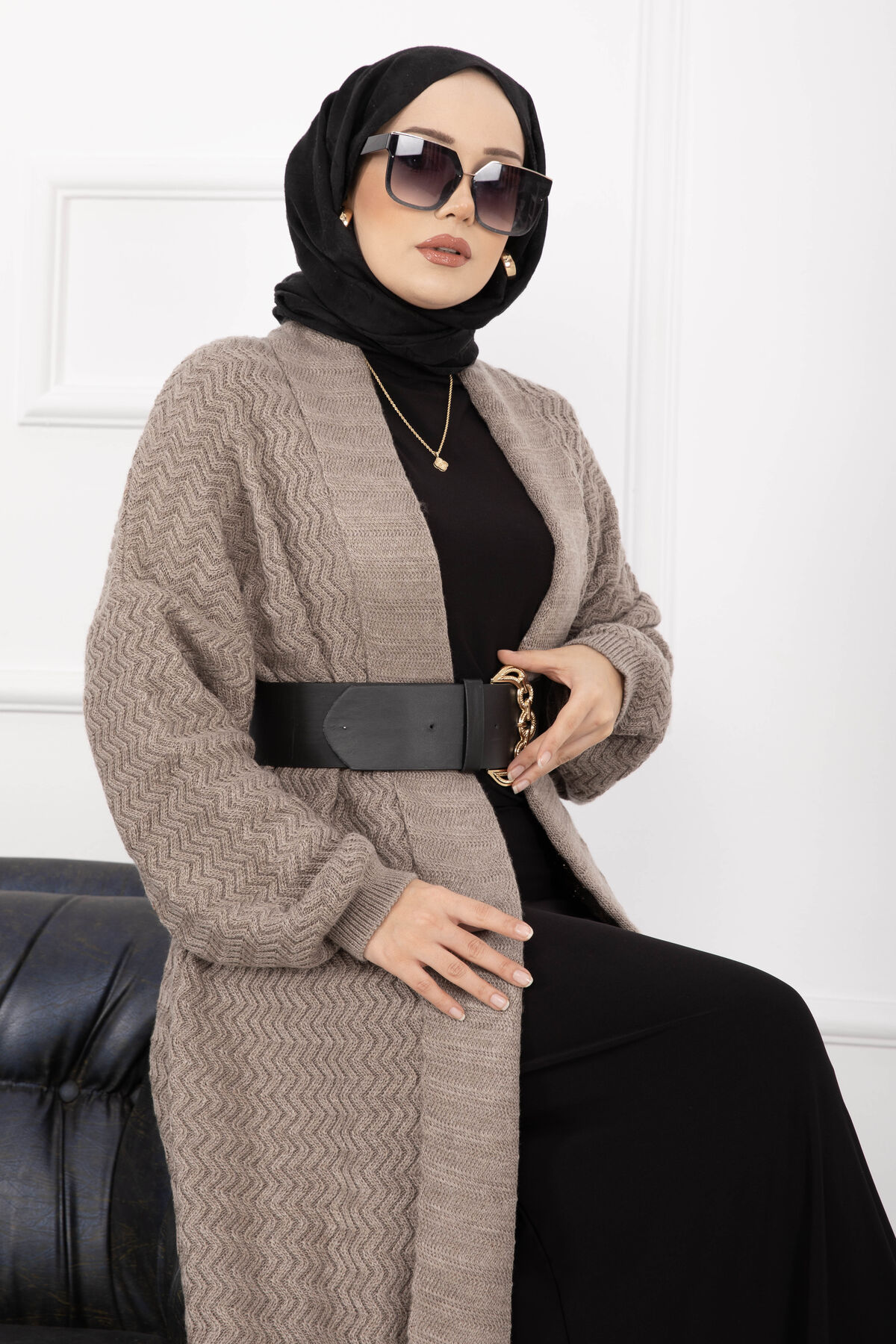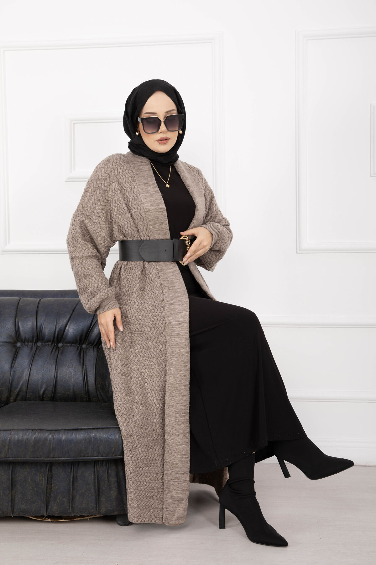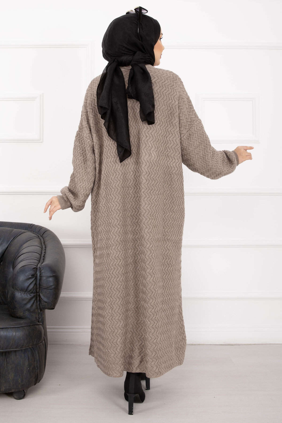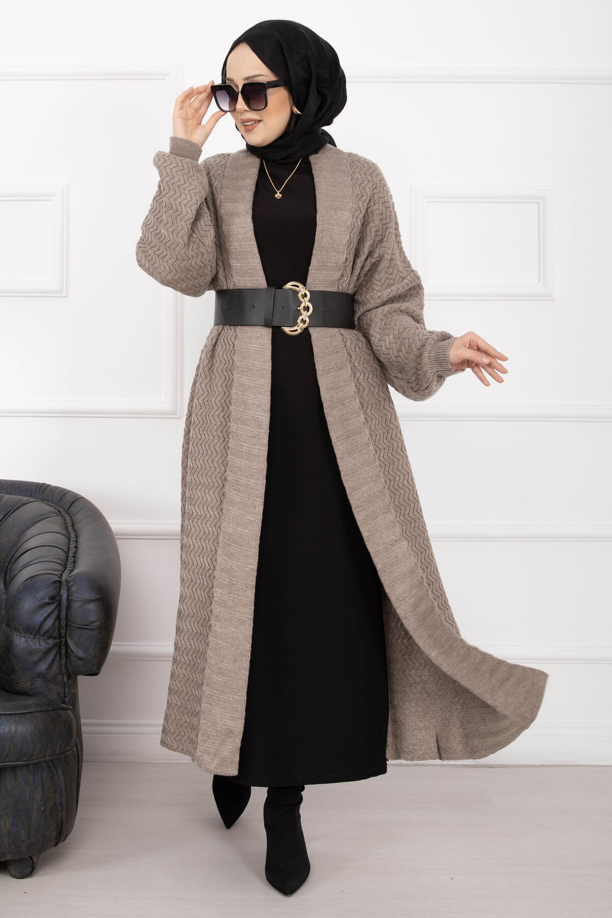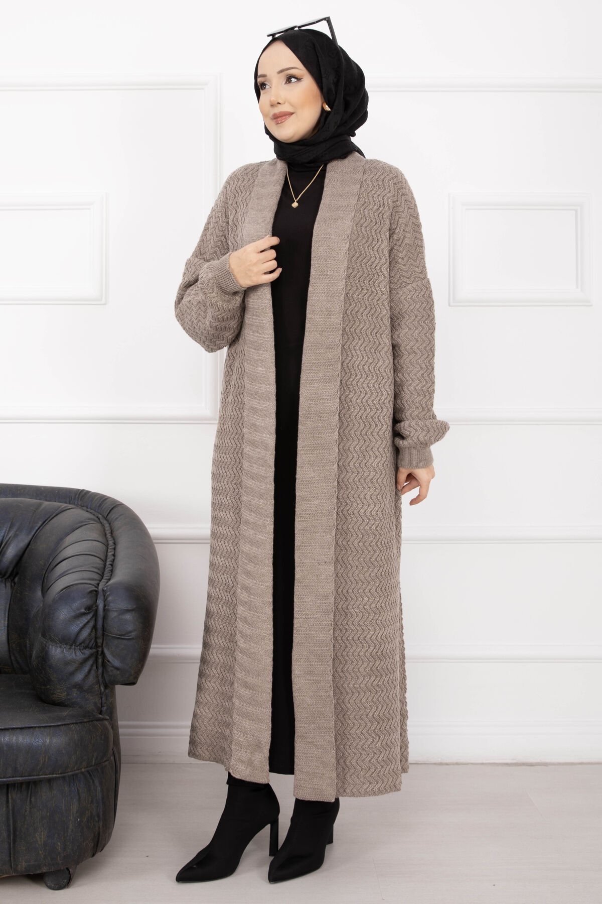 Mina Şal Yaka Uzun Triko Hırka Vizon