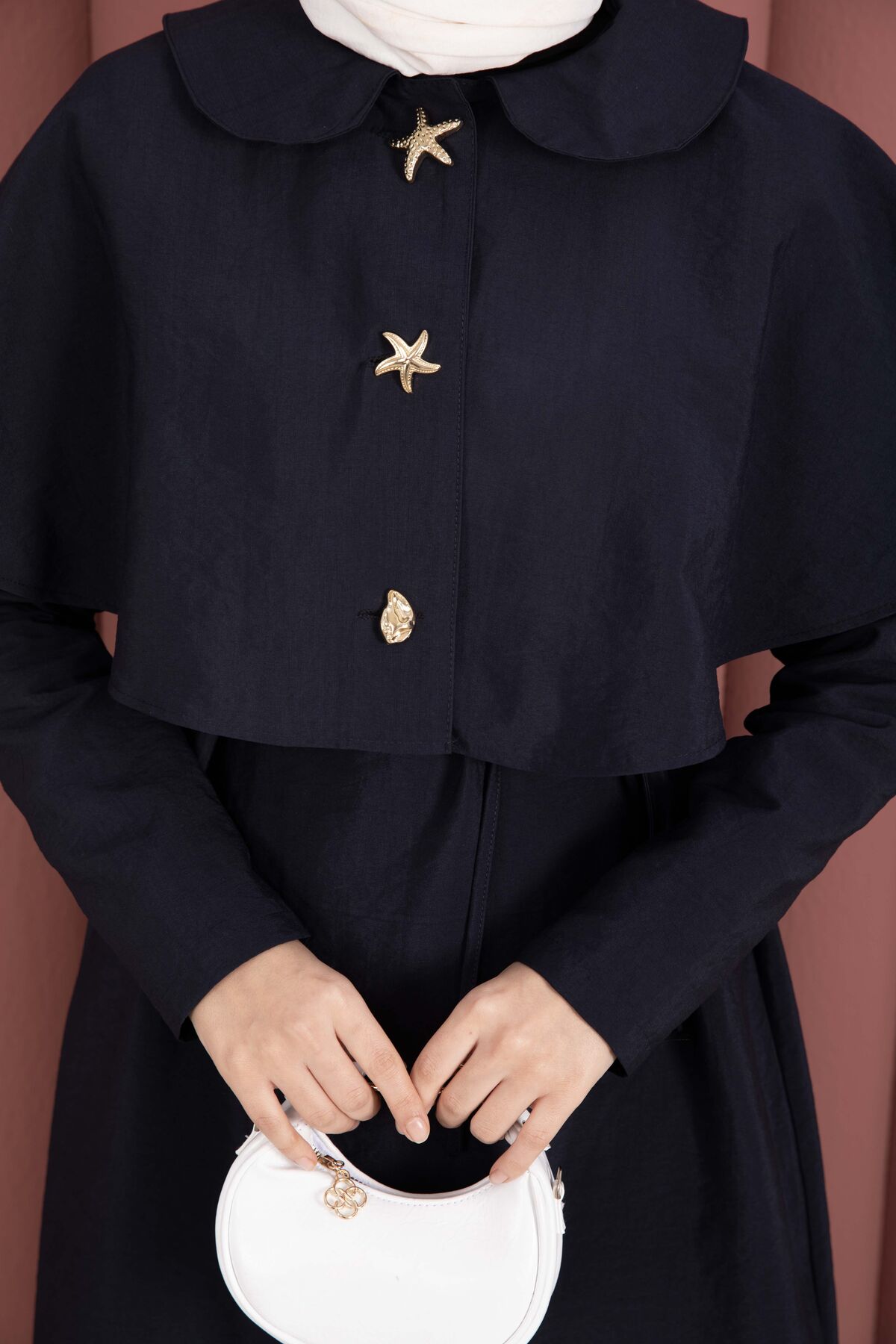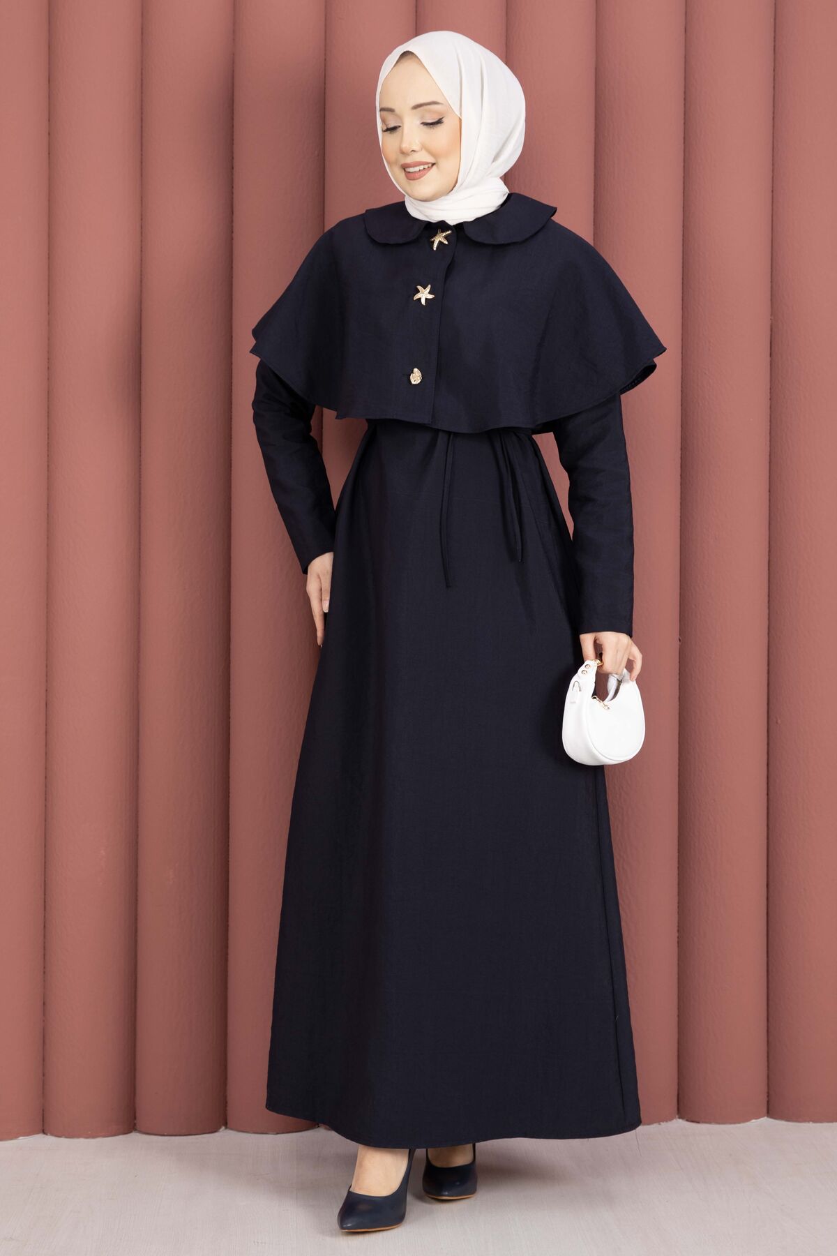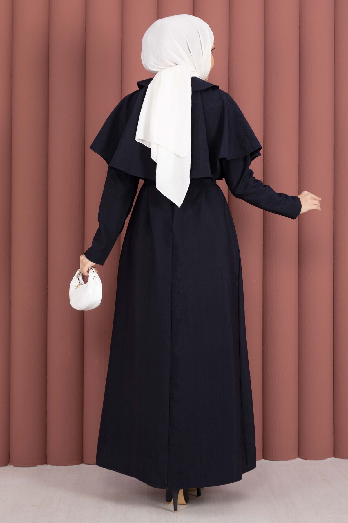 Minimal Pelerin Detaylı Bağcıklı Elbise Lacivert