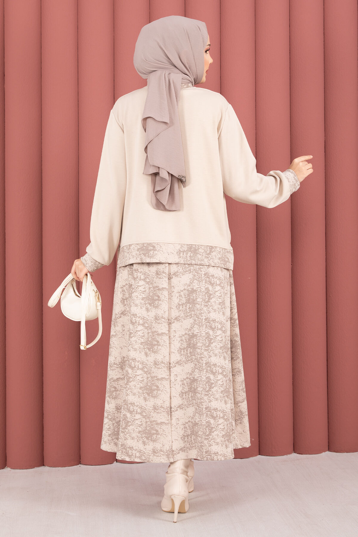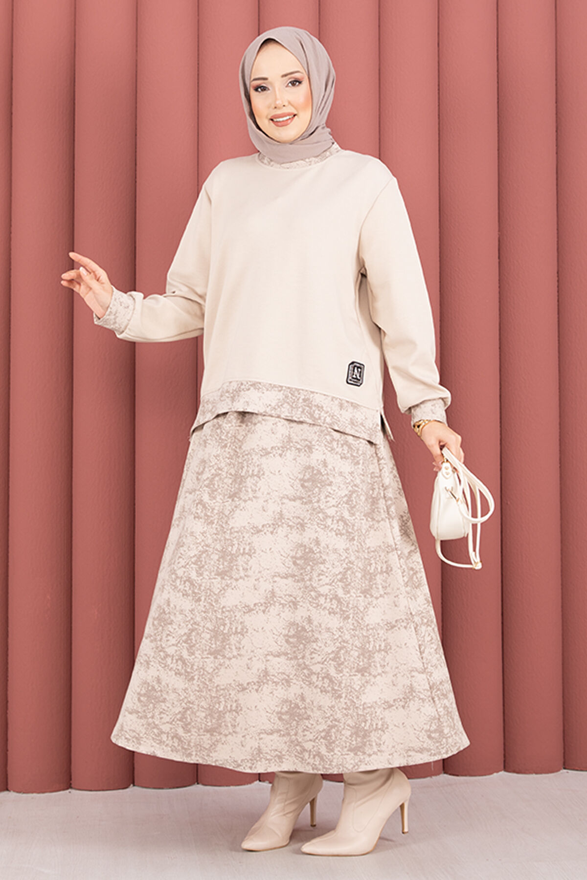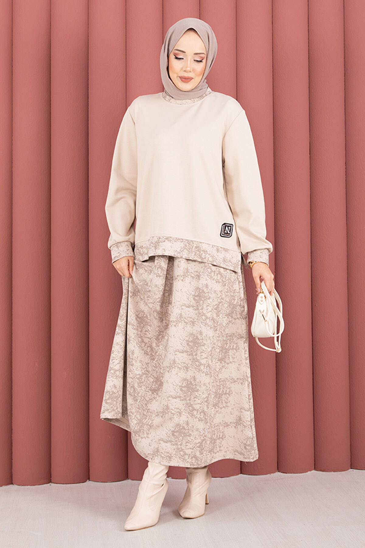 Modern Desen Garnili Tesettür Etekli Takım Bej